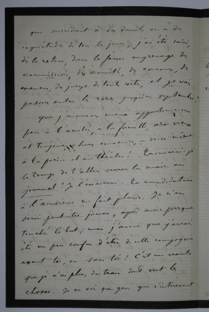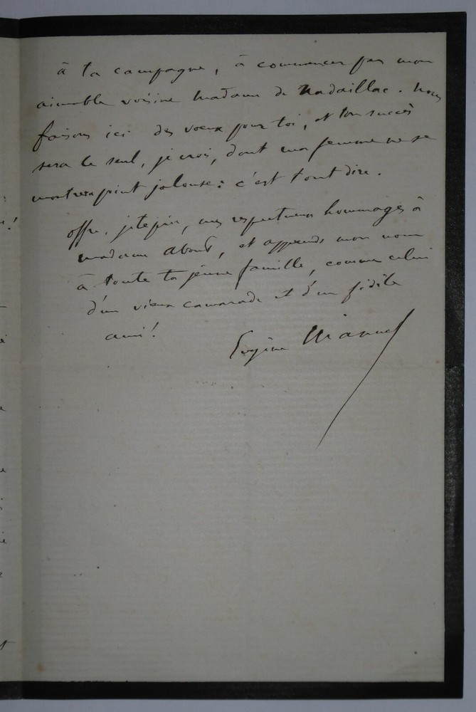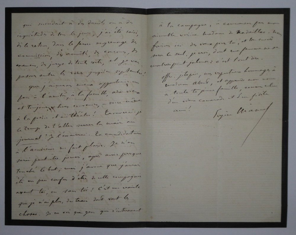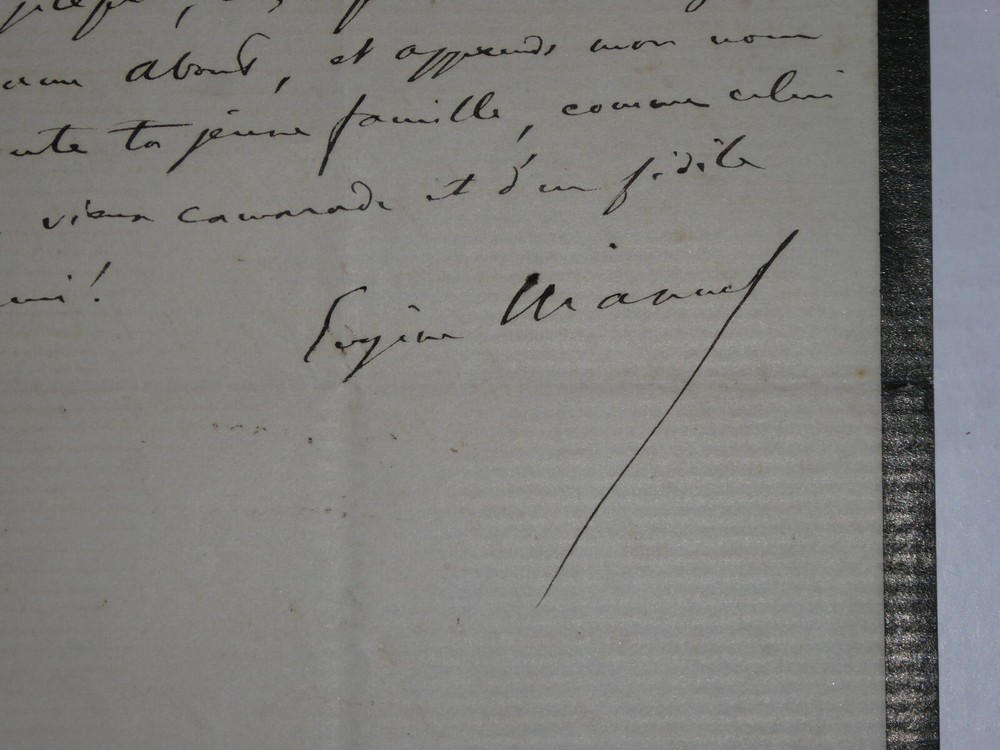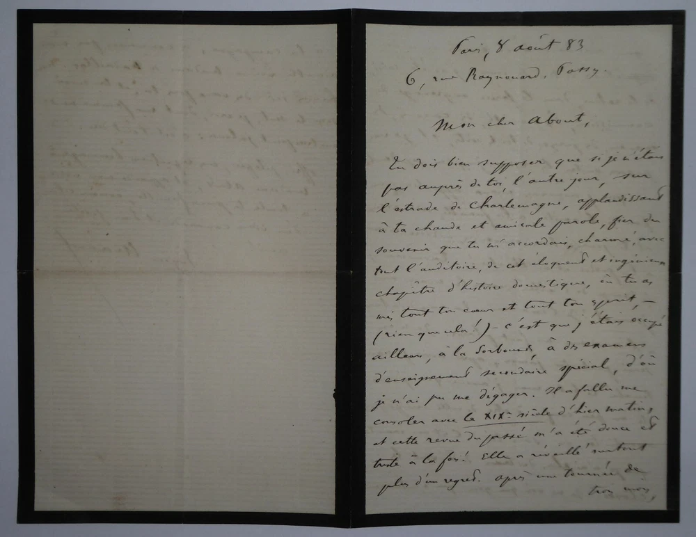 Eugène MANUEL. Lettre autographe signée et datée du 8 août 1883, Passy. Lettre en une page sur papier de deuil à bordereau noir fin adressée à Edmond About à propos d'un discours déclamé par ce dernier où il était fait mention de l'auteur. Il n'avait malheureusement pas pu assister à ce discours car il était pris à la Sorbonne où il passait des examens d'enseignement secondaire. Il discute ensuite du temps qui passe et de projets. Dimensions : 12 x 18.5 cm. 3 pages. Etat : Bon état de conservation. Eugène Manuel, né le 13 juillet 1823 à Paris où il est mort le 1ᵉʳ juin 1901 dans le 16ᵉ arrondissement, est un poète, professeur et homme politique français. Wikipédia Edmond François Valentin About, né le 14 février 1828 à Dieuze et mort le 16 janvier 1885 à Paris 9ᵉ, est un écrivain, journaliste et critique d'art français, membre de l’Académie française. Wikipédia Envoi soigné dans un emballage rigide et étanche. Satisfait ou remboursé. Si vous n'êtes pas entièrement satisfait, je reprends la marchandise avec retour à ma charge pour l'Europe et à la charge de l'acheteur pour le reste du monde. N’hésitez pas à visiter ma boutique et affiner vos recherches en fonction des catégories qui vous intéressent. Ma boutique L'Art Délivré. Lettres autographes, vieux papiers, livres anciens, photographies, gravures, timbres… Nous expertisons et/ou rachetons dans toute la France vos lettres, collections de lettres et livres anciens. Merci de votre visite. Jérôme KAYSER. Lettre en une page sur papier de deuil à bordereau noir fin adressée à Edmond About à propos d'un discours déclamé par ce dernier où il était fait mention de l'auteur. Il n'avait malheureusement pas pu assister à ce discours car il était pris à la Sorbonne où il passait des examens d'enseignement secondaire. Il discute ensuite du temps qui passe et de projets. Eugène Manuel, né le 13 juillet 1823 à Paris où il est mort le 1ᵉʳ juin 1901 dans le 16ᵉ arrondissement, est un poète, professeur et homme politique français. Wikipédia Edmond François Valentin About, né le 14 février 1828 à Dieuze et mort le 16 janvier 1885 à Paris 9ᵉ, est un écrivain, journaliste et critique d'art français, membre de l’Académie française. Wikipédia Satisfait ou remboursé. Si vous n'êtes pas entièrement satisfait, j