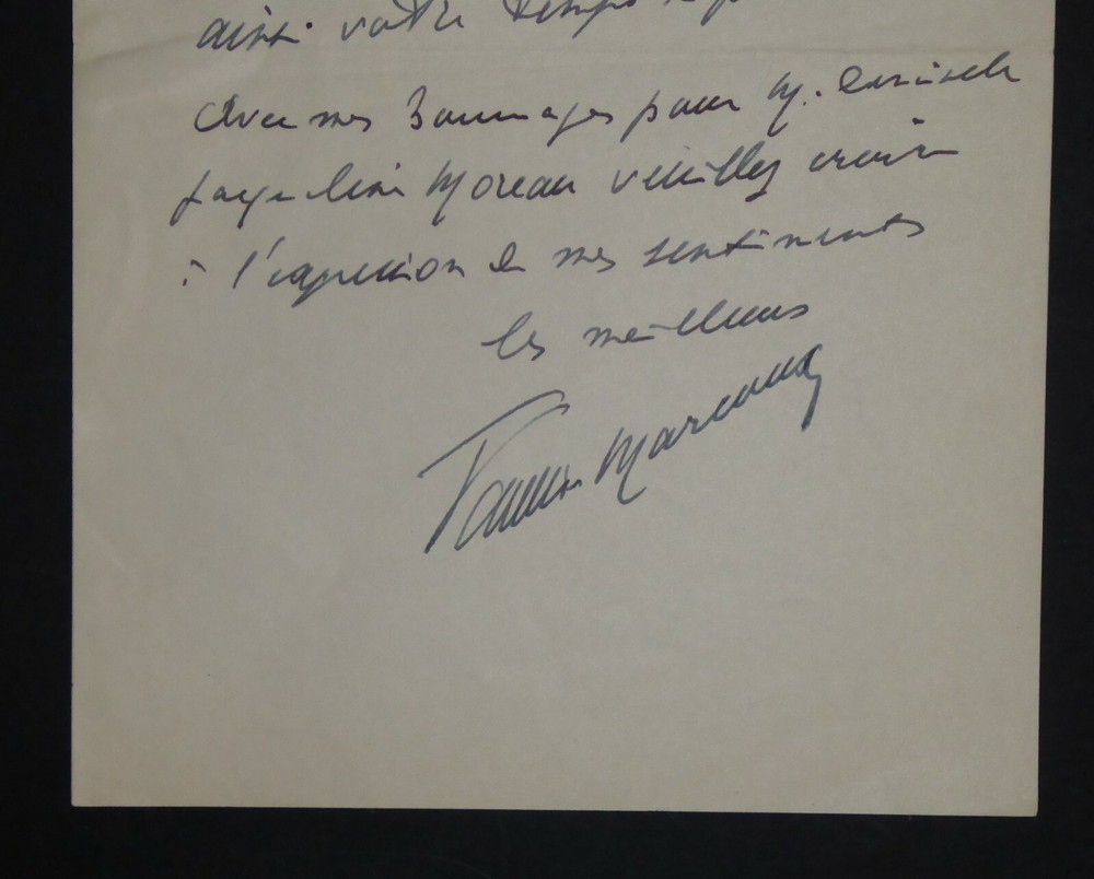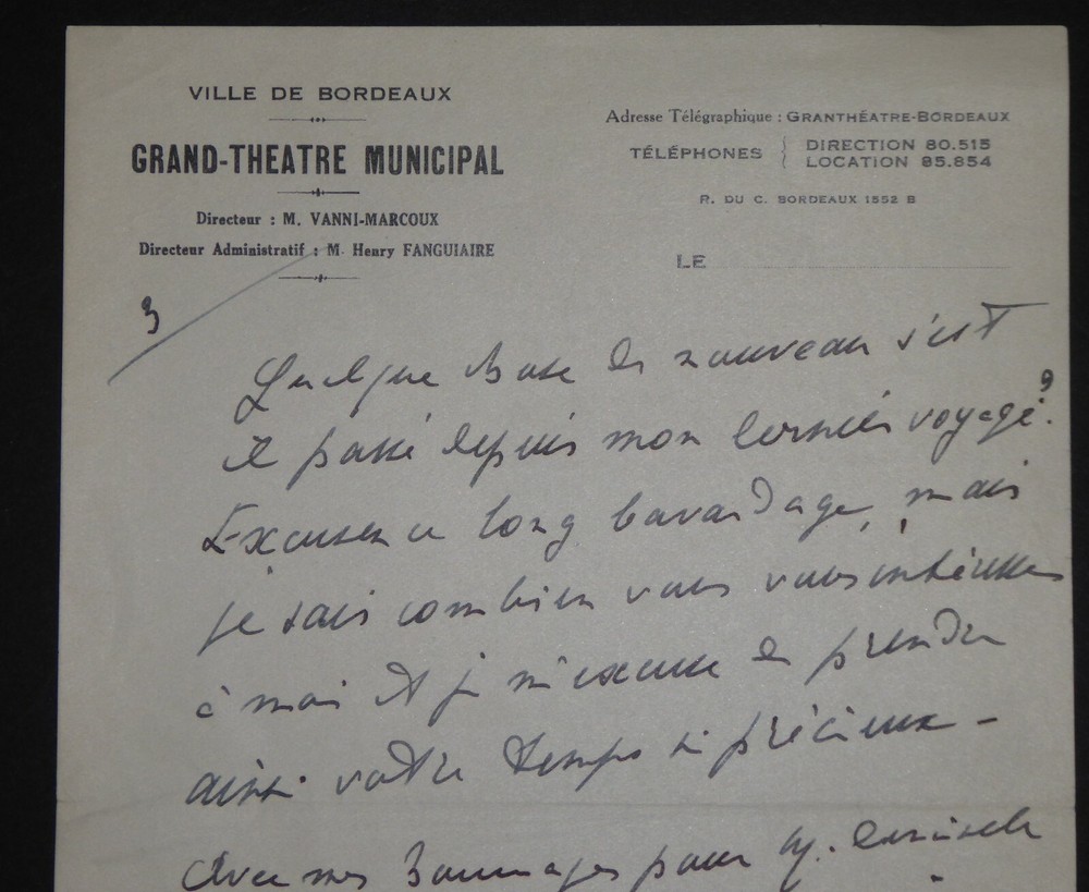 Giovanni "Vanni" MARCOUX. Lettre autographe signée, Bordeaux. Lettre d'une page sur papier à en-tête du "Grand Théâtre Municipal de la ville de Bordeaux" et "Directeur VANNI-MARCOUX" adressée à une connaissance à propos de son dernier voyage. Il s'excuse cependant "du bavardage" et ajoute qu'il sait "combien vous vous intéressez à moi et je m'excuse de prendre ainsi votre temps si précieux". Dimensions : 13.5 x 21 cm. 1 page. Etat : Bon état de conservation. Giovanni « Vanni » Emilio Diogenio Marcoux, né le 12 juin 1877 à Turin et mort le 22 octobre 1962 à Paris, est un chanteur d'opéra, metteur en scène et pédagogue français, occasionnellement acteur. Wikipédia Envoi soigné dans un emballage rigide et étanche. N’hésitez pas à visiter ma boutique et affiner vos recherches en fonction des catégories qui vous intéressent. Ma boutique L'Art Délivré. Lettres autographes, vieux papiers, livres anciens, photographies, gravures, timbres… Nous expertisons et/ou rachetons dans toute la France vos lettres, collections de lettres et livres anciens. Merci de votre visite. Jérôme KAYSER. Lettre d'une page sur papier à en-tête du "Grand Théâtre Municipal de la ville de Bordeaux" et "Directeur VANNI-MARCOUX" adressée à une connaissance à propos de son dernier voyage. Il s'excuse cependant "du bavardage" et ajoute qu'il sait "combien vous vous intéressez à moi et je m'excuse de prendre ainsi votre temps si précieux". Giovanni « Vanni » Emilio Diogenio Marcoux, né le 12 juin 1877 à Turin et mort le 22 octobre 1962 à Paris, est un chanteur d'opéra, metteur en scène et pédagogue français, occasionnellement acteur. Wikipédia N’hésitez pas à visiter ma boutique et affiner vos recherches en fonction des catégories qui vous intéressent. Ma boutique Lettres autographes, vieux papiers, livres anciens, photographies, gravures, timbres… Nous expertisons et/ou rachetons dans toute la Fra