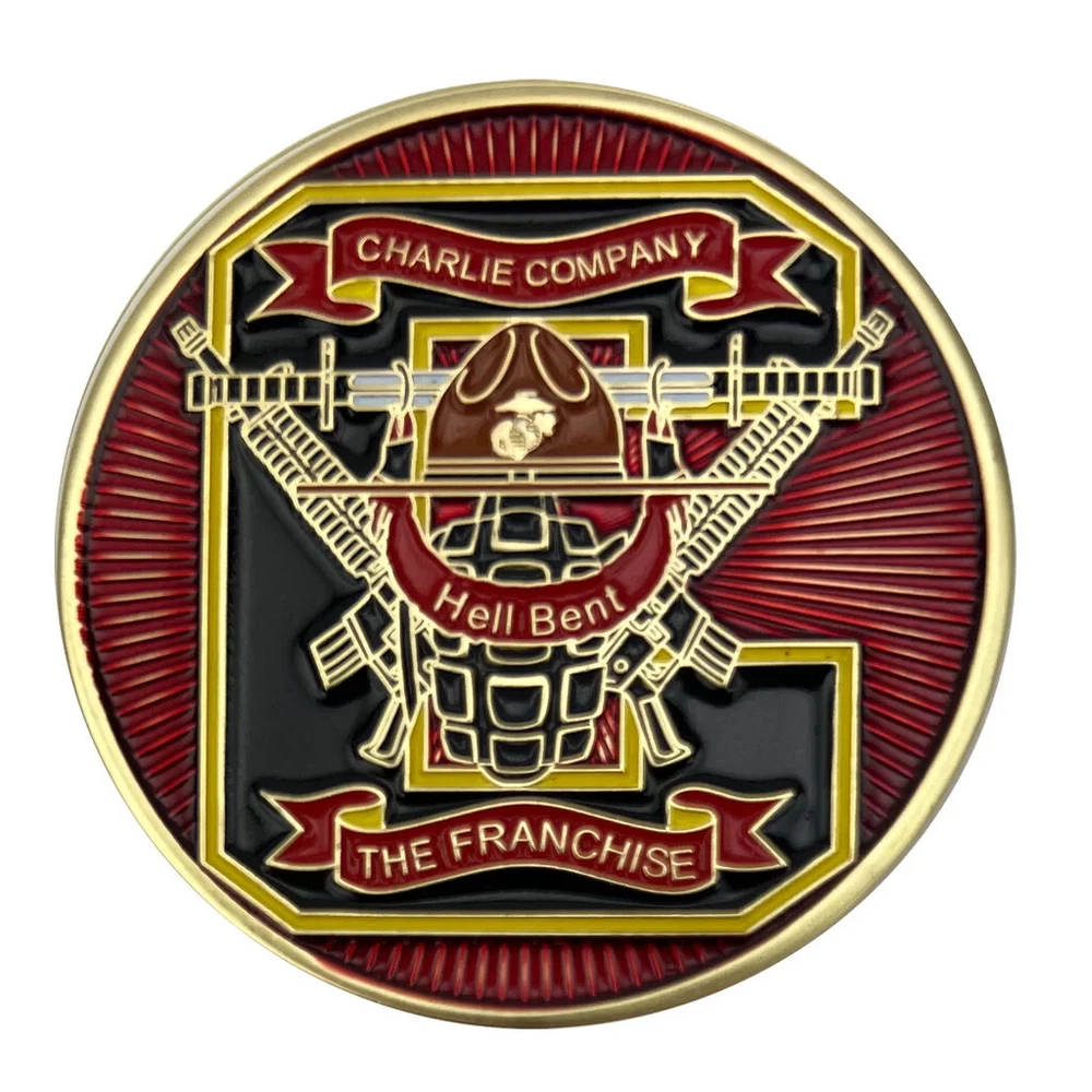 This 2" challenge coin commemorates the Marine Corps Recruit Depot (MCRD) in San Diego, specifically Charlie Company's 1st recruit. The coin is a collectible item representing current military memorabilia and belongs to the category of challenge coins and militaria.