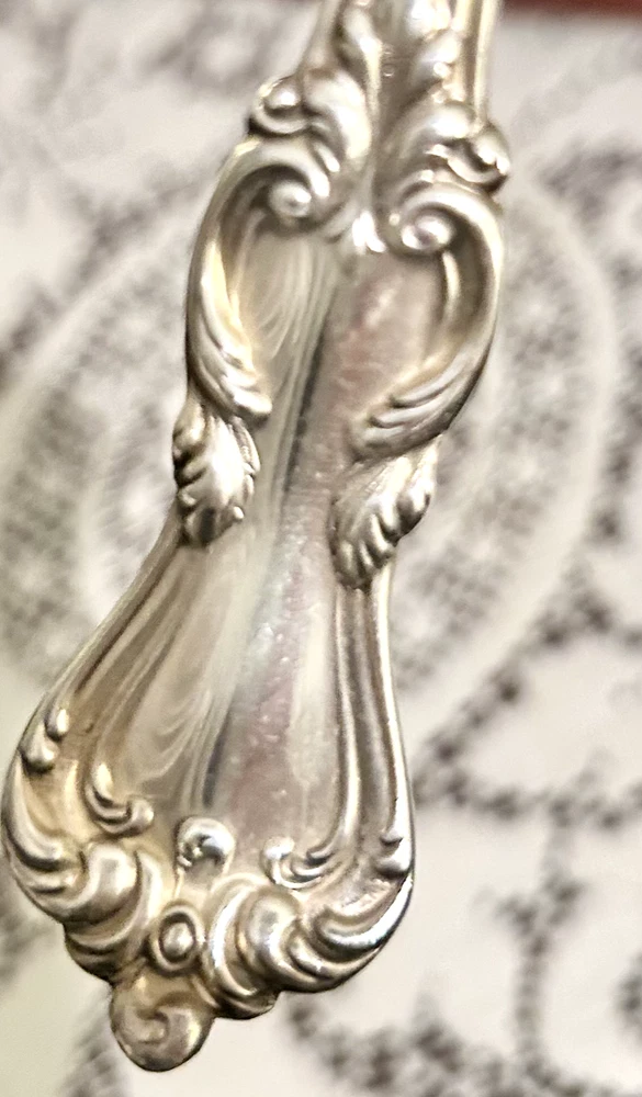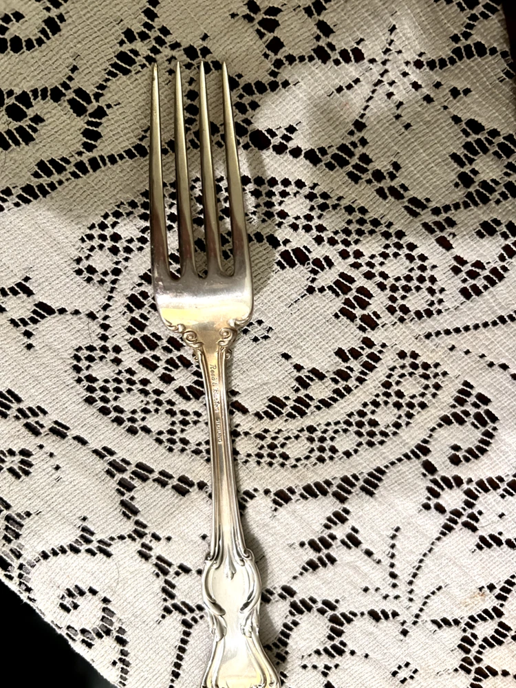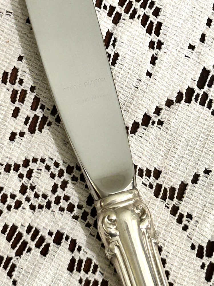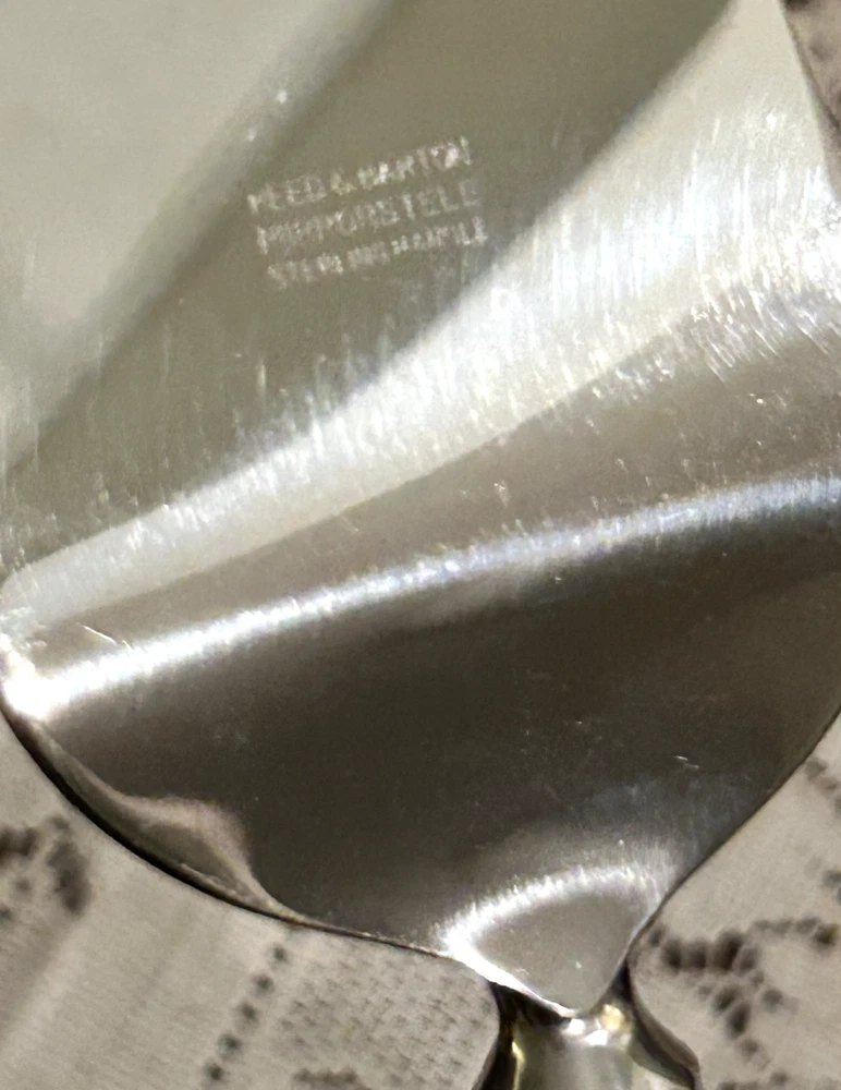 This gorgeous, classic set of Reed and Barton sterling silver flatware will lend elegance to any occasion. It was passed down to the seller from her grandparents. There may be signs of very minor wear on some pieces because they were used for special family occasions, but everything is in excellent condition. Polished and not monogrammed. The set includes: --12 Dinner Forks --12 Dinner Knives (blades are Mirrorstele; handles are sterling) --12 Salad Forks --12 Teaspoons --12 Soup Spoons --12 Hollow-Handle Steak Knives (stainless steel blades; WEB sterling handles) --1 Serving Spoon (8.5") --1 Serving Fork (8") --1 Shell Sugar Spoon --1 Butter Knife (Mirrorstele blade with sterling handle) --1 Cake Server (Mirrorstele with sterling handle) The included case is not the original, and will not hold the steak knives. Each piece will be individually wrapped. Non-returnable. Please contact seller with questions before purchase. Shipping $28 within U.S.
