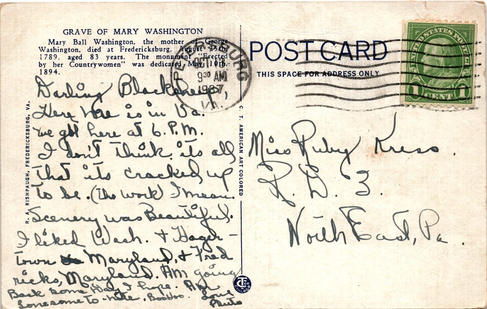 MAKE AN OFFER. THE MORE YOU BUY THE BETTER DEAL I WILL ACCEPT The postcard features a monument marking the burial place of Mary Washington, the mother of George Washington, in Fredericksburg, Virginia. Mary Ball Washington died in 1789 at the age of 83. The monument was erected by her countrywomen and dedicated on March 10, 1894.