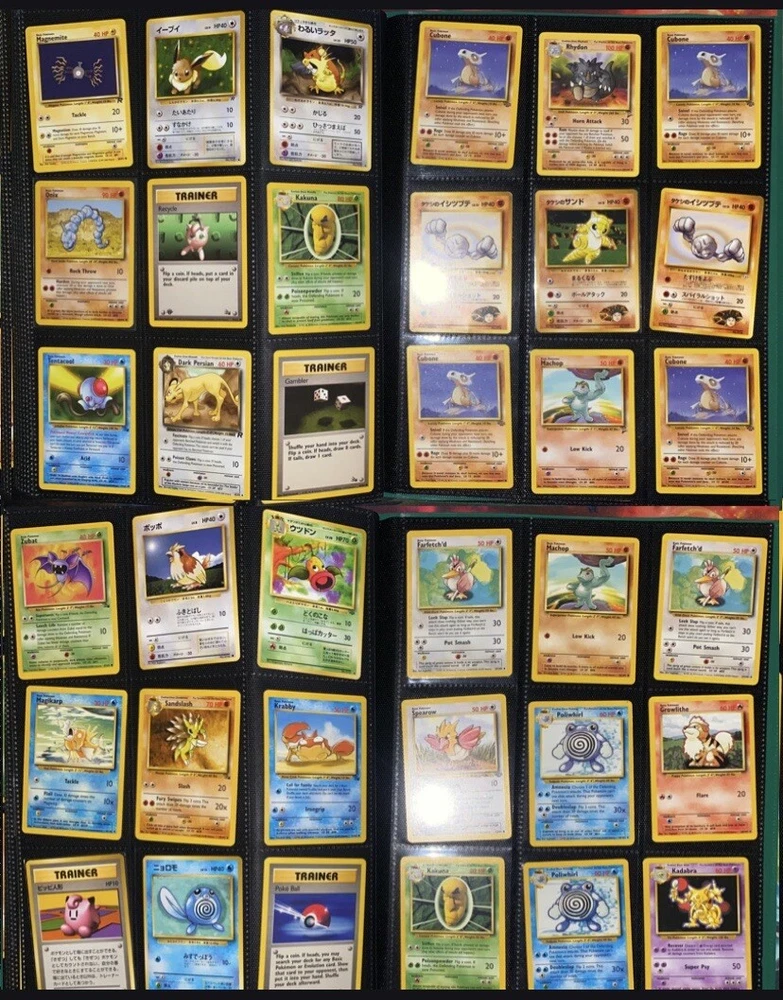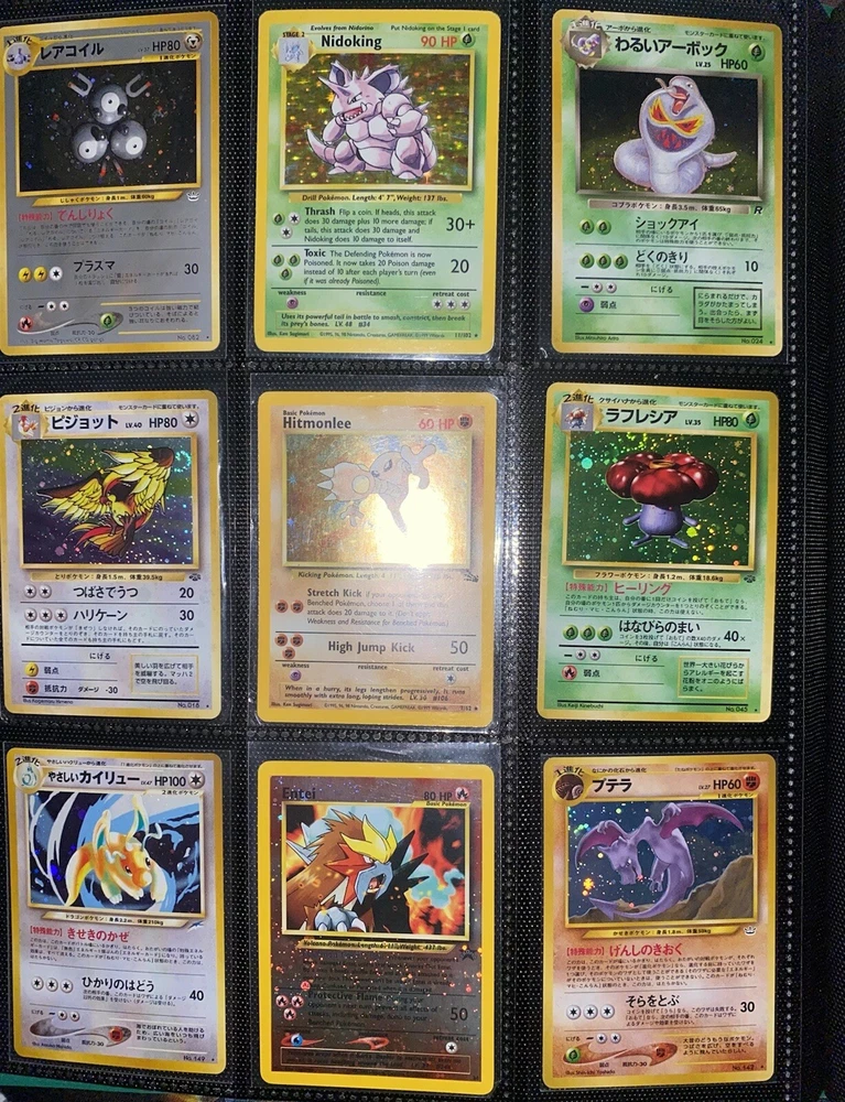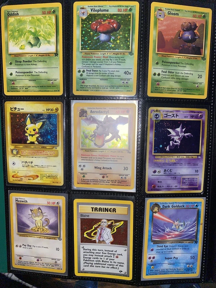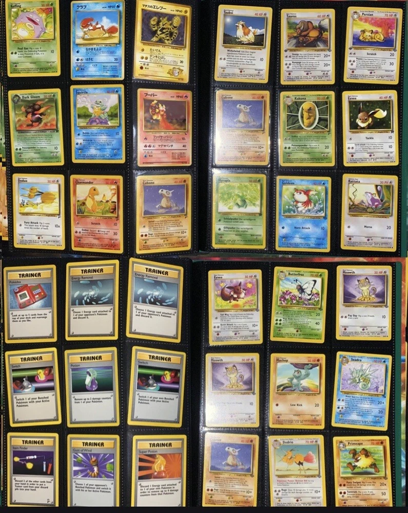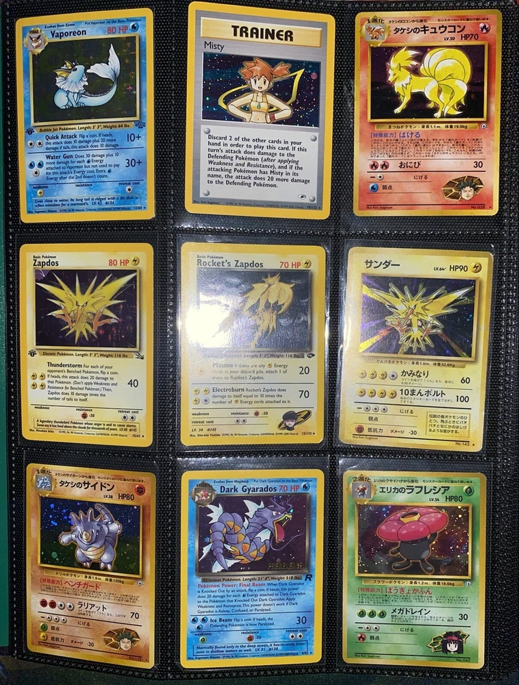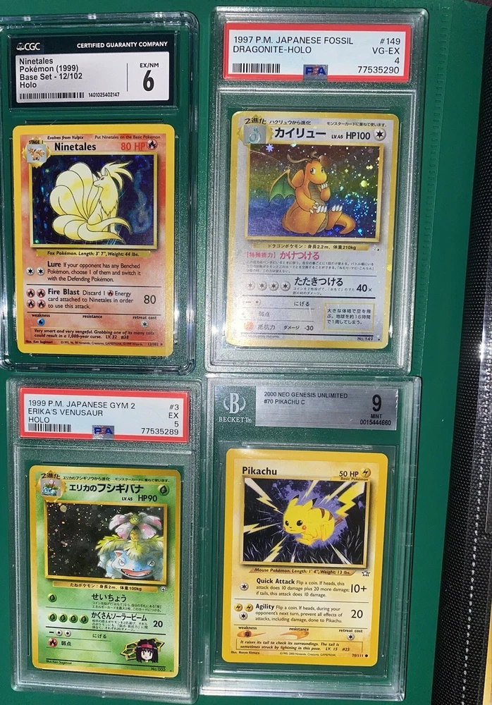 This offering is a massive lot of 360 vintage Pokémon cards, featuring a variety of sets including Base Set 1st Editions and more. The collection includes cards in Standard and Japanese sizes. Among the characters featured are Zapdos, Charmander, Dragonite, Venusuar and more. Manufactured in 1999 by Wizards of the Coast and Nintendo in the United States, these cards have a vintage appeal and include unique features like being Shadowless or 1st edition and having a Holo finish. Ideal for Pokémon TCG enthusiasts and collectors, this lot offers a diverse selection of classic cards from the early days of the game. 360 card binder plus 4 graded cards Graded cards - PSA 6 Base Set Ninetails PSA 4 Japanese Fossil Dragonite w/ a light holo bleed PSA 5 Japanese Gym Series Erika’s Venusuar Holo PSA 9 Pikachu Neo Genesis Some of the binder rares - 1st Ed Jungle Vaporeon 1st Ed Fossil Zapdos with missing holo error Prerelease Dark Gyarados Light Dragonite with a Swirl Rockets Zapdos and Base Set Zapdos Fossil Haunter with a Swirl and Aerodactyl Holo Erikas Vileplume Brock’s Ninetails and Rhydon Neo Meganium, Feraligatr & Typhlosion And many other big cards. Non Holo cards range from Base set to Neo and a few 1st editions are included. There are a few duplicates among the non holos. Message me with any questions. Happy Hunting