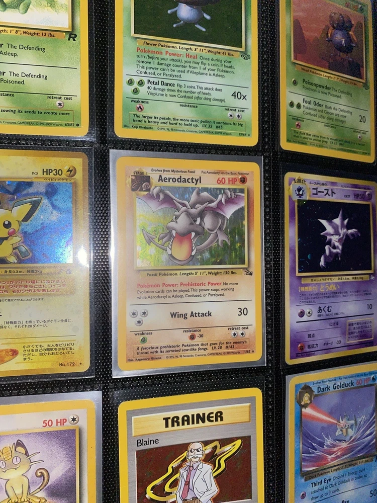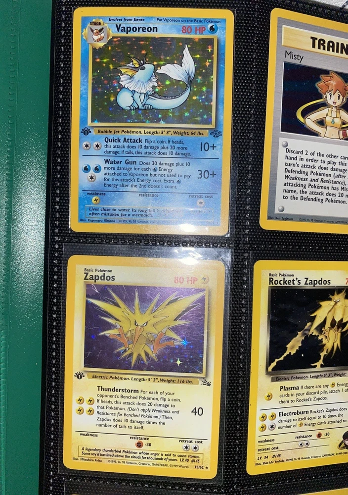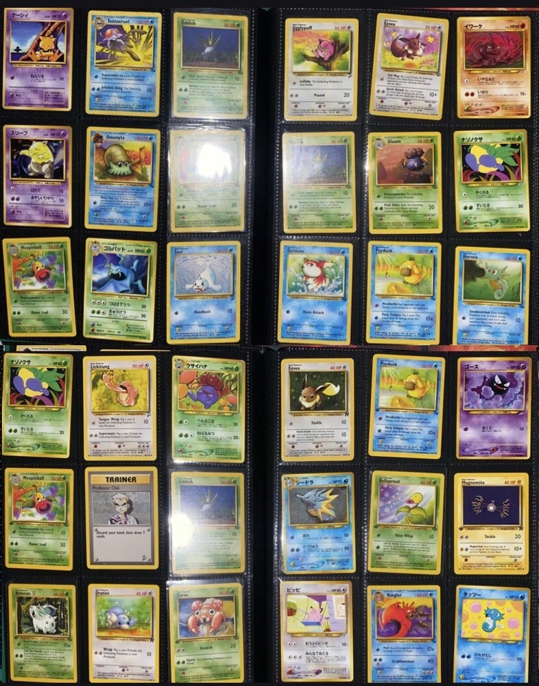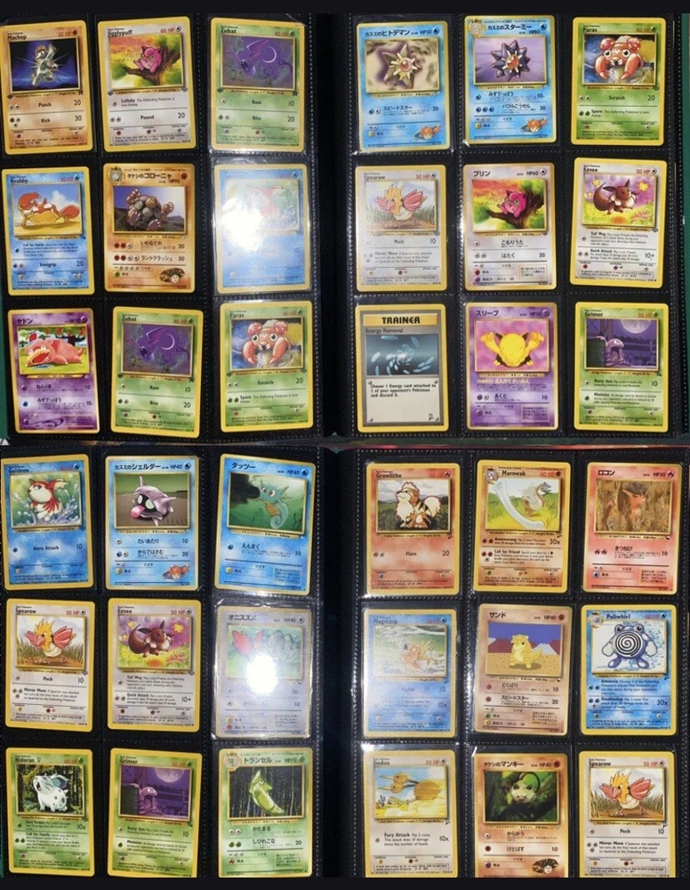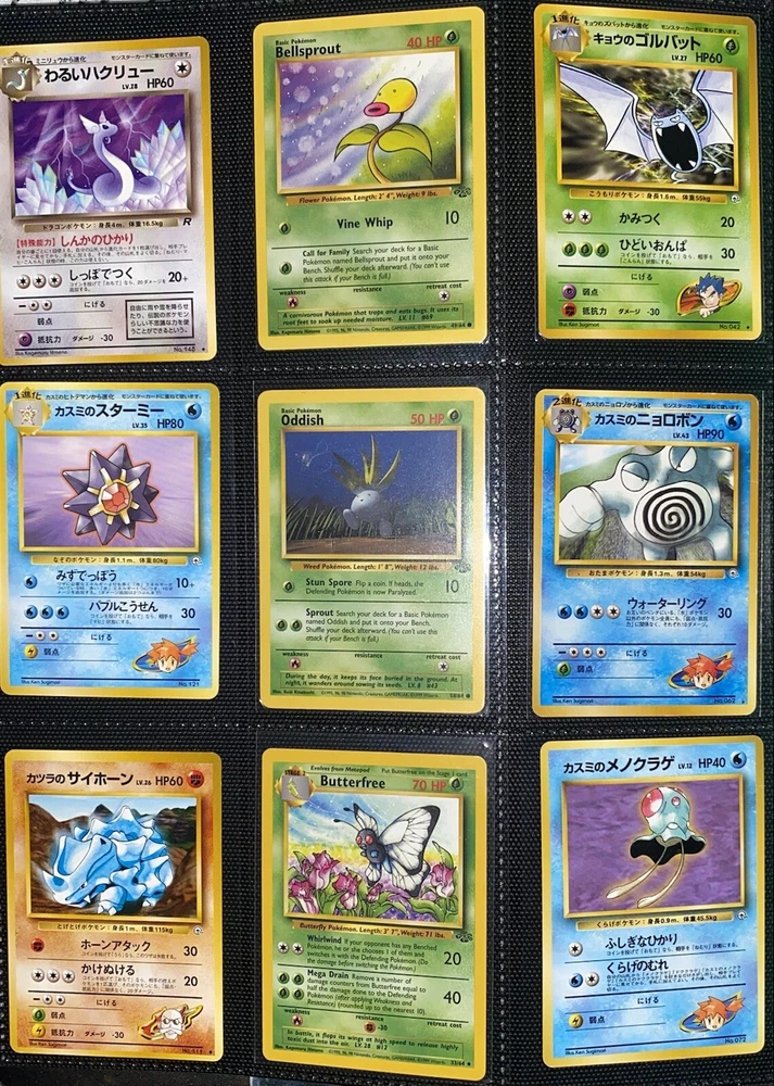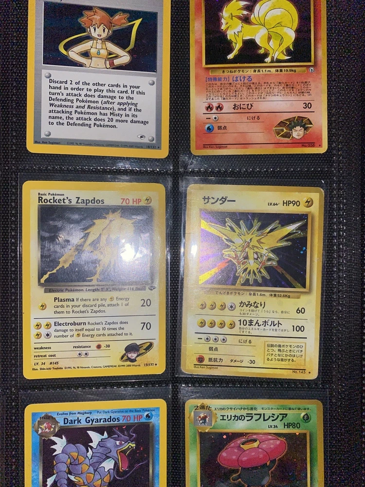 This offering is a massive lot of 360 vintage Pokémon cards, featuring a variety of sets including Base Set 1st Editions and more. The collection includes cards in Standard and Japanese sizes. Among the characters featured are Zapdos, Charmander, Dragonite, Venusuar and more. Manufactured in 1999 by Wizards of the Coast and Nintendo in the United States, these cards have a vintage appeal and include unique features like being Shadowless or 1st edition and having a Holo finish. Ideal for Pokémon TCG enthusiasts and collectors, this lot offers a diverse selection of classic cards from the early days of the game. 360 card binder plus 4 graded cards Graded cards - PSA 6 Base Set Ninetails PSA 4 Japanese Fossil Dragonite w/ a light holo bleed PSA 5 Japanese Gym Series Erika’s Venusuar Holo PSA 9 Pikachu Neo Genesis Some of the binder rares - 1st Ed Jungle Vaporeon 1st Ed Fossil Zapdos with missing holo error Prerelease Dark Gyarados Light Dragonite with a Swirl Rockets Zapdos and Base Set Zapdos Fossil Haunter with a Swirl and Aerodactyl Holo Erikas Vileplume Brock’s Ninetails and Rhydon Neo Meganium, Feraligatr & Typhlosion And many other big cards. Non Holo cards range from Base set to Neo and a few 1st editions are included. There are a few duplicates among the non holos. Message me with any questions. Happy Hunting