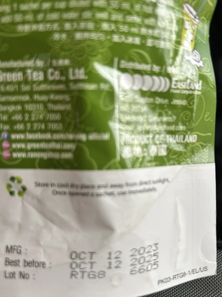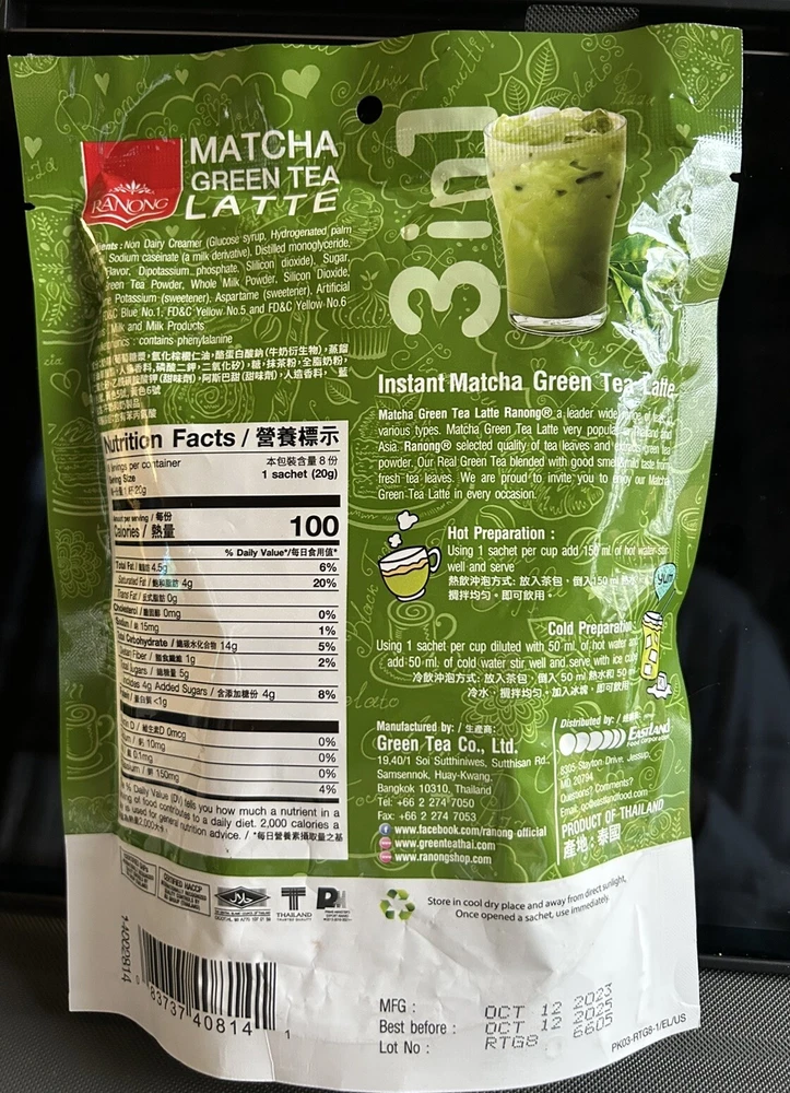 Product Name: Matcha Green Tea Latte Type: Green Calories per 100 g/mL: See Photos UPC: 0083737408141 Country/Region of Manufacture: Thailand Form: Powder Number in Pack: 8 Food Aisle: Pantry Number of Servings: 8 gtin13: 0083737408141 Brand: Ranong Product: Tea & Infusion Expiration Date: 10/12/25