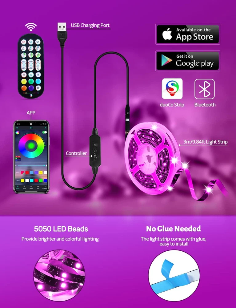 MATICOD LED Lights for TV Led Backlight, 9.84ft RGB Led Strip Lights USB TV TV, [ MUSIC SYNC TV LED BACKLIGHT ] ??? Do you want a tv led lights that sync with tv? Look here, our tv led backlight within a built-in high-sensitivity microphone. Open the microphone mode through our APP, the tv led backlight will automatically change with surrounding sounds. No matter if you want to listen to a relaxing song or watch an exciting movie, our tv led backlight will be the best atmosphere creator! [ 3 WAYS CONTROLL YOUR TV LED BACKLIGHT ] - We provide three methods to control the led lights for tv, including Bluetooth app control/21-key remote control/3-key controller control. Allows you to choose the fastest and most convenient way to adjust the led lights for tv anytime, anywhere. Start DIYing your mood lighting now! [ SMART APP BLUETOOTH TV LED LIGHTS ] - Use a smart, simple way to control your tv led lights. Download the free APP "duoCo Strip" in the Apple Store or Google play, then connect the tv led lights to usb power and turn on Bluetooth. The immersion tv led lights will automatically connect and display in the device list on the far left of the APP. Offers over 16 million colors and 21+ dynamic modes, music mode, timing mode, mic mode. [ AMBIENT LED LIGHTS FOR TV] - MATICOD led lights for tv is suitable for various places and atmospheres. A bright led lights for tv can provide a good viewing experience in the dark and relieve the visual fatigue caused by the dim space. Variety of color and dynamic options make tv lights the perfect atmosphere maker. Can be a novelty gifts for your family, friends, loved ones! [ EASY TO INSTALL RGB 5050 LED LIGHTS FOR TV ] - Latest 5050 model LED lamp beads can provide brighter and colorful lighting effects and more diverse dynamic change modes. After tearing off the protective paper on the back of the tv lights, you can stick it on any smooth and dry and clean surface. Very easy and fast. If you have any questions, please contact us, we will reply within 24 hours.