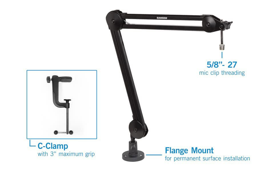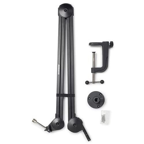The MBA38 Microphone Boom Arm is a highly-adjustable microphone desktop stand perfect for any radio, podcast, broadcast, or streaming setup. The MBA38 provides 38” of horizontal/vertical arm reach and gives users flexibility to achieve optimal microphone placement. The silent rotating design features internal springs that allow for quiet and effortless positioning that eliminates excess noise in the recording environment. With two mounting options included, the MBA38 can be attached to a table or desk with the C-clamp mount or more permanently fixed to a surface with the flange mount. The MBA38 has a durable steel construction that supports microphones weighing up to 5 lb. (2. 3kg) and has a 5/8”-27 mic clip threading for simple microphone integration. Highly adjustable microphone boom enables horizontal and vertical positioning for optimal microphone placement 38” of maximum arm reach gives users max microphone placement flexibility, ideal for podcasting, broadcasting, streaming and voice recording setups Boom arm offers 5/8”-27 mic clip threading for easy microphone integration Can be easily attached to a desk or tabletop with sturdy C-clamp mount or fixed permanently to a surface with flange mount Internal springs provide effortless and silent microphone positioning which is vital in live recording situations Sturdy steel construction supports microphones up to 5lb. (2. 3kg) Foldable arm band for simple transportation and storage