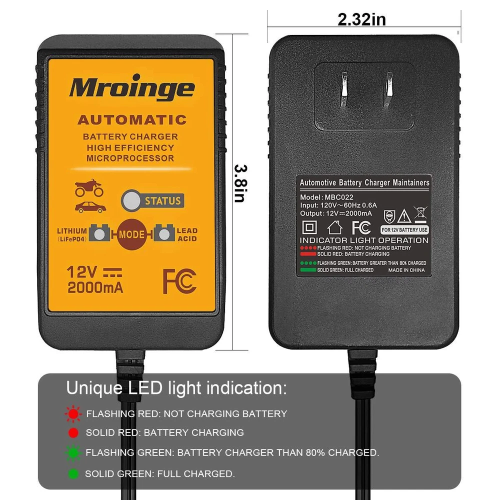Two battery type options: 12V Lead Acid and 12V Lithium(LiFePO4); Input voltage: 100-120VAC, Output: 12V 2A Multi-level safety protection: Spark proof, reverse polarity, overcharging, short-circuit, over-temperature, and dust resistance. with bad battery identify and 12V Lithium(LiFePO4) battery low voltage activation function. Perfect for charging 12V lead-acid, flooded, sealed maintenance free batteries (AGM and gel cell) and 12V-Lithium(LiFePO4) up to 85Ah, Safely maintain types of motorcycle, automotive, marine, RV, Boat, ATV, powersport, lawnmower & garden etc. Adopt 5-stage smart charging and maintains principle (Initialization, Trickle Current, Bulk Charge, Absorption Mode, Float Mode) to ensure maximum battery life and performance, without overcharging. Intuitive LED indicators provide visual charging state feedback and diagnostic information. Easy connection to vehicle battery using the included battery clips and O-ring terminals cord. Includes a 12ft output cord and 2-year warranty. Attention: Please disconnect the battery before changing the charge mode.