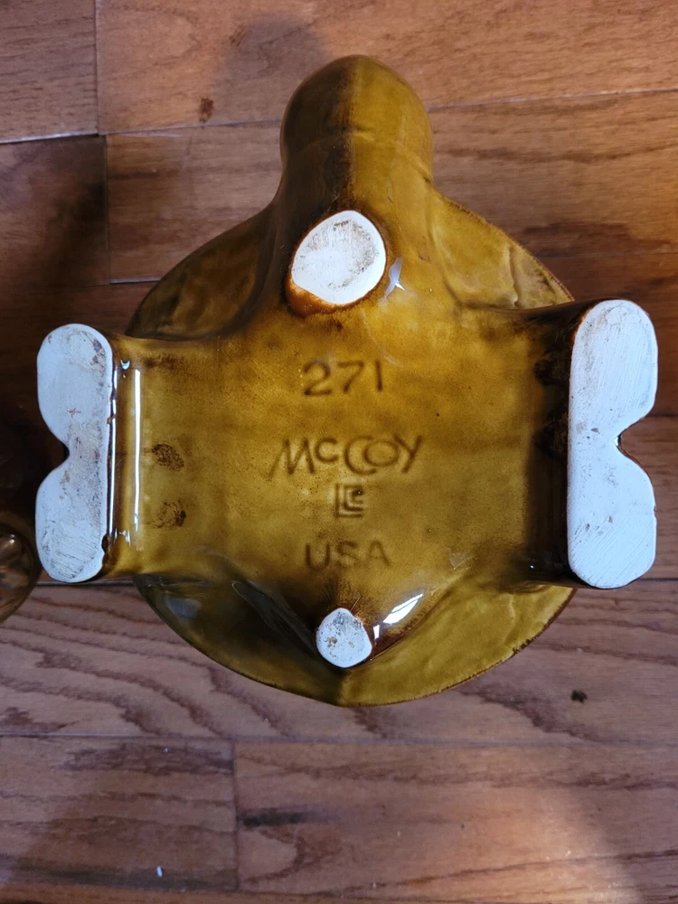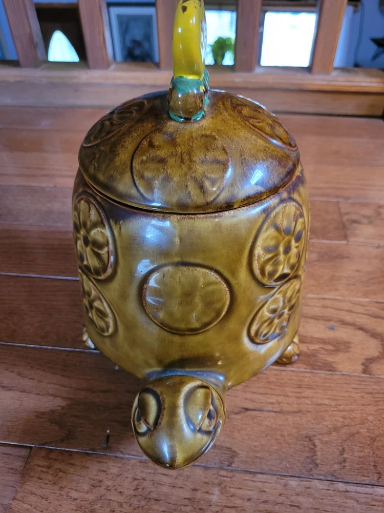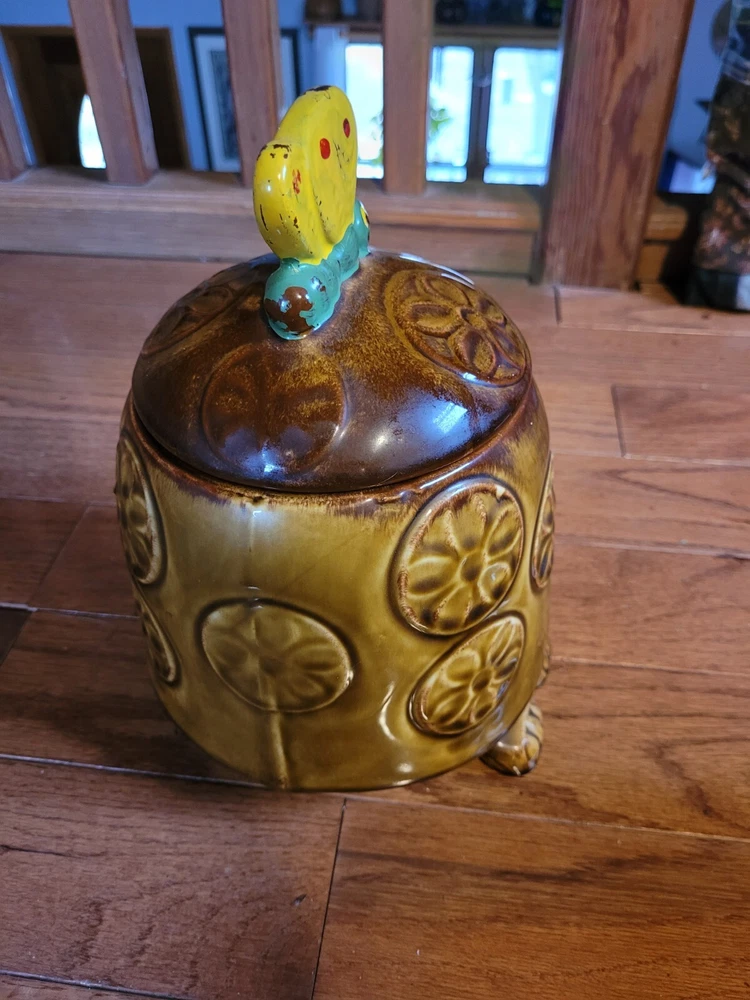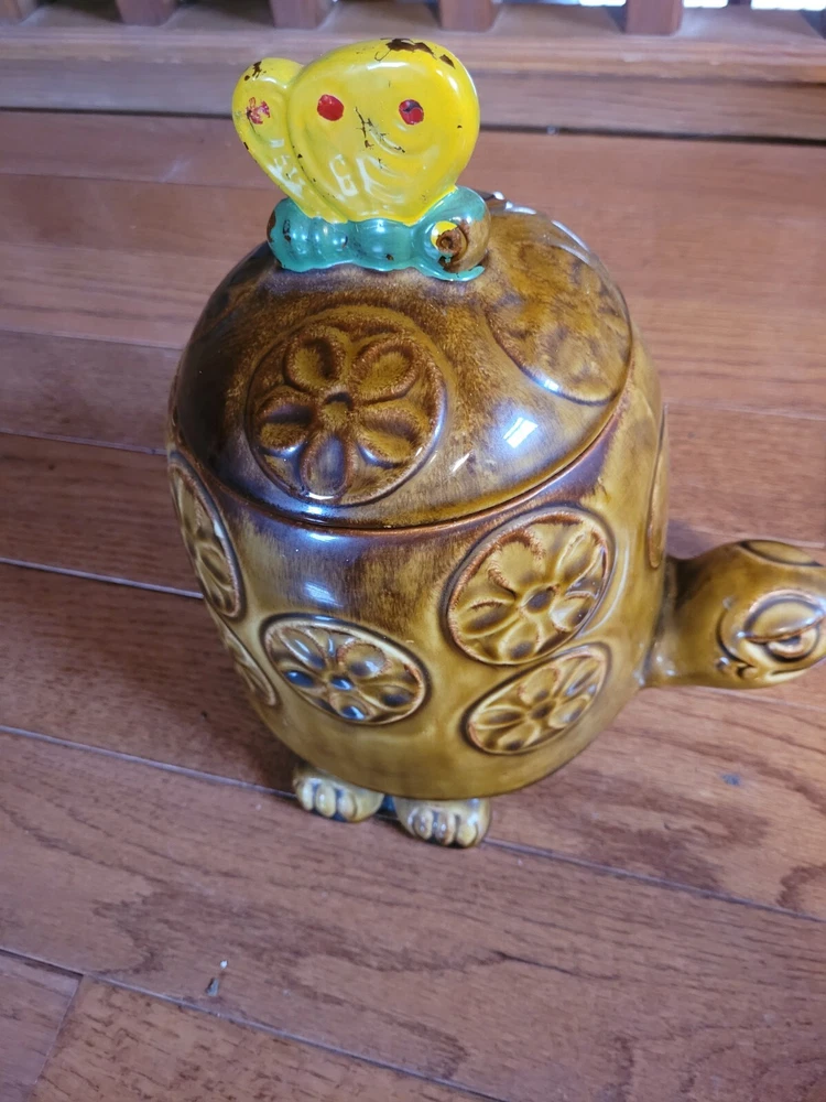 Experience the charm of yesteryear with this delightful McCoy Cookie Jar, a vintage treasure from the 1950s. Crafted from high-quality ceramic and porcelain, this medium-sized container features a charming turtle design, complete with a whimsical butterfly lid that sits atop for easy access. The round shape and rich brown color add to its antique allure, making it a perfect addition to any kitchen or collection.Proudly made in the United States, this original McCoy piece has been cherished through the years. It boasts a single compartment to keep your treats fresh and an 11-inch height that ensures it stands out on any countertop. Whether you're a collector of antique styles or simply appreciate the handcrafted quality of this set, this cookie jar is a delightful nod to the past.