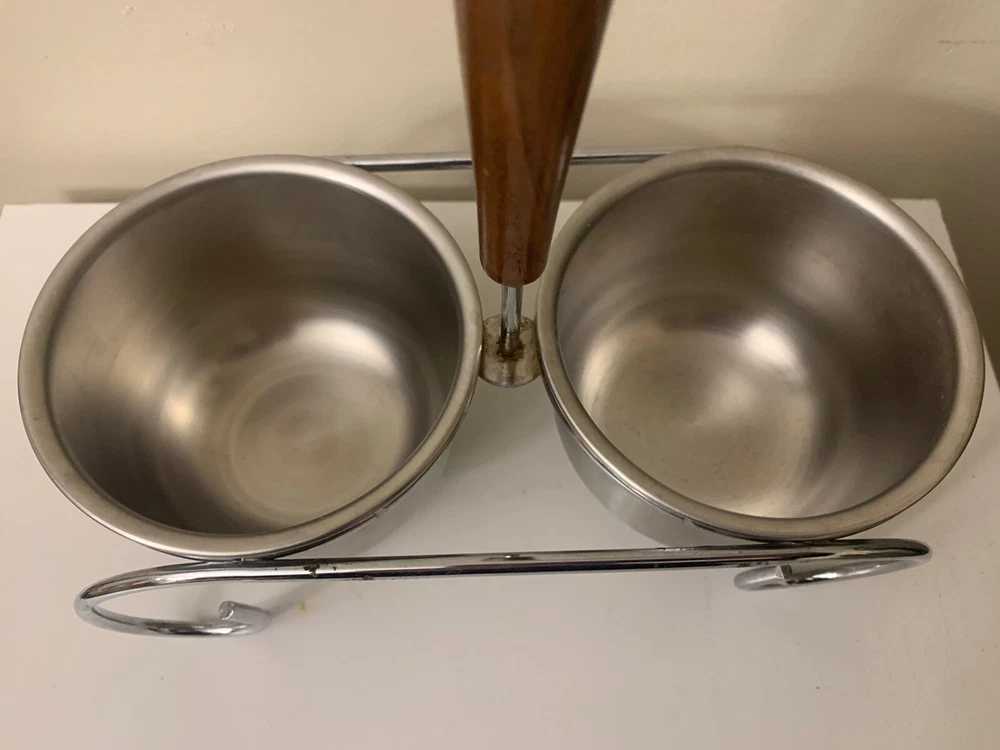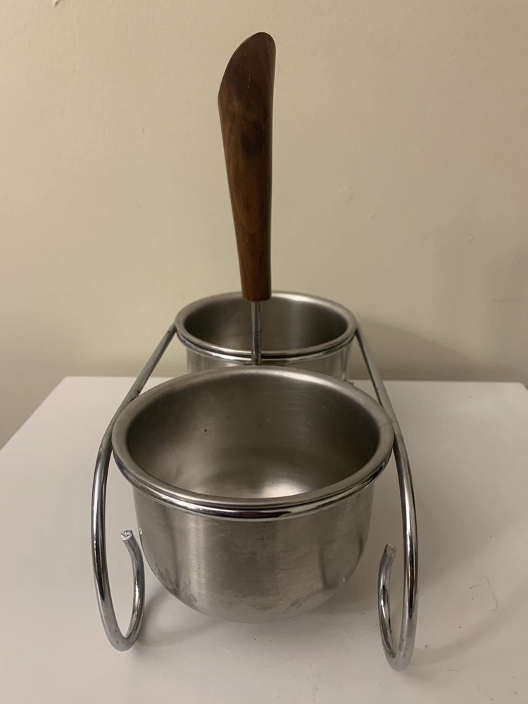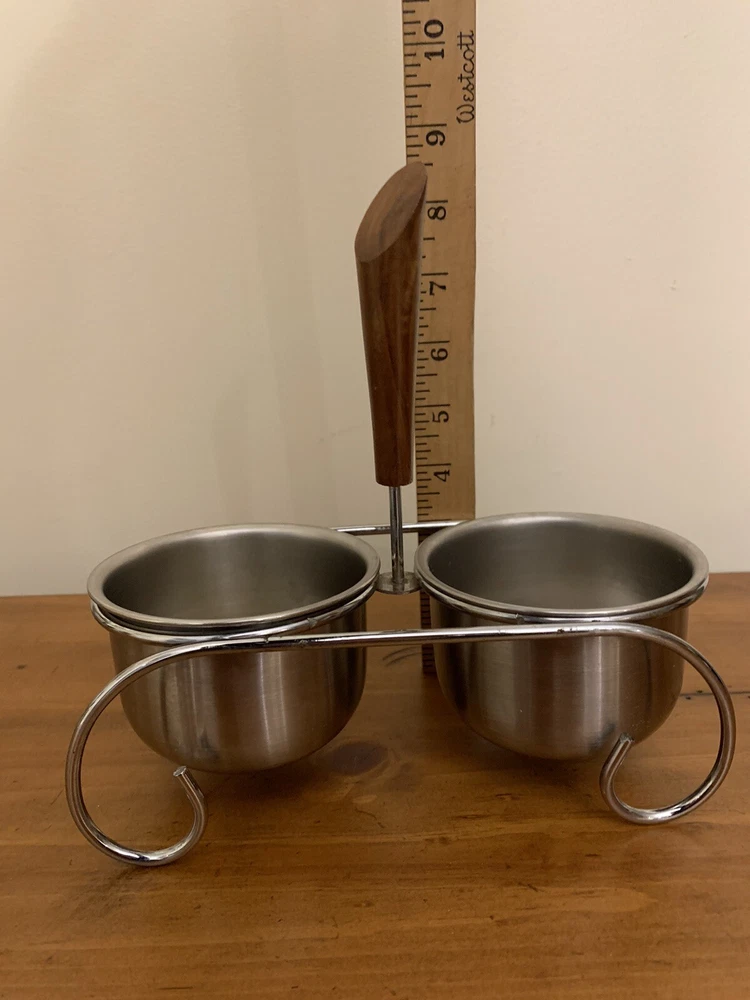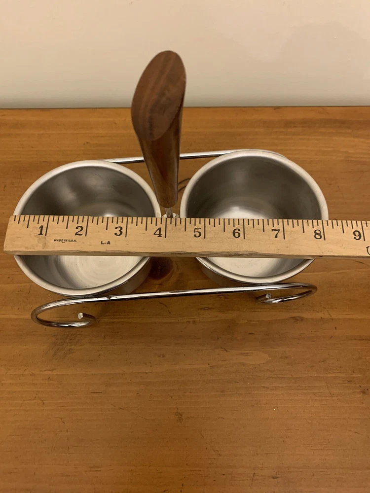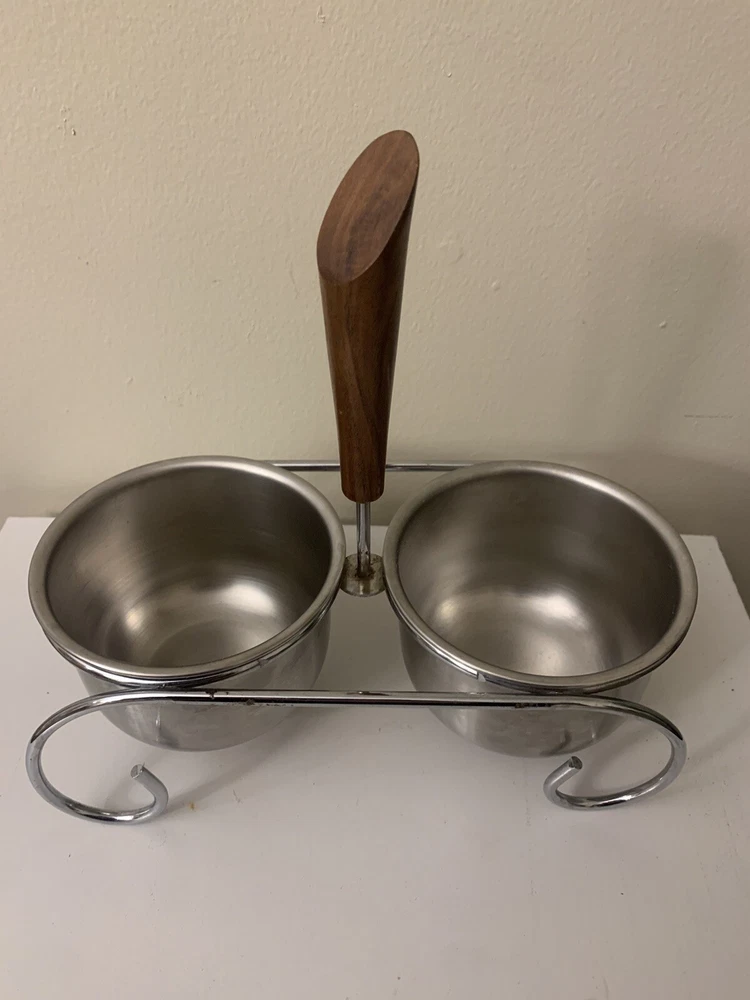 Vintage MCM Salad Dressing Condiment sauce Server serving Caddy Metal bowls and Wood Handle Mid Century. Good vintage condition-refer to pics