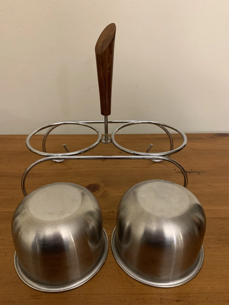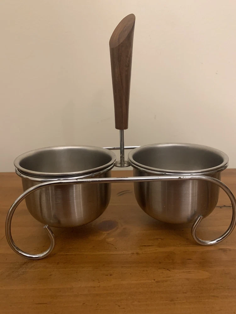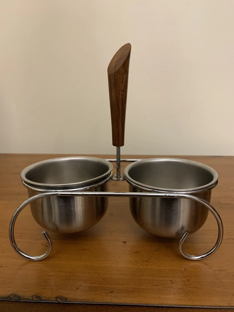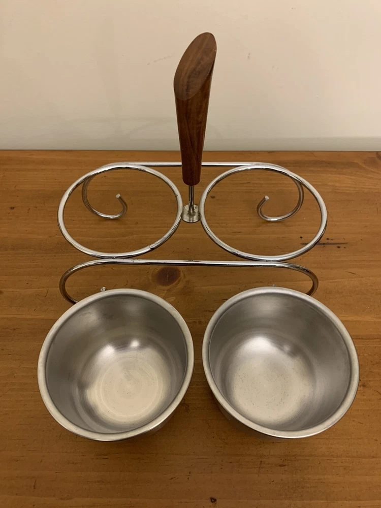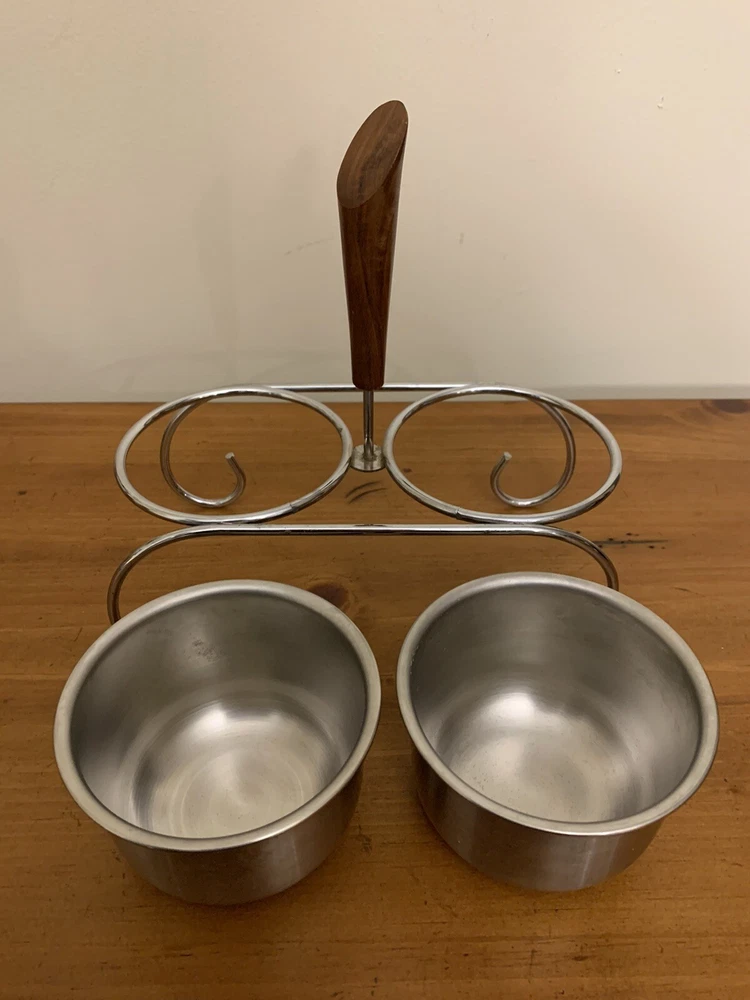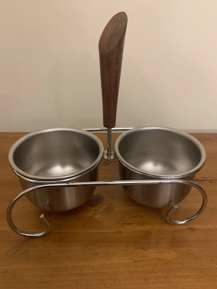 Vintage MCM Salad Dressing Condiment sauce Server serving Caddy Metal bowls and Wood Handle Mid Century. Good vintage condition-refer to pics