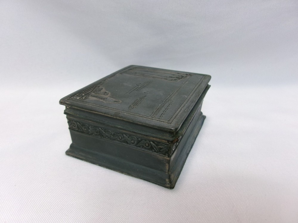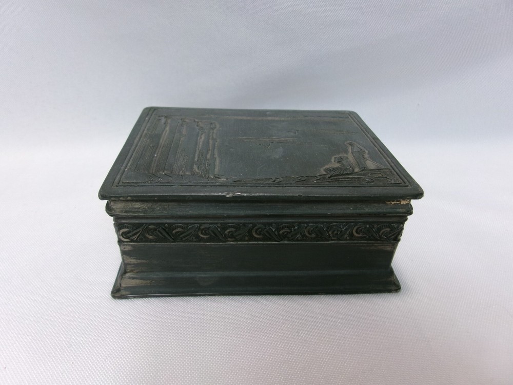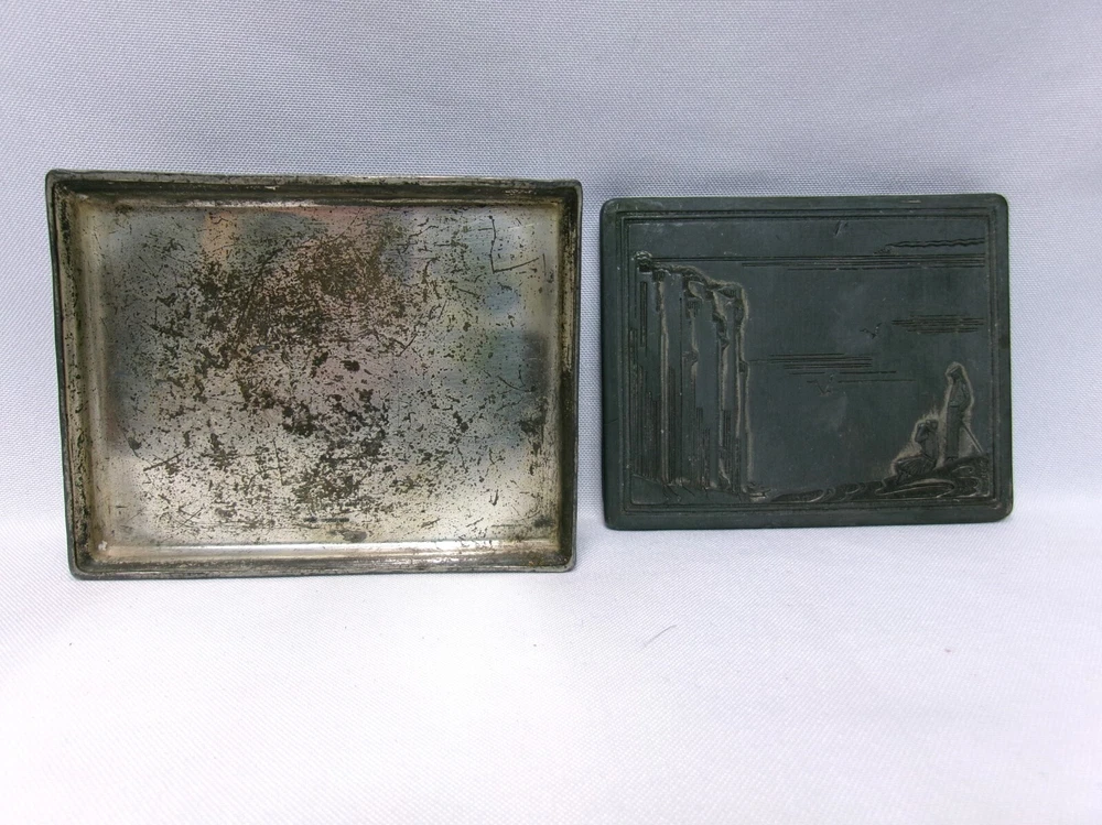 DETAILS · The outside looks like lead; The inside is gold-tone metal. Good vintage condition. The lid was once hinged to the box, but the hinge is broken off and now the lid simply lifts off (but fits nicely on the lip); Priced accordingly. There is very slight wear commensurate with age. I found no other notable flaws. Approx. 4” x 3 ¼” x 1 ¾” tall. - VISIT MY EBAY STORE! - I am selling many other vintage items and offer combined shipping; Message me for a quote. _____________________________ If there is any issue you are not happy with, please message me directly. I aim for 100% satisfaction! _________________________________________