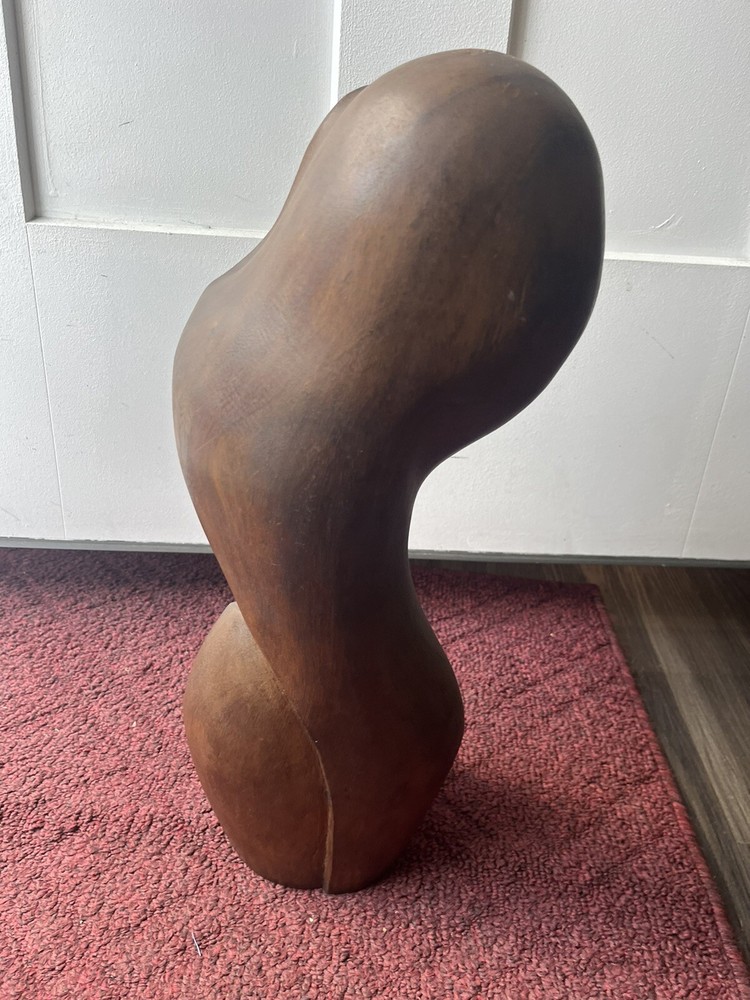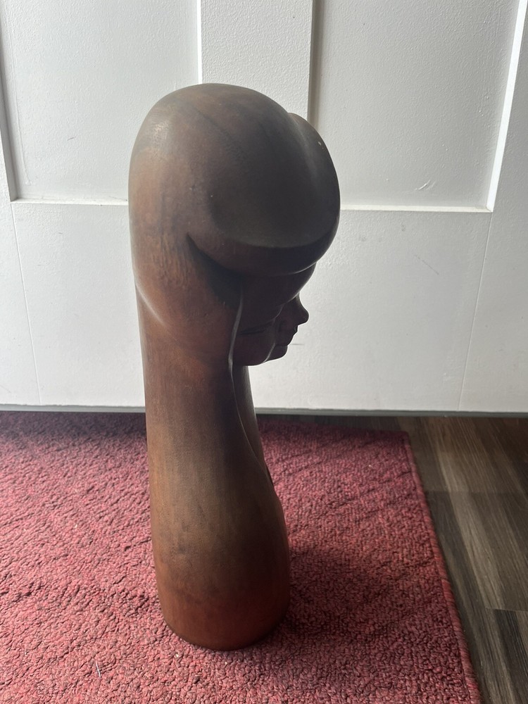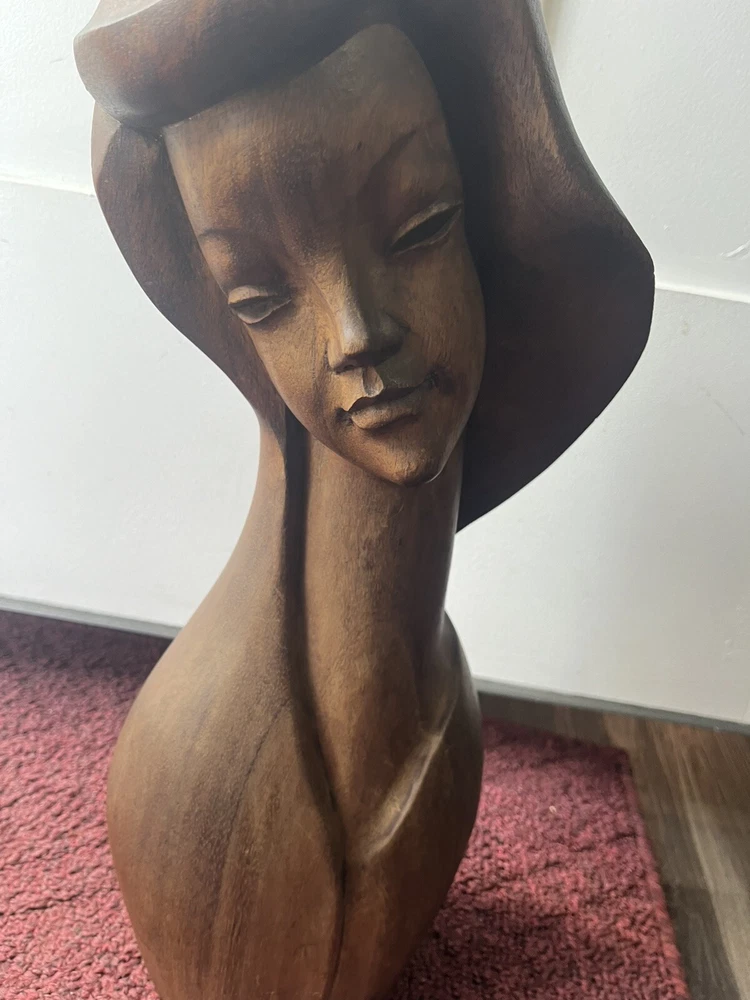 This vintage Mid-Century Modern Art Deco style bust of a woman is a stunning piece of carved wood art. The beautiful craftsmanship brings to life the striking features of a woman's face, making it a unique addition to any art collection. The use of wood as the material adds to the beauty and uniqueness of the piece. This exquisite bust is perfect for art lovers and collectors, and is sure to add a touch of elegance to any room. Preowned it shows minor signs of age some chipping of the wood at the top of her head She is 18 inches tall and 8 inches wide Please refer to pictures before making your purchase
