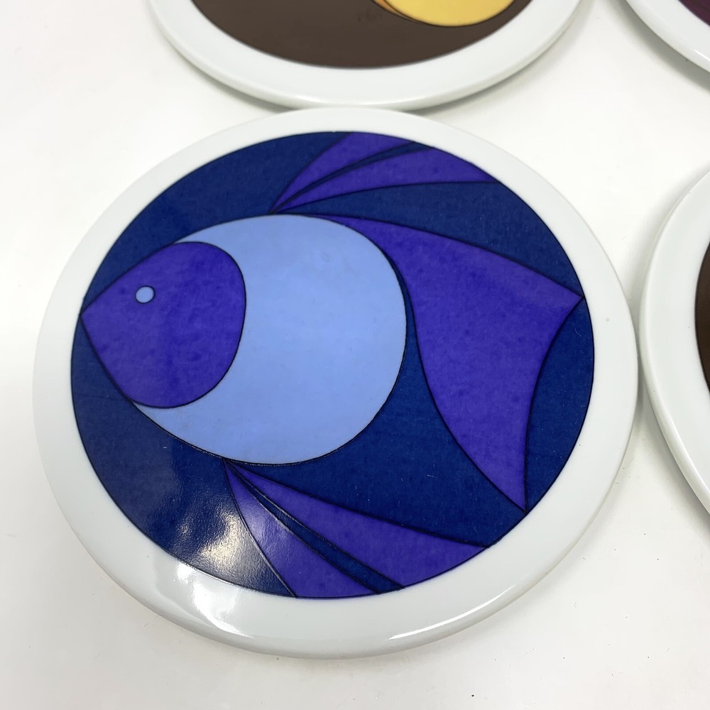 Set 4 MCM Color Block Wall Plaques Snail Fish Ib Antoni Bing & Grondahl Denmark Vintage used condition, a really fun set of color block/bold snails, a butterfly, and a goldfish by 60s/early 70s graphic designer Ib Antoni for Bing & Grohndal. These have holes for hanging but could also be used as trivets. Some minor wear, a scratch on the snail one, and a bit of fading on the fish/butterfly. Please check photos for details. Please choose economy or priority shipping in the options. Feel free to contact me with any questions, I'm happy to help.