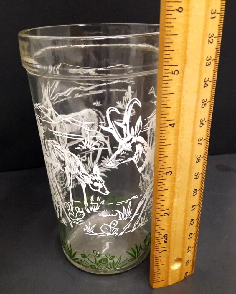 Set of 5 Vintage Hazel Atlas 'Prong-horn Antelope' 14/16 oz Glass Tumblers. They are 5 3/4" tall, 14 oz capacity. The glasses have a 'raised' white painted design on outside. The design is mostly in white, except for the grass & cactus along the bottom, which is green. There are outlines of mountains, cactus & other vegetation, 2 adult prong-horns & 2 babies on each glass. Handwriting is recommended. They are all in excellent condition.