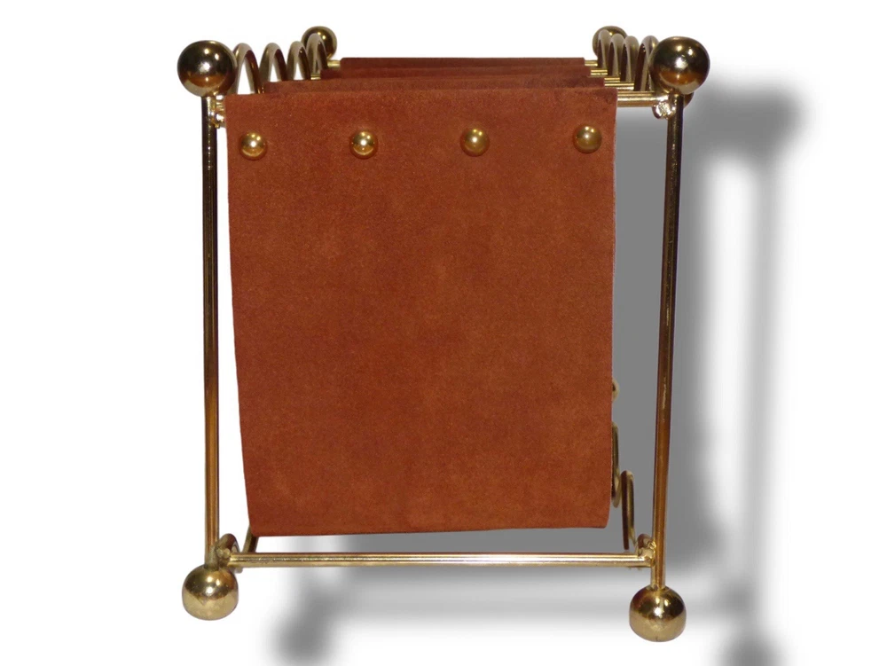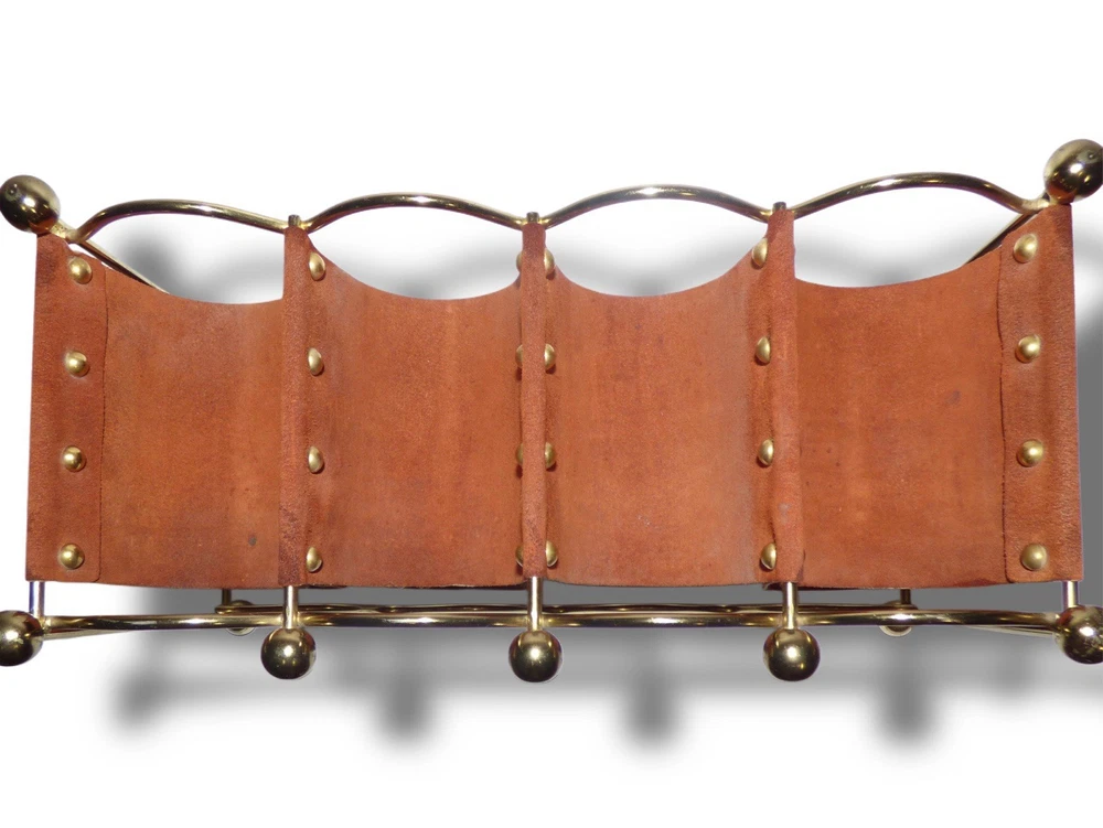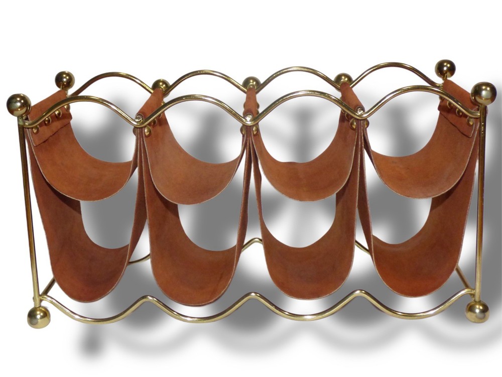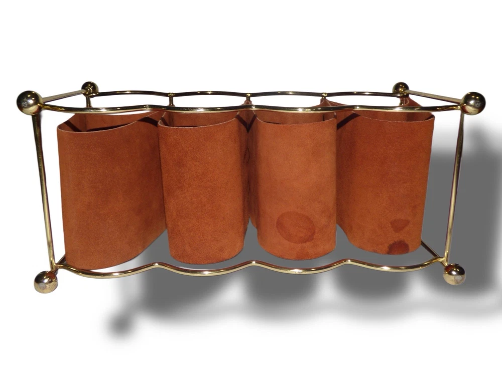 Beautiful Vintage Mid Century Modern style Wine Rack that has a Southwestern design. This piece is very unique and likely from the 1970’s. Good to put in a man cave, or anywhere to decorate a room. Item is in Great vintage condition considering its age. Some spots on suede and surface ware on brass. Pleas use photos as your description! Measures 17" L x 7 5/8" W x 9 1/4" H Holds 8 bottles Smoke and Pet free environment :) Feel free to ask any questions you’d like. Thank you so much for looking, enjoy and if you have some time check out the other items I have up for sale !