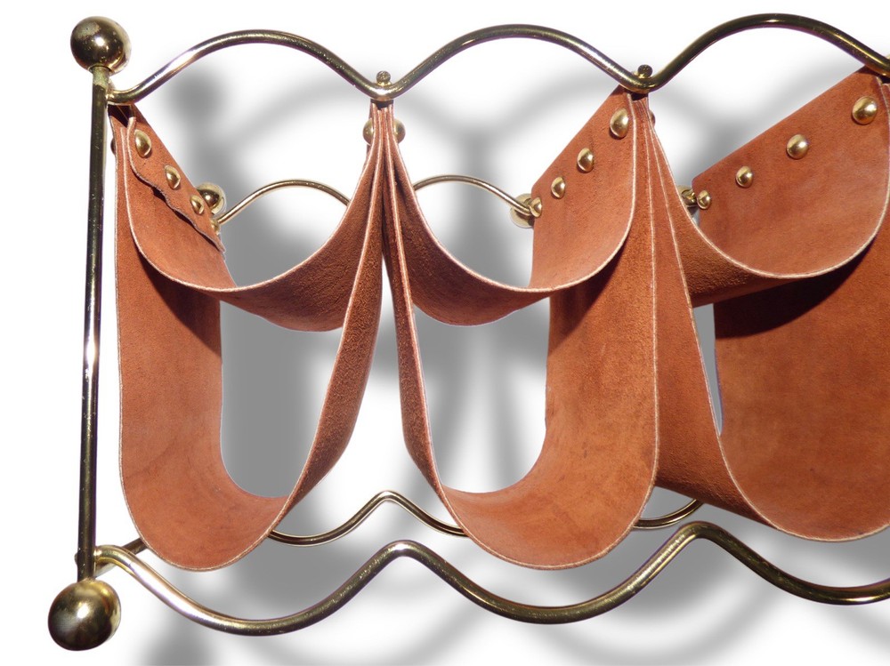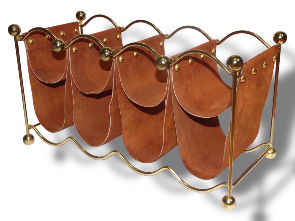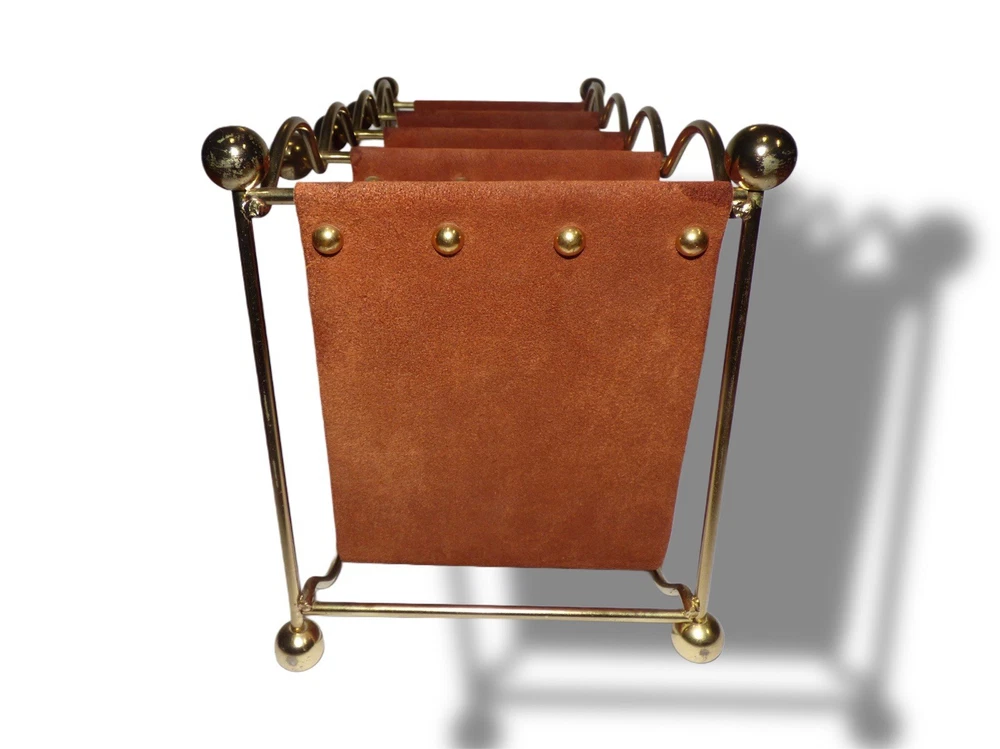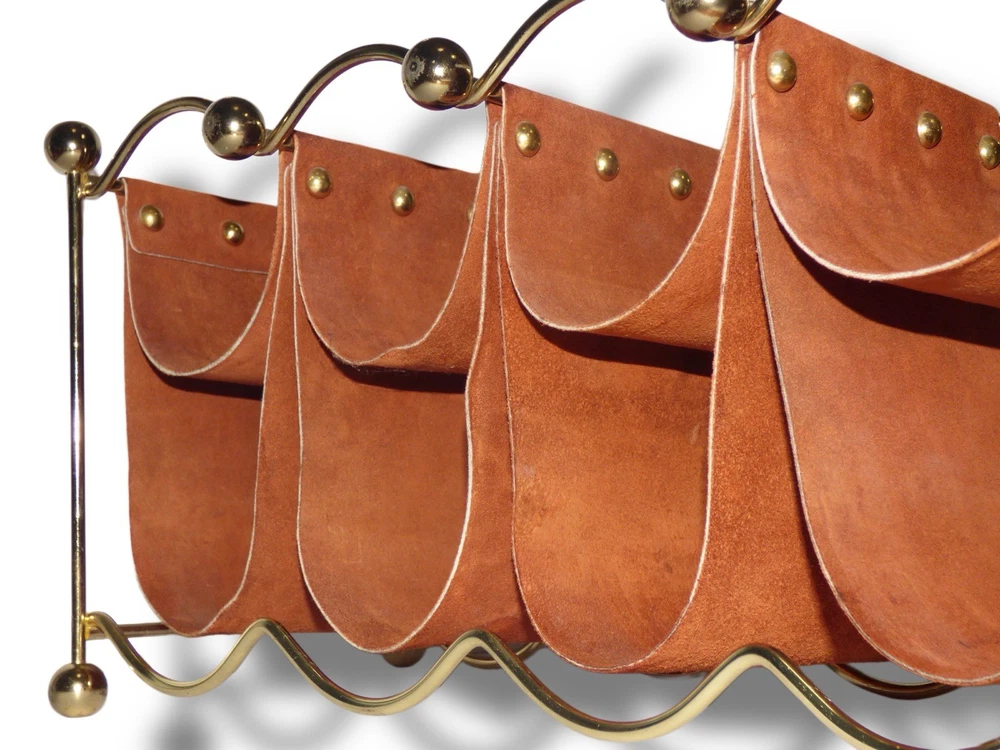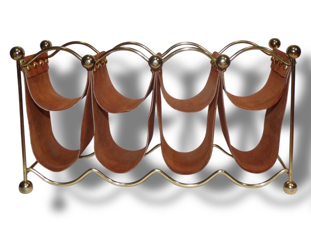 Beautiful Vintage Mid Century Modern style Wine Rack that has a Southwestern design. This piece is very unique and likely from the 1970’s. Good to put in a man cave, or anywhere to decorate a room. Item is in Great vintage condition considering its age. Some spots on suede and surface ware on brass. Pleas use photos as your description! Measures 17" L x 7 5/8" W x 9 1/4" H Holds 8 bottles Smoke and Pet free environment :) Feel free to ask any questions you’d like. Thank you so much for looking, enjoy and if you have some time check out the other items I have up for sale !