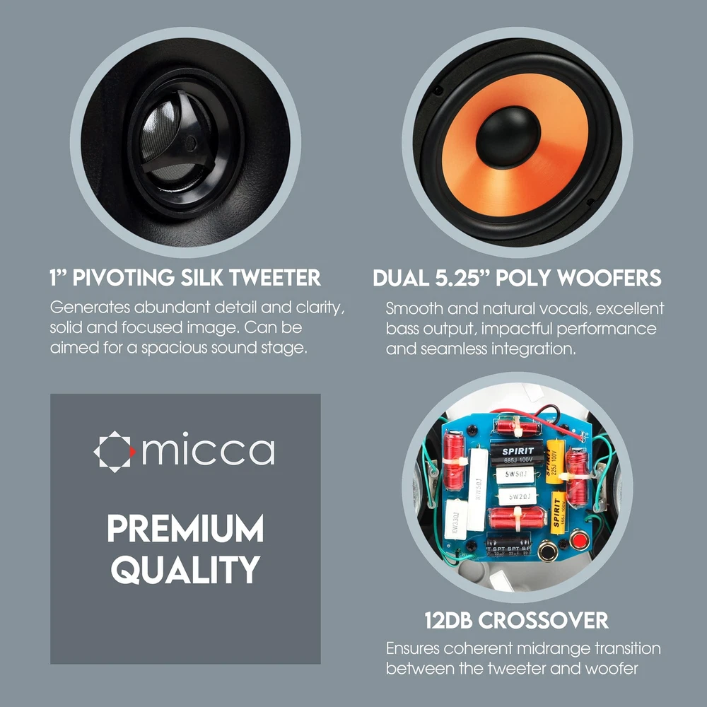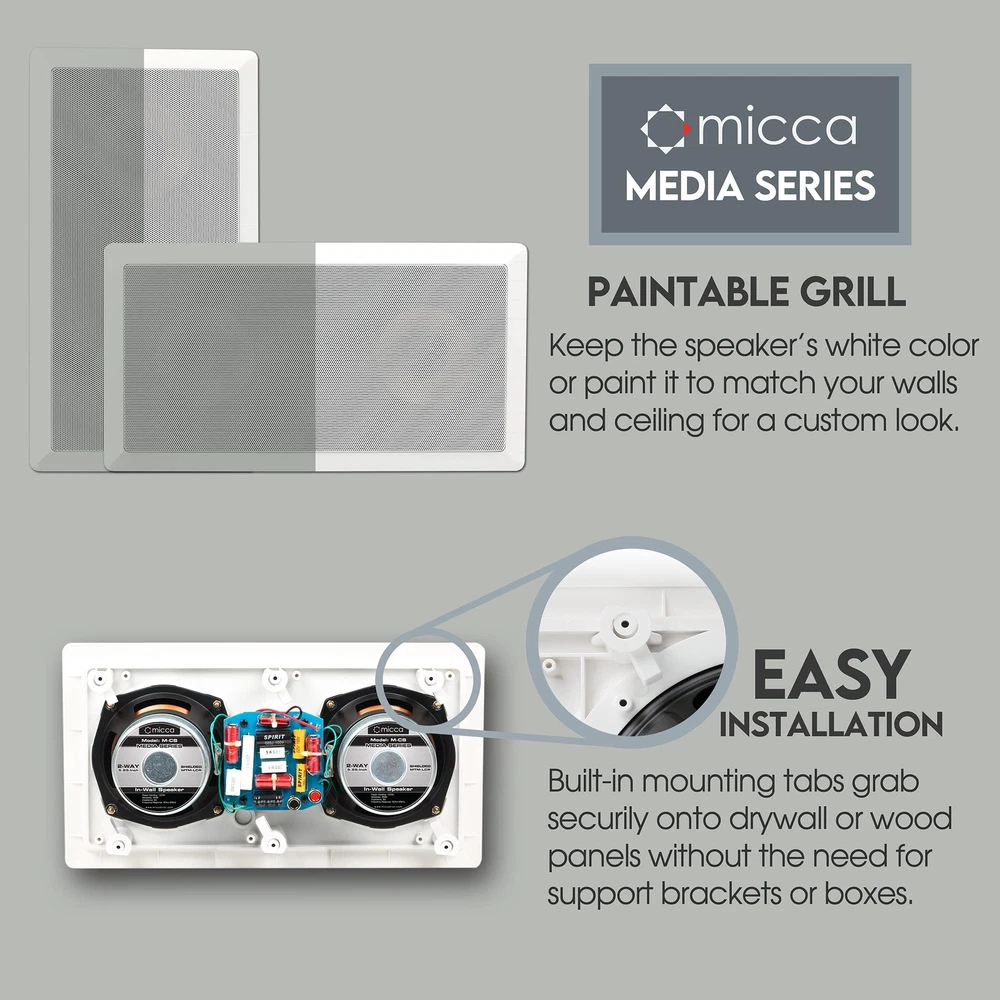 NOTE: This listing is for one speaker, buy as many as needed! The M-Series of in-wall and in-ceiling speakers have been designed for optimal performance in a wide variety of home entertainment applications, from providing relaxed background music to a high-impact 7-channel home theater system. Built with high-quality components and rigorously tested design, M-Series speakers deliver exceptional value and are well reviewed by owners and critics. Dynamic and Balanced The M-CS is a 2-way in-wall speaker with two high excursion 5.25" poly woofers and a 1" soft dome tweeter. This combination provides the utmost flexibility in terms of configuration and suitability to different types of audio tastes. In addition to smooth and natural vocals, the dual 5.25" woofers work together to produce great bass output, delivering impactful performance and ensuring seamless integration if a subwoofer is used. Imaging and Clarity The 1" soft dome tweeter provides abundant detail and clarity, generating solid and focused imaging for all sound sources in a spacious sound stage. Designed for a broadened listening sweet spot, the tweeter employs a diffuser to assist with the off-axis response as well as a pivoting mechanism to achieve proper aiming. Perfect integration between the tweeter and woofer is achieved through a 12dB crossover. Once installed and set up, the M-CS projects a realistic sound stage with excellent resolution. Specifications - Woofer: Dual Shielded 5.25” Poly-Mica - Tweeter: 1” Pivoting Silk Dome - Crossover: 12dB/Octave - Frequency Response: 60Hz-20kHz - Impedance: 8 Ohms - Sensitivity: 90dB 1W/1M - Power Handling: 120 Watts (Each) - Outer Dimension: 15.4" (W) x 8.3" (H) - Cutout Dimension: 13.8" (W) x 6.7" (H) - Mounting Depth: 3.1" UNCOMPROMISING AUDIO QUALITY - Media Series in-wall speakers are designed for optimal performance in a wide variety of home audio applications, from relaxing background music to high-impact home theater systems. Their smooth and natural sound signature with robust bass output deliver an engaging listening experience. EASY TO INSTALL - The built-in mounting tabs grab securely onto drywall or wood panels with no need for additional brackets or boxes. With durable construction and materials, in-wall speakers are great for family rooms, living rooms, bedrooms, kitchens, bathrooms, and covered outdoor porches, providing years of lasting enjoyment. MODERN AND ELEGANT - Using a rimed grill design, the Media Series in-wall speakers protrude minimally from the wall and blend unobtrusively into any decor. When painted to match the wall color, they become virtually invisible, giving you great sound without taking up valuable space. ENGINEERED FOR GREAT SOUND - The M-CS utilizes dual high excursion 5.25-inch poly woofers and a pivoting 1-inch silk dome tweeter that can be aimed to project a spacious sound stage, integrated through a 12dB crossover network. The M-CS can be installed horizontally as a center channel speaker, or vertically as front or surround channel speakers. SPECIFICATIONS - Frequency Response: 60Hz-20kHz; Impedance: 8 Ohms; Sensitivity: 90dB 1W/1M; Power Handling: 120 Watts (Each); Outer Dimension: 15.4” (W) x 8.3” (H); Cutout Dimension: 13.8” (W) x 6.7” (H); Mounting Depth: 3.1”