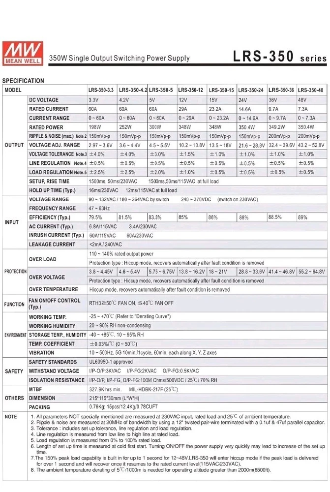 The MEAN WELL LRS-350-48 is a switchable power supply with a single output of 350.4W at 48V and 7.3A. This reliable and efficient power supply is designed for electrical equipment and industrial use, offering a stable and consistent power source for various applications. With the trusted brand of MEAN WELL, users can rely on this product to provide the necessary power while ensuring safety and quality.