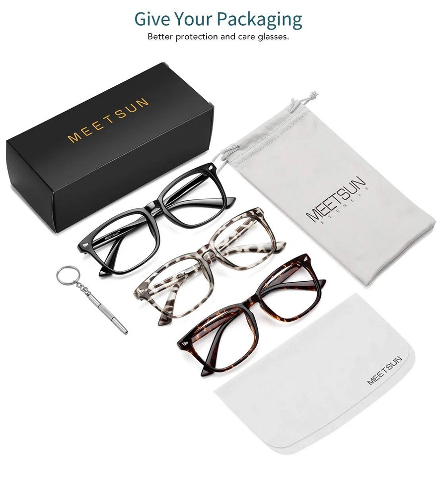 MEETSUN Blue Light Blocking Glasses, Anti Eye Strain Headache (Sleep Better),Computer Reading Glasses UV400 Transparent Lens (Black+Leopard+Tortoise, 53) BLUE LIGHT FILTER LENSE - Block harsh blue light and provide UV400 protection. Blue light blocking computer glasses are professional for people who work long hours on computers, tablets, games, phones, or on TV. ANTI EYE STRAIN, MORE RESTFUL SLEEP - Enjoy your digital time, NO worry about eye fatigue, blurred vision, and headache. Improve Better Sleep, provide all-day protection. TRANSPARENT LENS - Low color difference, bring you a good visual experience, shock resistant, non-fragile, easy to clean, safe to wear. These lenses have been tested for anti-blue light and we will provide you with test photos if you have any questions. FASHION & HIGH QUALITY MATERIALS - Ligthweight frame, never out of fashion, strong and stable, the non-prescription glasses are suitable for both women and men. OUR SERVICE: We stick to paying attention to product quality, if there are any quality problems please let us know! Why do we need the blue light filter glasses ? 1、The blue light emitted by screens reaches deeper into the eye will cause symptoms of eyestrain, eye fatigue, migraines, and dry eyes . 2、Scientists have found that exposure to harmful blue light from phones, tablets, computers, TVs and mand vision loss.odern room lighting ruins your sleep and causes permanent eye damage What you get from MEETSUN blue light blocking glasses ? Anti eye fatigue - Protect Your Eyes from macular degeneration and early vision loss,more concentrate on working and learning . Sleep Better - Minimized the headache and enjoy a good sleep for a whole night. Enjoy your digital times - effectivly blovk harmful blue light,Protect your eyes from daily life and electronic products. Hazards of Blue Light Eye Strain - Too much blue light exposure can cause eye strain, headaches, and blurred vision,affect your learning and working efficiency Permanent Eye Damage - Long term exposure to blue light has been linked to a greater risk for vision loss. Headaches - Cause poor sleeping quality or even hardly can fall asleep Whether you put in long hours in front of a computer screen during the day, or find yourself tweeting, and texting in the evenings. -- UV400 + Blue Ray Protection lens - Say goodbye to eyestrain & headaches,all-day protection from blue light and UV light -- Clear lens -- The transparent lens ,without adding any pigment, while maintaining high light transmittance. Less reflective, no affect reading , and almost no color difference. - -Fashion eyeglasses Frames - Turn heads with classic and stylish styles Keeping you protected both indoors & out ,for women and men Shipping We offer FREE shipping on all orders! We ship within Three business days of payment, usually sooner. We use a selection of shipping services such as UPS, FedEx, USPS etc. We only ship to the lower 48 states, no APO/FPO addresses or PO Boxes allowed. Local pickups and combined shipping options are not provided at this time. Return You can return a product for up to 30 days from the date you purchased it. Any product you return must be in the same condition you received it and in the original packaging. Please keep the receipt. Feedback Customer satisfaction is very important to us. If you have any problem with your order, please contact us and we will do our best to make you satisfied. Contact Us If you have any queries, please contact us via ebay. We usually respond within 24 hours on weekdays. Please visit our eBay store to check out other items for sale! Thank you for shopping at our store.