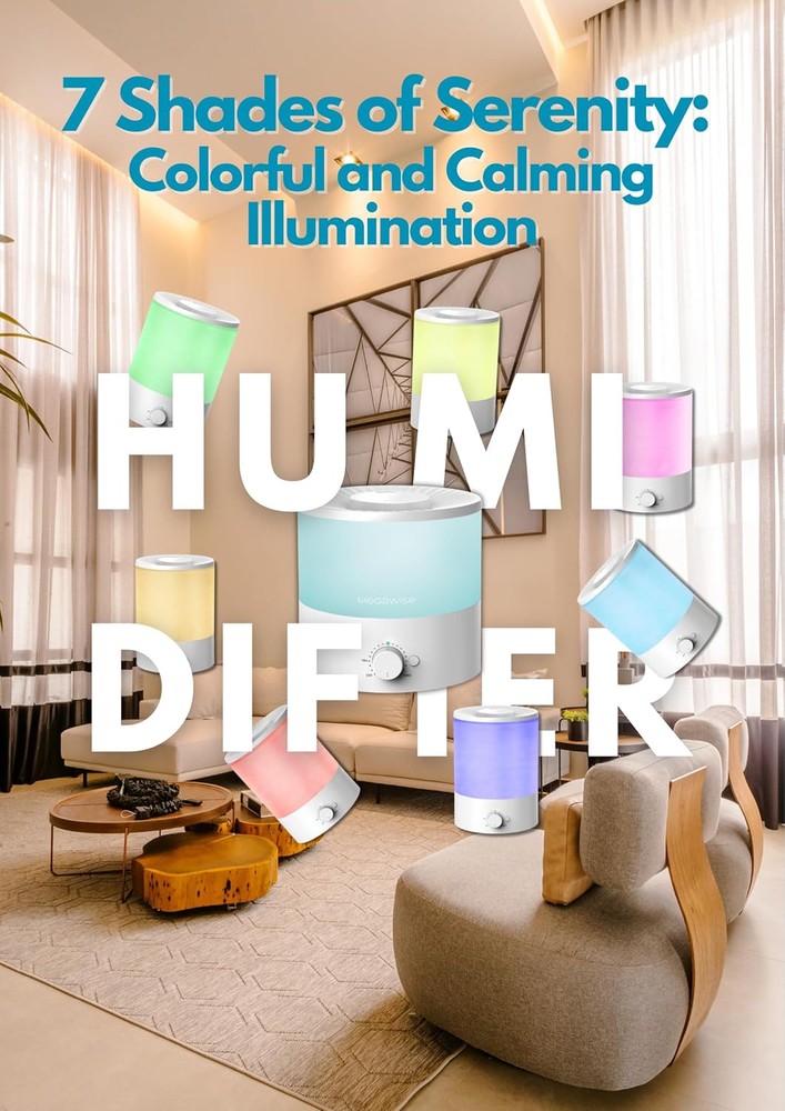 MEGAWISE 1.5L Cool Mist Humidifier for Bedroom, Home, Office, and White,Blue Product Details Brand: MEGAWISE Special Feature: Adjustable,Durable,Easy To Clean,Quiet Ultrasonic Color: White,Blue Floor Area: 400 Square Feet Operation Mode: Ultrasonic Product Dimensions: 5.7"D x 6.4"W x 11"H Item Weight: 1 Kilograms Room Type: Office, Living Room, Bedroom Model Name: X5L Included Components: humidifier Voltage: 1.2E+2 Volts Wattage: 12 watts Control Method: Touch EU Spare Part Availability Duration: 2 Years Manufacturer: MEGAWISE Item Weight: 2.2 pounds Country of Origin: China Item model number: SK7620 Batteries required: No CapacityRuntime: 1.5 Liters10 minutes MaterialPower Source: Resin, PlasticCorded Electric Moisturize All Day: 0.5gal water capacity suppots the running time up to 10 hours at low level, 8 hours at medium level and 6 hours at high level, it can help you to fight with dry skin, wrinkles, insomnia, and sore throat, creating a whole moisturized day. OPERATES IN TOTAL SILENCE – SLEEP LIKE A BABY! No humming, whistling, or crackling as this durable Whole-House Humidifier steadily and efficiently dispenses the soothing cool mist you crave. SLEEP better, BREATHE better, LIVE better! You’ll wish you found this years ago! Humidifier & Essential Oil Diffuser 2-in-1: Cool mist humidifier effectively diffuses moisture into the dry air to maintain a comfortable humidity level to relieve dry skin, coughing, allergy, or sleeping aid. Add essential oils and fill your home with fresh aroma while enjoying cool mist evaporation.
