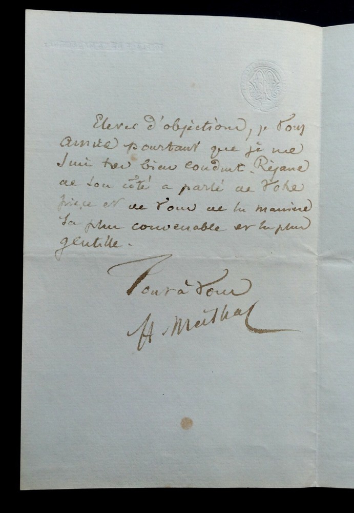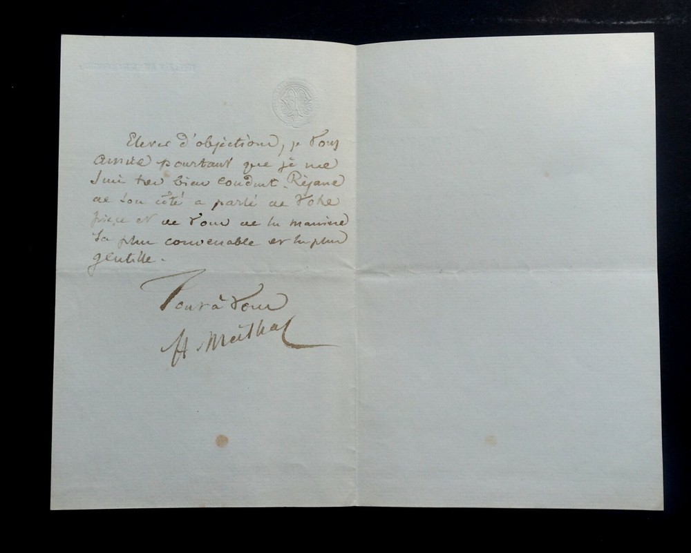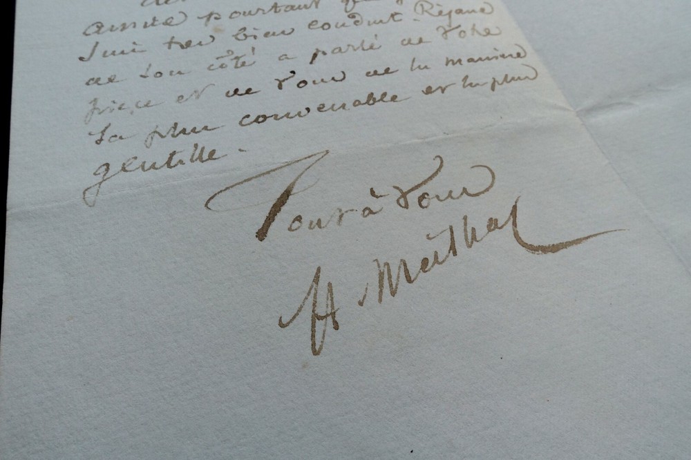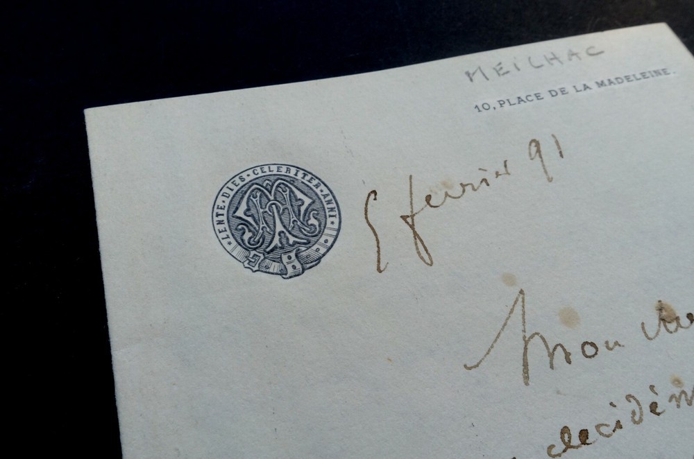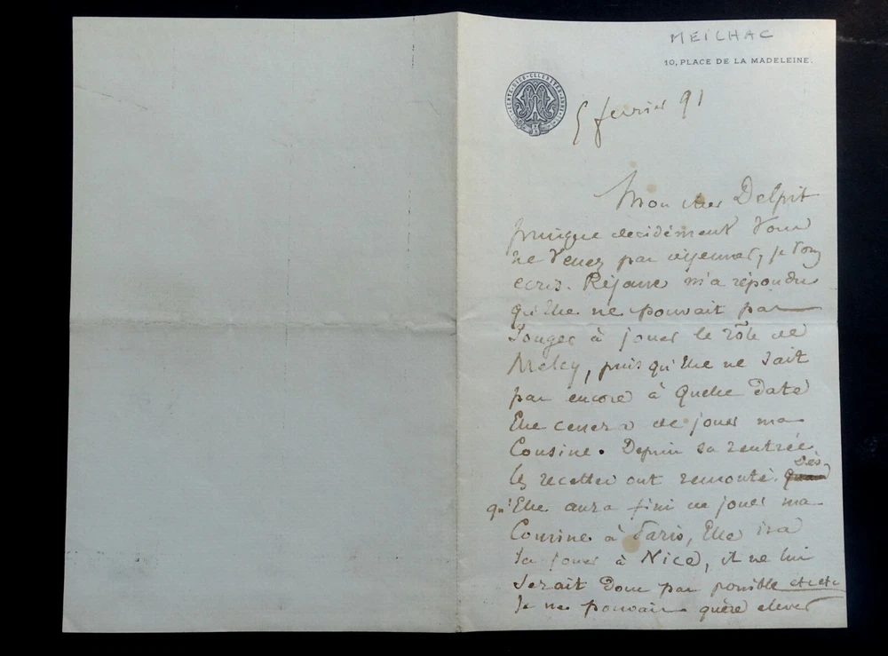 Henri MEILHAC. Lettre autographe signée en date du 5 février 1891. Lettre de deux pages adressée à Albert Delpit sur papier à en-tête gaufrée monogramme. Il mentionne une affaire en cours qui concerne des rôles pour une nouvelle pièce. Dimensions : 11.4 x 18 cm. 2 pages. Etat : Bon état de conservation . Voir photos pour référence. Henry Meilhac, né le 23 février 1830 dans l'ancien 4ᵉ arrondissement de Paris et mort le 6 juillet 1897 dans le 8ᵉ arrondissement de Paris, est un auteur dramatique, librettiste d'opérettes et d'opéras français. Wikipédia Albert Delpit, né à La Nouvelle-Orléans le 30 janvier 1849 et mort à Paris 8ᵉ le 4 janvier 1893, est un romancier et auteur dramatique français. Wikipédia Envoi soigné dans un emballage rigide et étanche. Satisfait ou remboursé. Si vous n'êtes pas entièrement satisfait, je reprends la marchandise avec retour à ma charge pour l'Europe et à la charge de l'acheteur pour le reste du monde. N’hésitez pas à visiter ma boutique et affiner vos recherches en fonction des catégories qui vous intéressent. Ma boutique L'Art Délivré. Lettres autographes, vieux papiers, livres anciens, photographies, gravures, timbres… Nous expertisons et/ou rachetons dans toute la France vos lettres, collections de lettres et livres anciens. Merci de votre visite. Jérôme KAYSER. Lettre de deux pages adressée à Albert Delpit sur papier à en-tête gaufrée monogramme. Il mentionne une affaire en cours qui concerne des rôles pour une nouvelle pièce. Henry Meilhac, né le 23 février 1830 dans l'ancien 4ᵉ arrondissement de Paris et mort le 6 juillet 1897 dans le 8ᵉ arrondissement de Paris, est un auteur dramatique, librettiste d'opérettes et d'opéras français. Wikipédia Albert Delpit, né à La Nouvelle-Orléans le 30 janvier 1849 et mort à Paris 8ᵉ le 4 janvier 1893, est un romancier et auteur dramatique français. Wikipédia Satisfait ou remboursé. Si vous n'êtes pas entièrement satisfait, je reprends la marchandise avec retour à ma charge pour l'Europe et à la charge de l'acheteur pour le reste du monde. N’hésitez pas à visiter ma boutique et affiner vos recherches en fonct
