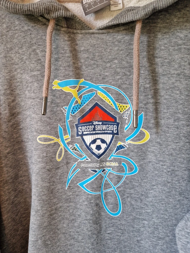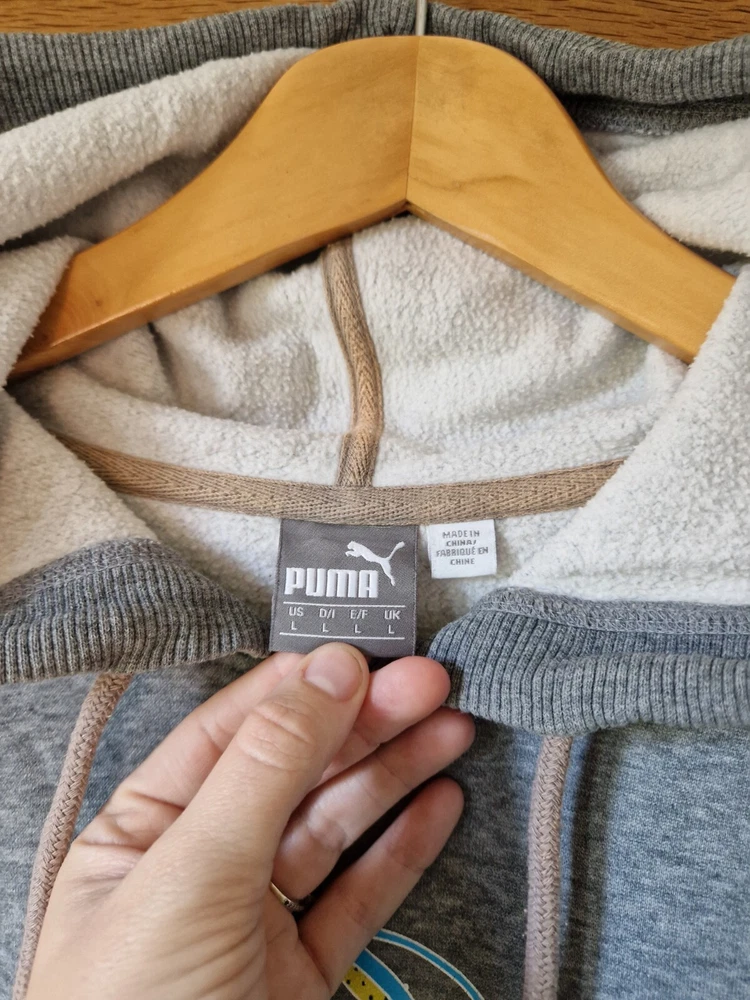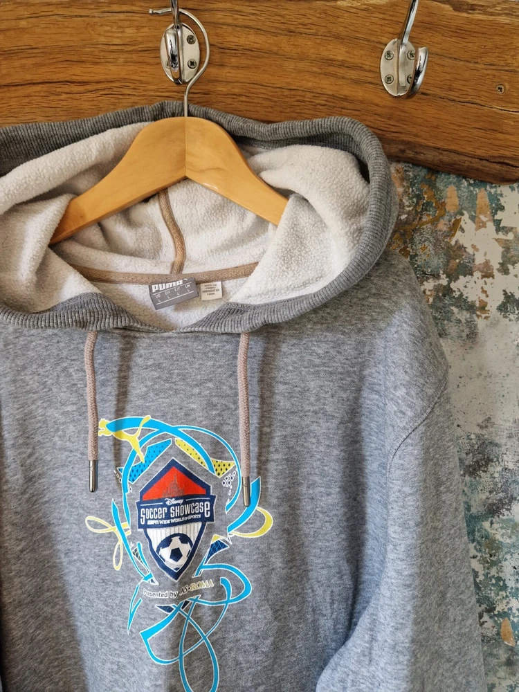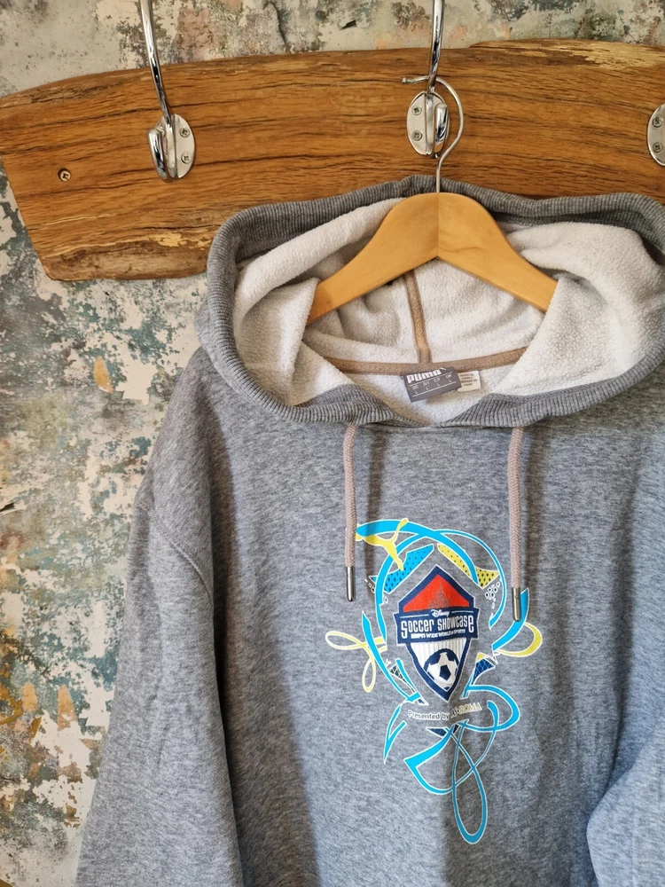 THIS IS A MENS GREY PUMA GRAPHIC DISNEY SOCCER SHOWCASE 90'S SWEATSHIRT HOODIE. THE MATERIAL IS COTTON AND POLYESTER. THE HOODIE WAS MADE IN CHINA. THIS IS A SECOND HAND PRE LOVED ITEM SO MAY SHOW SMALL FLAWS. NOTHING MAJOR WHICH I HAVE SEEN. HAS PLENTY OF WEAR LEFT. SHOULD FIT A MENS LARGE. INSIDE LABEL STATES A SIZE LARGE. PLEASE TAKE NOTE OF THE MEASUREMENTS BEFORE PURCHASING. I HAVE ADDED MEASUREMENTS FOR A MORE ACCURATE SIZING: PIT TO PIT MEASURES - 23 INCHES. TOP OF SHOULDER TO BOTTOM OF SWEATSHIRT MEASURES - 26.5 INCHES. UNDERARM TO BOTTOM OF CUFF MEASURES - 20.5 INCHES. ALL ITEMS ARE POSTED USING A TRACKED SERVICE. CHECK OUT MY EBAY FOR MORE GREAT ITEMS. B14