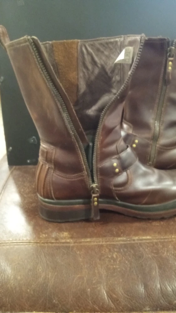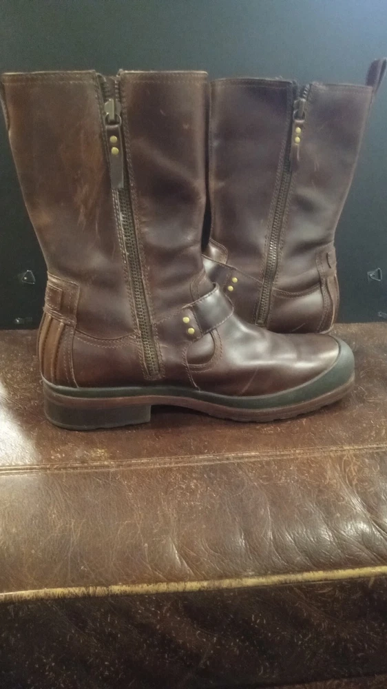 Elevate your style statement with these men's UGG Classic biker riding boots. Crafted with waterproof leather and a zipper closure, these boots are perfect for any occasion - from casual outings to activewear to travel. The round toe shape and adjustable strap with buckle accents ensure a comfortable fit, while the leather lining and insole provide added comfort. These vintage-inspired boots feature a solid pattern and a mid-calf shaft style, making them a versatile addition to your wardrobe. The boots come in a classic brown color and are available in US shoe size 13 and UK shoe size 12. BOOTS ARE 12" FROM BOTTOM OF HEEL TO TOP, FULL ZIPPER, ADJUSTABLE BUCKLED. SOME VERY LIGHT SCUFFING ON ZIPPER SIDES. BEAUTIFUL BOOTS !!!!