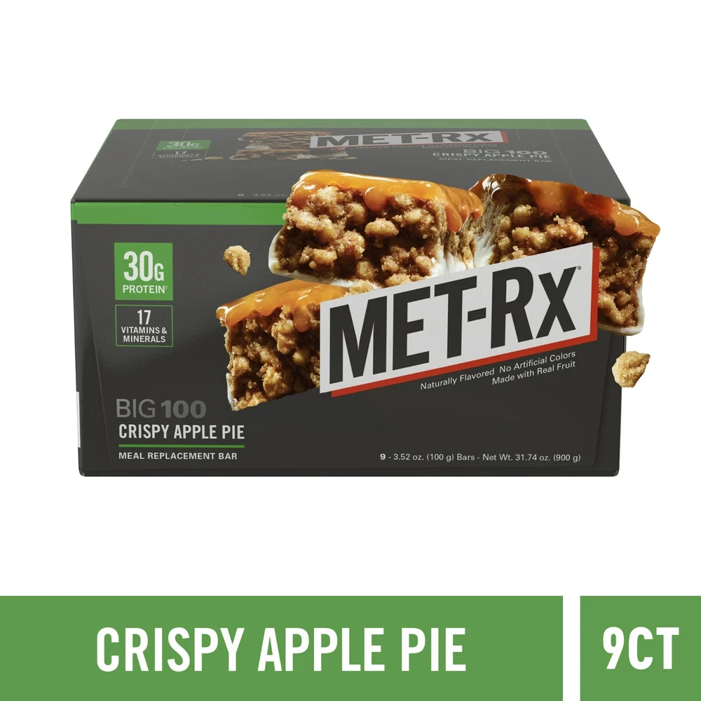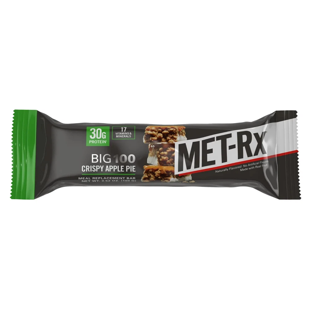 MET-Rx Big 100 High Protein Meal Replacement Bar, Crispy Apple Pie, 27 Packs MET-Rx® Big 100 Colossal is a meal replacement bar that provides the on-the-go nutrition you need to help fuel your active lifestyle.* This nutritious bar has 31 grams of protein and features METAMYOSYN®, to give you the nutrition you require both in and out of the gym.* In addition, each bar has vitamins for energy metabolism and antioxidant support. MET-Rx® Big 100 Colossal is a delicious, naturally flavored meal replacement bar that aids you in your journey to achieve your fitness goals.* These protein bars are made with the MET-Rx Metamyosyn protein blend for both a quick and sustained delivery of amino acids to muscles. Toss these high protein bars in your gym bag for a tasty treat pre workout or post workout, or enjoy these MET-Rx protein bars anytime you need a quick meal on the run. Nine count MET-Rx Big 100 Protein Bar, Crisp Apple Pie, 3.52 oz. HIGH PROTEIN BARS: MET-Rx protein bars are power-packed with high protein for the kind of energy your body demands. MET-Rx protein bars help you build energy for your next workout, game, or competition. Available in a variety of flavors and formulas QUALITY SPORTS NUTRITION PROTEIN BARS: Protein & meal replacement bars from MET-Rx taste great & support a balanced diet. With a variety of flavors, MET-Rx protein & meal replacement bars go beyond grams of protein, bundling energy & taste in a single bar MET-RX PREPARES ATHLETES TO DOMINATE: From protein bars & protein powders to pre-workout & post-workout powders & drinks, MET-Rx makes training fuel with protein & nutrients to enhance your performance, workout, muscle building, & post-exercise recovery MET-RX WORKOUT FUEL: Compare with workout supplements from Quest Nutrition, Clif Builder's, RXBAR, Epic, MusclePharm, Gatorade, Kellogg's Special K, Muscle Milk, Optimum Nutrition, GRENADE, MuscleTech, Supreme Protein, Power Crunch, Bulk Supplements, BPI Gluten Free Contains a significant source of Vitamin A, Vitamin C, and Zinc Features No Food Allergen Statements Contains Peanuts Allergen-Free Statements Gluten-Free Brand MET-Rx Flavor Apple Dietary Method Gluten Free Activity Stage Post-Workout, Intra-Workout, Pre-Workout Manufacturer UNITED STATES NUTRITION INC Assembled Product Dimensions (L x W x H) 6.00 x 3.80 x 7.00 Inches