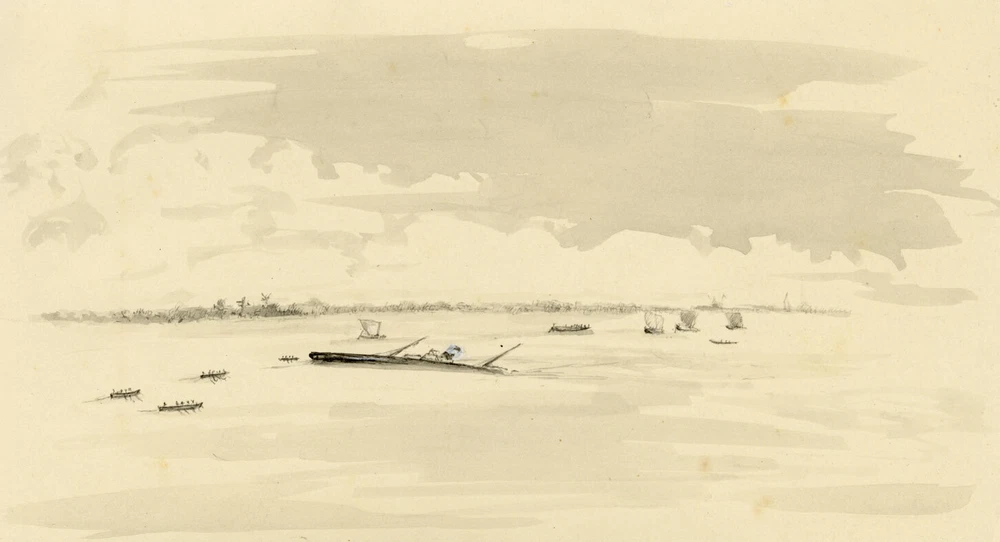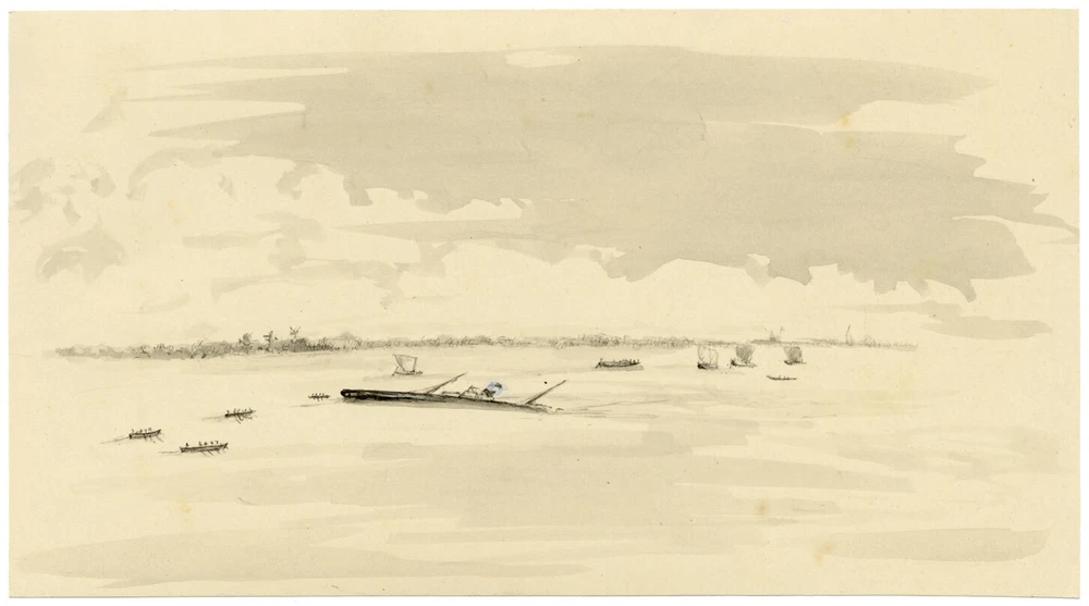 View All Subject Abstract Animals Architectural Botanical Cartoon Children Cityscape | Townscape Decorative Arts Fashion | Costume Floral | Gardens Food | Wine Genre Illustration Landscape Military Music | Instruments Mythical | Fantasy Life Drawing Political Portrait Religious | Inspirational Seascape | Marine Still Life Transport Medium Acrylic Aquatint Chalk Charcoal Engraving Etching Gouache Graphite Linocut Lithograph Mezzotint Mixed Media Oil Pastel Pen & Ink Pith Painting Watercolour Woodblock Woodcut | Wood Engraving M.H. Beattie, British India: Steamship Sinking on the Hooghly – c.1880s drawing An original c.1880s watercolour painting, M.H. Beattie, British India: Steamship Sinking on the Hooghly. An interesting sketch drawn in British India in the late 19th century. The artist is Malcolm Hamilton Beattie (1862–1941), who served with the Hooghly Pilot Service in Bengal from 1878 to 1913. In 1935 Beattie published a book titled 'On the Hooghly', a retrospective account of his time in India, illustrated with drawings which he states were from 'my old sketch books'. One of a collection that we have by the artist, some of the drawings directly correspond to illustrations in the book. Whilst this drawing was not included, it is clear that wrecks in the Hooghly were not infrequent occurrences, due to silting or unexpected objects under the surface. In his role with the Hooghly Pilot Service he was involved in a number of physically and emotionally demanding rescues, not least the loss of the two-masted Anglia in 1892, which he describes as 'probably the most tragic' due to five of the crew being trapped in the 'forecastle' of the ship. Malcolm Hamilton Beattie was born and schooled in the UK, before joining the training ship, Worcester, lying off Greenhithe in 1876, aged fourteen. In 1877 the Indian Government decided to recruit the Bengal Pilot Service from the training ships Worcester and Conway; the following year Beattie sailed for the East on board the P&O Peshawur. In 1887 he married Maria Isabel Lindquist and had four sons born at Calcutta. As was common, the boys were sent to England for their schooling, at Eastbourne College, and by 1935 Malcolm Beattie had also returned to the UK, living at Burntwood, Eastbourne. In watercolour with white bodycolour highlights. Details Signed: No. Inscribed: No. Dated: -- Height (cm): 12.6 Width (cm): 23.3 Height (inches): 4.96 Width (inches): 9.17 Condition: In good condition for its age. The picture may have minor imperfections such as slight marks, toning, foxing, creasing or pinholes, commensurate with age. Please see photos for detail.There are historic adhesive marks and/or paper remnants to the verso, from previous mounting. Presented: Unframed. Stock Number: KB-518 All artworks come with a Certificate of Authenticity and—if it is a collection artwork—its accompanying collection text or artist biography. Contact What We Offer Our Listings About Us Delivery Returns Contact We welcome all enquiries. If you have a question about a specific artwork, it is helpful if you can please quote the 'stock number' listed towards the top of the product description (e.g. JG-347), in order to help identify the work. Please see our Business Seller Information below for contact details. Our gallery is exclusively online. Should you wish to view an artwork in person, please contact us to arrange an appointment (Monday to Friday, 9.30am–5.00pm). Please provide the 'stock number' (e.g. JG-347) of the artworks that you are interested in so that we can get them out of storage for you. As all artworks are kept in storage, please note that general browsing is not possible. The Somerset & Wood Guarantee It is our absolute priority that your buying experience at Somerset & Wood is of the highest quality. This extends from the accuracy of our listings and depth of research, to the diligence of our communication, and the care taken with our packing. We believe that these principles are as important for a low priced artwork as an expensive piece; we are committed to offering affordable art with high 'added value' and to keeping our prices as low as possible. Included with your order you will receive: Certificate of Authenticity (COA) Supplying a COA when selling an artwork is a long-established convention. It is all the more pertinent in today’s online marketplace, where as a buyer you commit to purchase without the opportunity to view and scrutinise the work. By providing a COA with every artwork, backed by our knowledge and expertise, we are vouching that a work is of the stated age and authorship. Accompanying Text for all Collection Works or Listed Artists A printed copy of the accompanying collection text is provided with all artworks that form part of a larger collection, or for listed artists an artist biography is included. This provides 'the story behind the artwork', which can be kept for future reference and enhances the value of an individual piece. Please note that on the rare occasions that an artwork is not part of a collection and has no known artist biography, no text will be included. Free Delivery Worldwide We are pleased to offer Free Delivery Worldwide on every order, regardless of value or destination. Quality Packaging We have the expertise in handling and packing required to ensure your artwork is received in the condition in which it left us. We use high quality envelopes, board, card, tubes and boxes, to give the best possible protection in transit. We believe that receiving a beautifully presented parcel in the post is still one of life’s small pleasures, and we take pride in delivering this experience for our customers. No Quibble Returns We understand that when buying online you do not have the opportunity to scrutinise an artwork in person. We therefore offer complete assurance that you can return the artwork if it does not meet with expectation for any reason. Colour We take care to ensure that our descriptions and imag