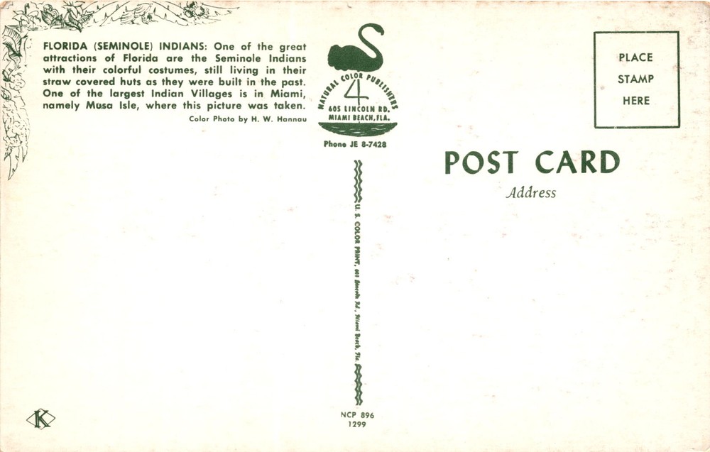 MAKE AN OFFER. THE MORE YOU BUY THE BETTER DEAL I WILL ACCEPT The postcard features a color photo of the Seminole Indians, a Native American tribe in Florida known for their vibrant costumes and traditional lifestyle. The Seminole Indians still live in straw-covered huts, reflecting their historical way of life. The postcard specifically mentions Musa Isle in Miami as one of the largest Indian villages, where the picture was taken.