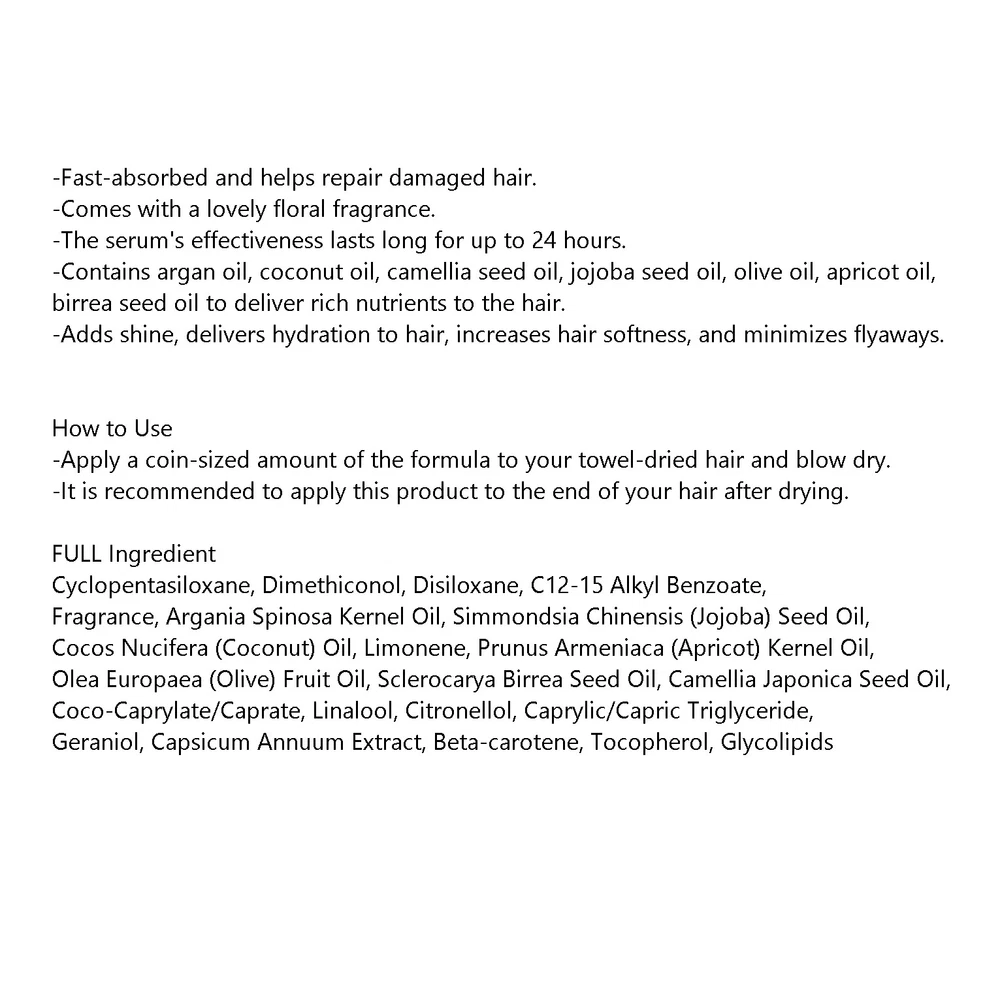 Features: Fine dust blocking effect, Dermatologically Tested Ingredients: Argan Oil, Simmondsia Chinensis (Jojoba) Seed Oil, Dimethiconol, Olea Europaea (Olive) Fruit Oil, Tocopherol, Beta-carotene Styling Effect: Hair Repair Product Line: MISE EN SCENE Perfect Serum Original Active Ingredients: Camellia Japonica Seed Oil, Argania Spinosa Kernel Oil Hair Type: All Hair Types, Damaged Hair Country/Region of Manufacture: Korea, Republic of Scent: Floral MPN: Does not apply Brand: Mise en Scene Formulation: Oil Volume: 2.7 fl oz Type: Serum Size: Standard Size Department: Women