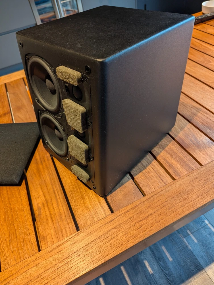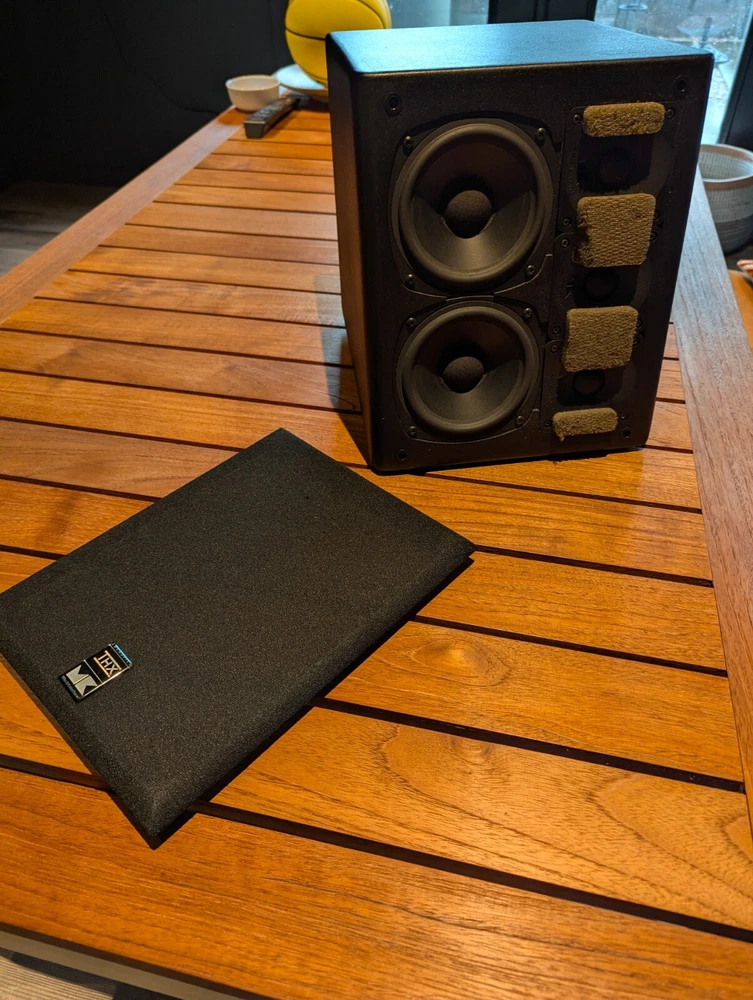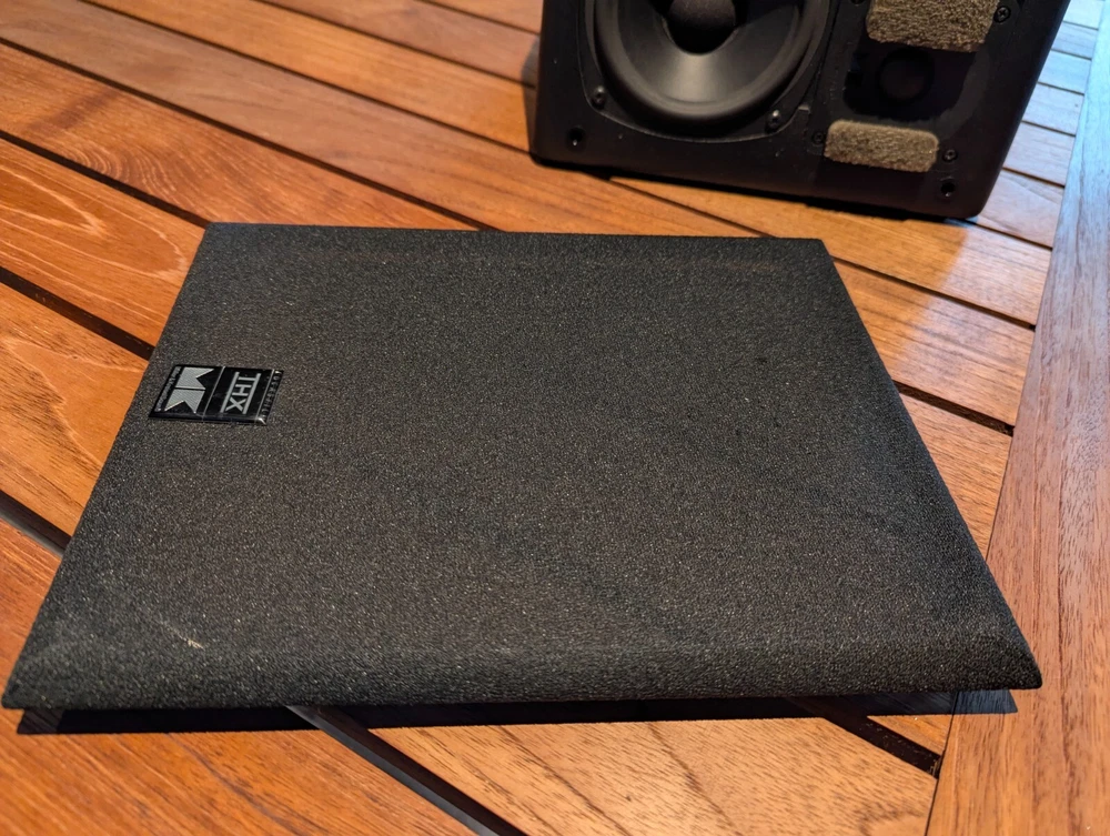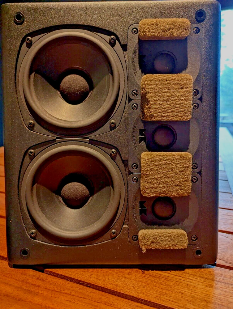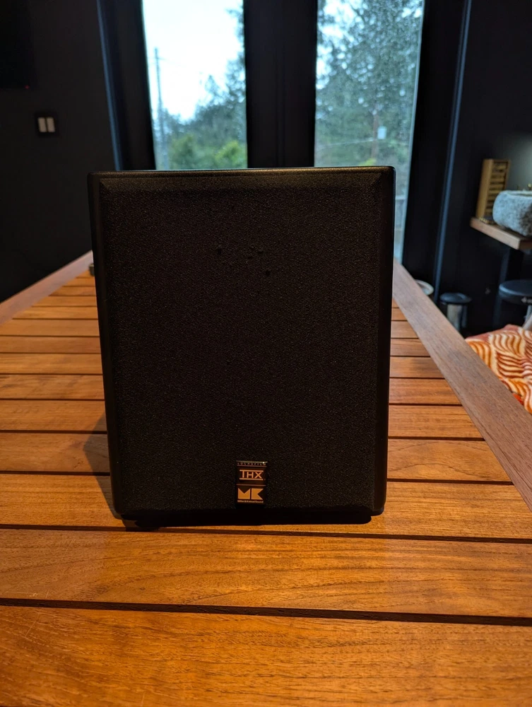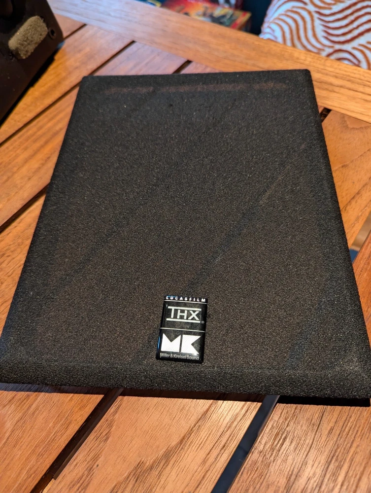 Purchased new in 2001. American Made. Paint is excellent. No chips. Well Cared for. Legendary THX Ultra Certified center channel speaker from the M&K S150 THX lineup. The Miller & Kreisel system has proved to sound natural, dynamic, and detailed in my home theater. It's certainly one of the best I've ever heard. Has built in angle to allow easy placement below or above your listening position for more easier positioning. Includes Two 5¼" midrange drivers, and three 1.1" tweeters with th e goal to make a vertically directional loudspeaker, so that it doesn't cause ceiling and floor reflections. H uge 400W power capacity and THX Ultra specs fills most rooms with sound to reference level. Search and read the original Stereophile Magazine review You can match these speakers with the L and R S150THX speaker, available in toe in angled face, or straight face. " The Angled Center Channel (AC) version of the 150 changes the angle of the face-plate: it rakes back from the top toward the bottom, while the tweeter and midrange arrays remain vertically aligned. This makes the AC-150 easy to focus on the listening position from the top of a large monitor. But turn the speaker upside down, and it becomes simple to focus it upward when the AC-150 is mounted below a screen. The top of the speaker also incorporates a five-degree rake-back to further reduce parallel-wall-induced reinforcement nodes. It's magnetically shielded to simplify top-of-monitor placement. S-150ACTHX center-channel speaker Impedance: 4 ohms Recommended power: 50-400W Frequency response: 82Hz-20kHz, ±2dB Dimensions: 12.5" x 10.5" x 12.25" (HxWxD) Weight: 23 lbs. " S-150ACTHX