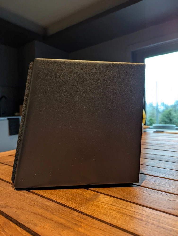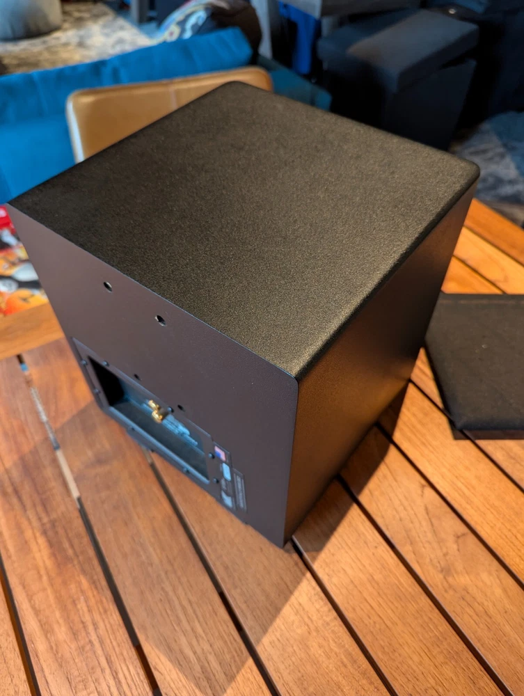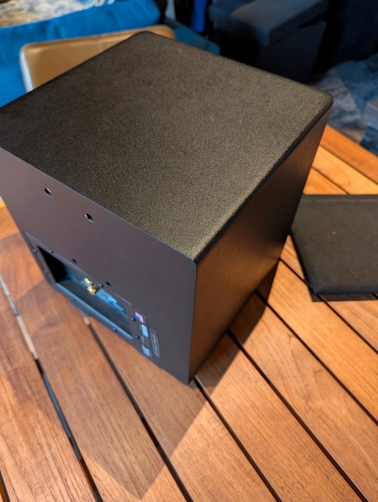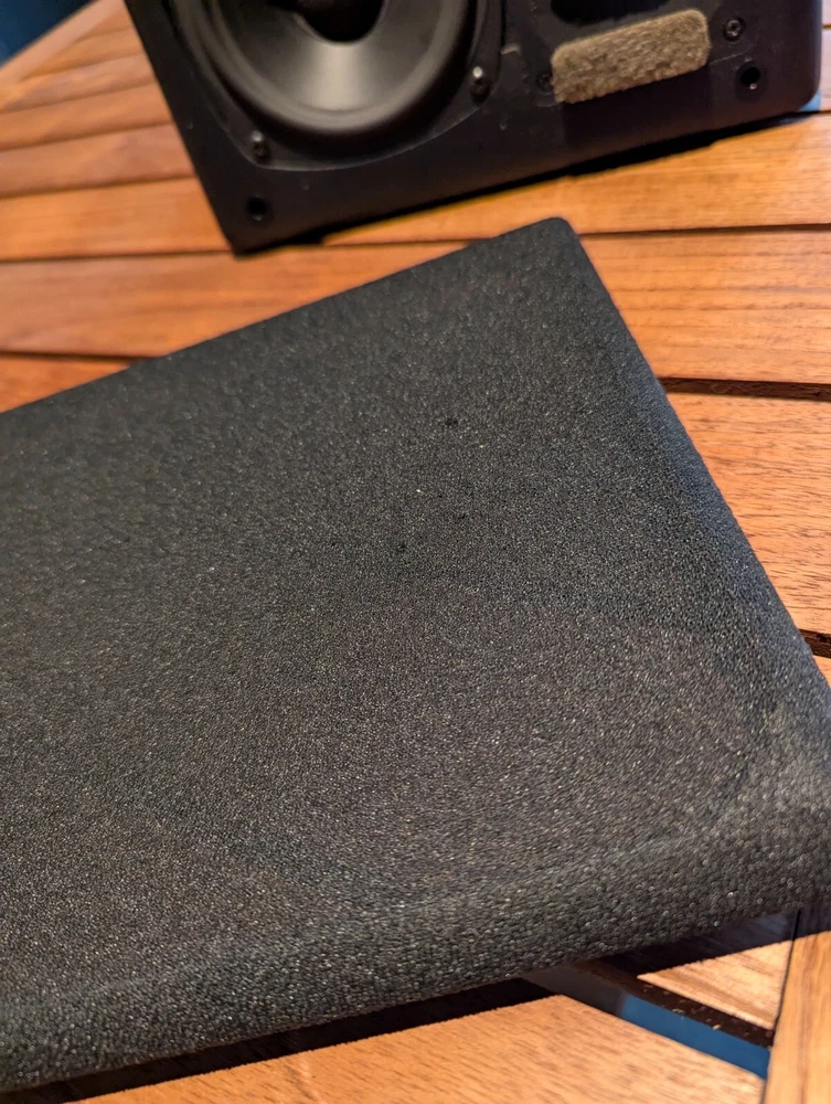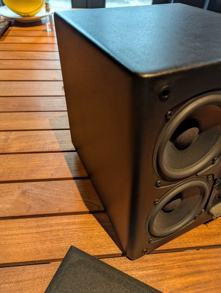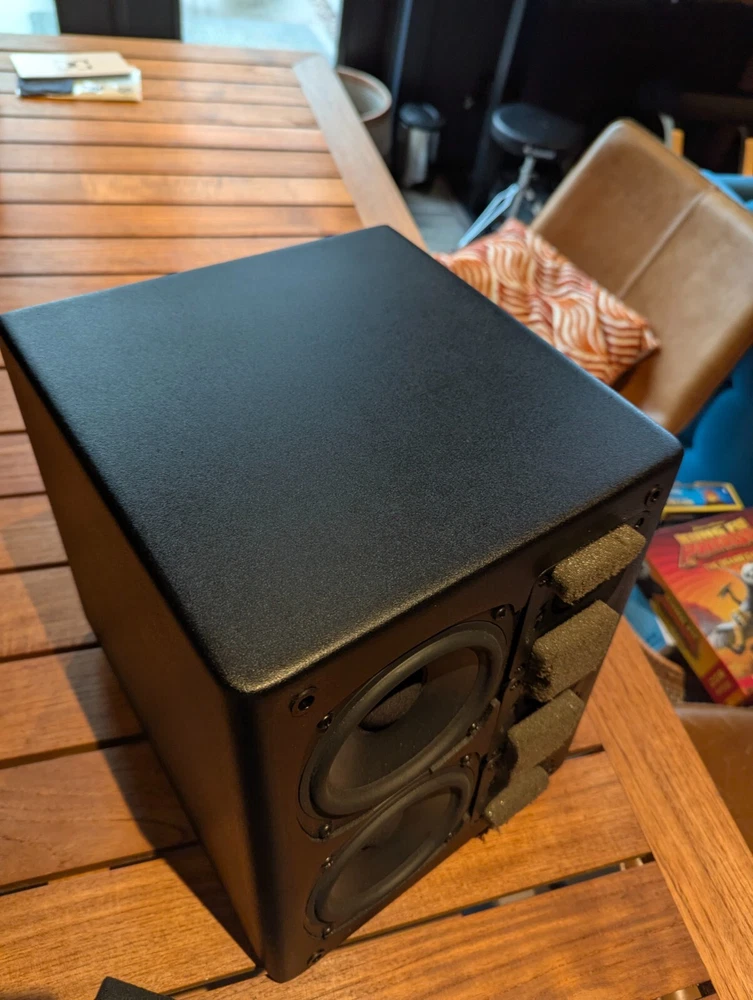 Purchased new in 2001. American Made. Paint is excellent. No chips. Well Cared for. Legendary THX Ultra Certified center channel speaker from the M&K S150 THX lineup. The Miller & Kreisel system has proved to sound natural, dynamic, and detailed in my home theater. It's certainly one of the best I've ever heard. Has built in angle to allow easy placement below or above your listening position for more easier positioning. Includes Two 5¼" midrange drivers, and three 1.1" tweeters with th e goal to make a vertically directional loudspeaker, so that it doesn't cause ceiling and floor reflections. H uge 400W power capacity and THX Ultra specs fills most rooms with sound to reference level. Search and read the original Stereophile Magazine review You can match these speakers with the L and R S150THX speaker, available in toe in angled face, or straight face. " The Angled Center Channel (AC) version of the 150 changes the angle of the face-plate: it rakes back from the top toward the bottom, while the tweeter and midrange arrays remain vertically aligned. This makes the AC-150 easy to focus on the listening position from the top of a large monitor. But turn the speaker upside down, and it becomes simple to focus it upward when the AC-150 is mounted below a screen. The top of the speaker also incorporates a five-degree rake-back to further reduce parallel-wall-induced reinforcement nodes. It's magnetically shielded to simplify top-of-monitor placement. S-150ACTHX center-channel speaker Impedance: 4 ohms Recommended power: 50-400W Frequency response: 82Hz-20kHz, ±2dB Dimensions: 12.5" x 10.5" x 12.25" (HxWxD) Weight: 23 lbs. " S-150ACTHX