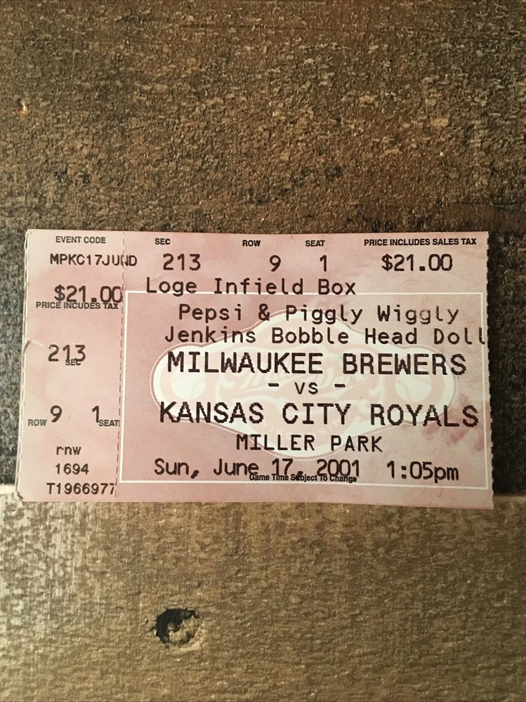 Team-NFL:NAOriginal/Reproduction:OriginalPlayer:Geoff JenkinsTeam-Basketball:NASport:BaseballGrade:UngradedVintage:Yesgtin13:Does not applyCountry/Region of Manufacture:United StatesYear:2001Modified Item:NoTeam-Hockey:NATeam:Milwaukee Brewers vs Kansas City RoyalsTeam-Baseball:Milwaukee BrewersUPC:Does not apply