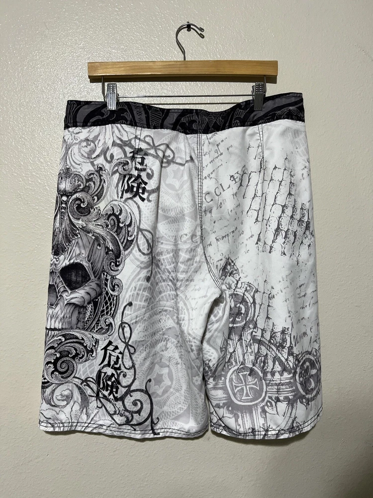 MMA ELITE Mixed Martial Arts Mens Large Board Swim Shorts Y2K White Skull