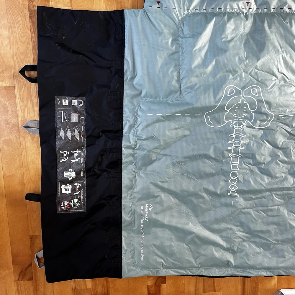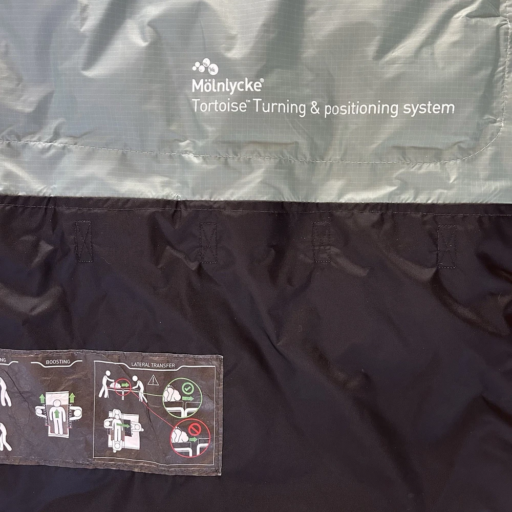 The pre-owned and cleaned; see photo of one small section of stains on right side panel MOLNLYCKE Tortoise Turning & Positioning System is a specialized tool designed for lateral transfer in healthcare settings. With the trusted brand of Molnlycke, this positioning system ensures effective and safe movement of patients, especially during turning and repositioning. This product is essential for maintaining proper alignment and comfort for individuals in need of medical care and attention.