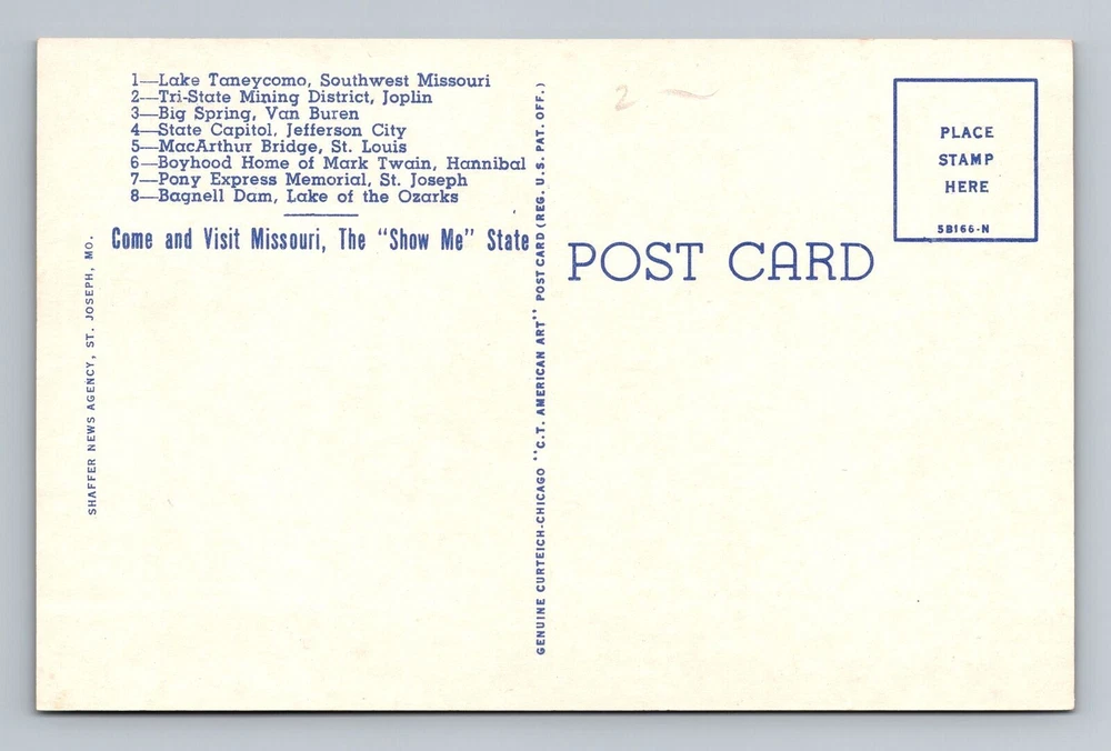Country: USA Type: Printed (Lithograph) Unit of Sale: Single Unit Size: Standard (5.5 x 3.5 in) Subject: Cities & Towns City: Missouri Country/Region of Manufacture: Unknown Theme: Cities & Towns Era: Vintage Material: Paper Postage Condition: Unposted Original/Licensed Reprint: Original Region: Missouri