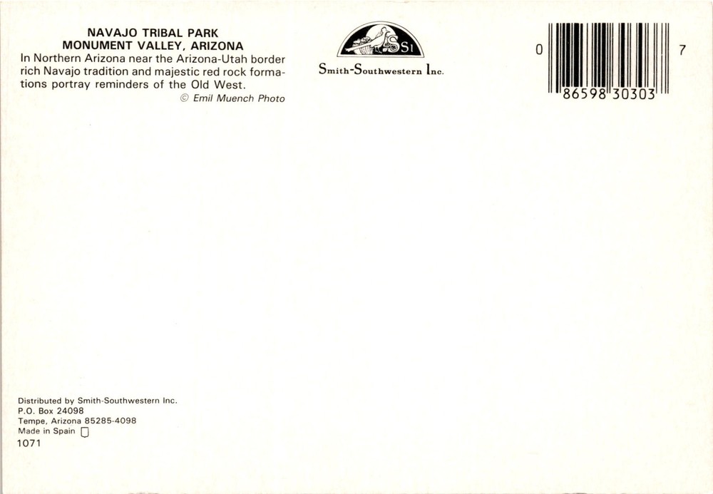 The postcard features Monument Valley Navajo Tribal Park in Arizona, near the Arizona-Utah border. This park is known for its stunning red rock formations that showcase the beauty of the Old West and are significant in Navajo tradition. The park is managed by the Navajo Nation and offers visitors a glimpse into the rich cultural heritage of the Navajo people.