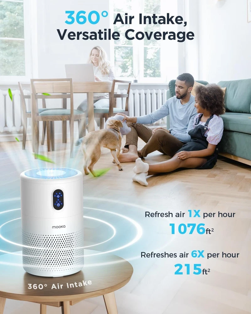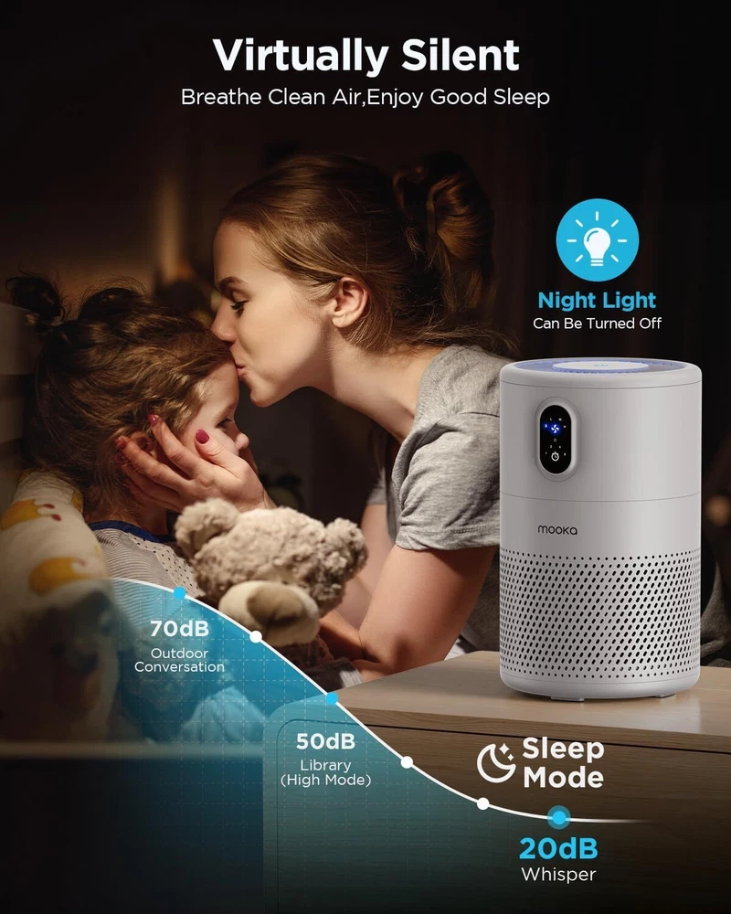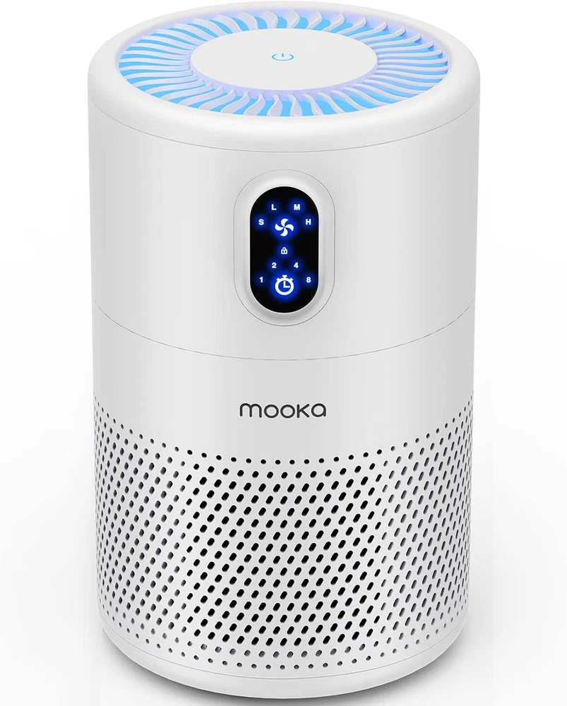 Color White Brand MOOKA Product Dimensions 7.1"D x 7.1"W x 11.1"H Noise Level 20 dB Particle Retention Size 0.3 Micron About this item MOOKA B-D02L AIR PURIFIER FOR LARGE ROOM: With the high-efficiency filtration system, the air purifier covers an area up to 1076 ft². 6 air changes per hour in 215 ft², 1 air changes per hour in 1076 ft². Modern design fits in any space from small to large rooms, bedrooms, living rooms, offices, nurseries, kitchens and basements. Perfect for pet owners, babies, children, the elderly, or anyone wanting to improve the air quality H13 TRUE HEPA AIR PURIFIER: The pre-filter, H13 true HEPA filter and high-efficiency activated carbon filter capture pet hair, dander, smoke, odor, and large dust particles, in addition to removing all airborne contaminants as small as 0.3 microns ULTRA-QUIET, ENERGY-SAVING & SAFE: Thanks to the new brushless motor, the 20dB noise level is almost voiceless. It cleans your air, doesn't affect your work, study or sleep. Running in low power makes it extremely energy-saving. Child lock prevents error operations caused by pets or children. The replacement filter should be replaced every 3-6 months depending on the environment and usage frequency 4 TIMER SETTINGS, 4 FAN MODES, AND NIGHT LIGHT: 4 timer options (1H/2H/4H/8H) allow you set the air purifier operating time. Adjust the required fan speed mode (Sleep/Low/Med/High) to capture as much air pollutants as required. Soft night light, that prevents falls, can be turned off to enjoy the perfect dreaming. Press the top power button for 3 seconds to turn ON/OFF the night light when the machine is running On Feb 20, 2025 at 00:54:23 PST, seller added the following information: