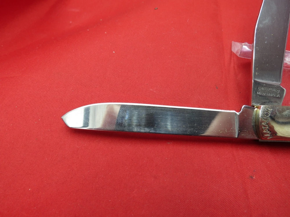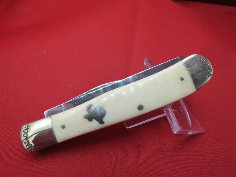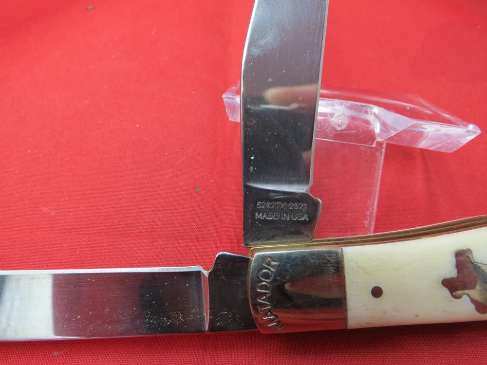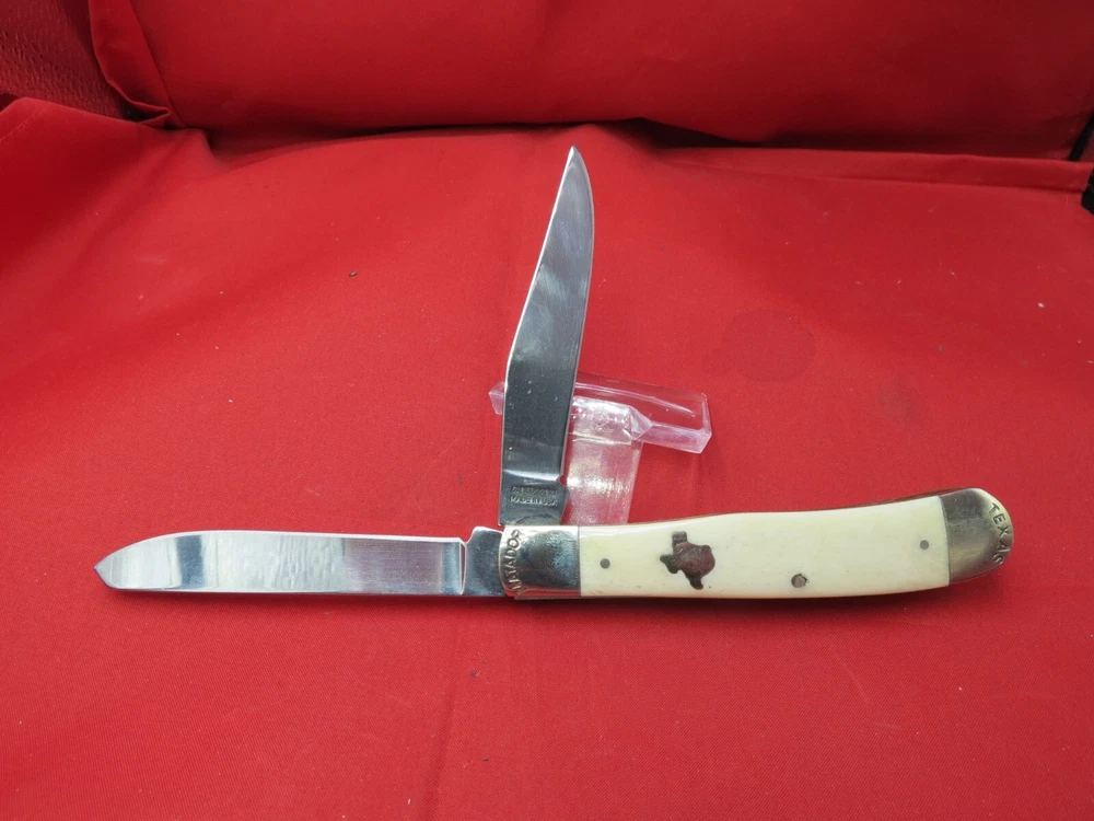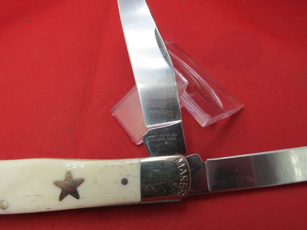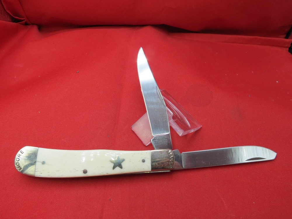 095 HC steel hardened to 56+/- 1 Rockwell Smooth Bone handles Moore Maker Stamped in Bolsters / Brass Liners Texas Shield on one side Lone Star on the other 4-1/8 inches closed WE KNOW YOU HAVE A CHOICE WHERE YOU SHOP… THANKS FOR SHOPPING WITH US AT NO PRESSURE SALES,LLC PLEASE BE SURE AND VISIT OUR OTHER ITEMS Thanks for looking YOU WILL RECEIVE THE ITEM PICTURED UNLESS IT IS A MULTIPLE LISTING OR OTHERWISE STATED.ALL BONE KNIVES COME FROM BOVINE (COW) BONE UNLESS OTHERWISE STATED !!