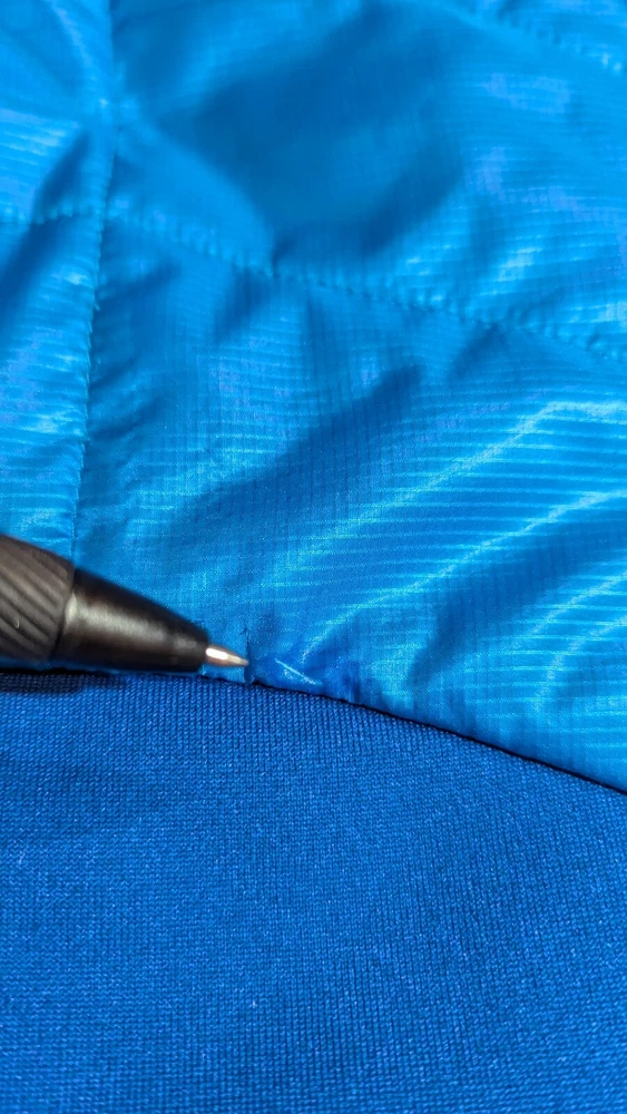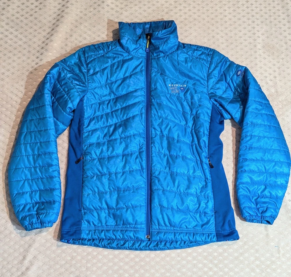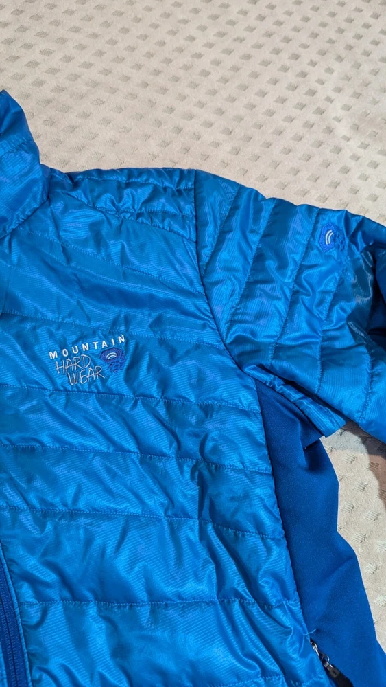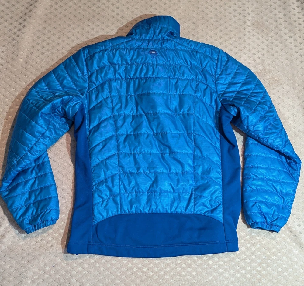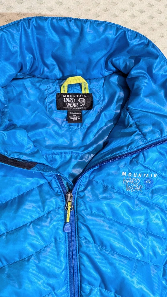 Mountain Hardwear puffer jacket men's size large. I found this jacket second hand. Measurements are; collar seam to bottom 28 inches, underarm to underarm 24 inches, underarm to cuff 23 inches, sleeve length 35.5 inches (measured mid collar out shoulder to end of cuff).