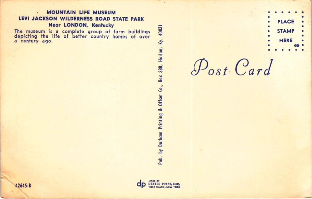 The postcard features the Mountain Life Museum located at Levi Jackson Wilderness Road State Park near London, Kentucky. The museum showcases a collection of farm buildings that provide a glimpse into the lifestyle of rural homes from over a century ago.