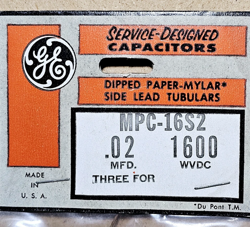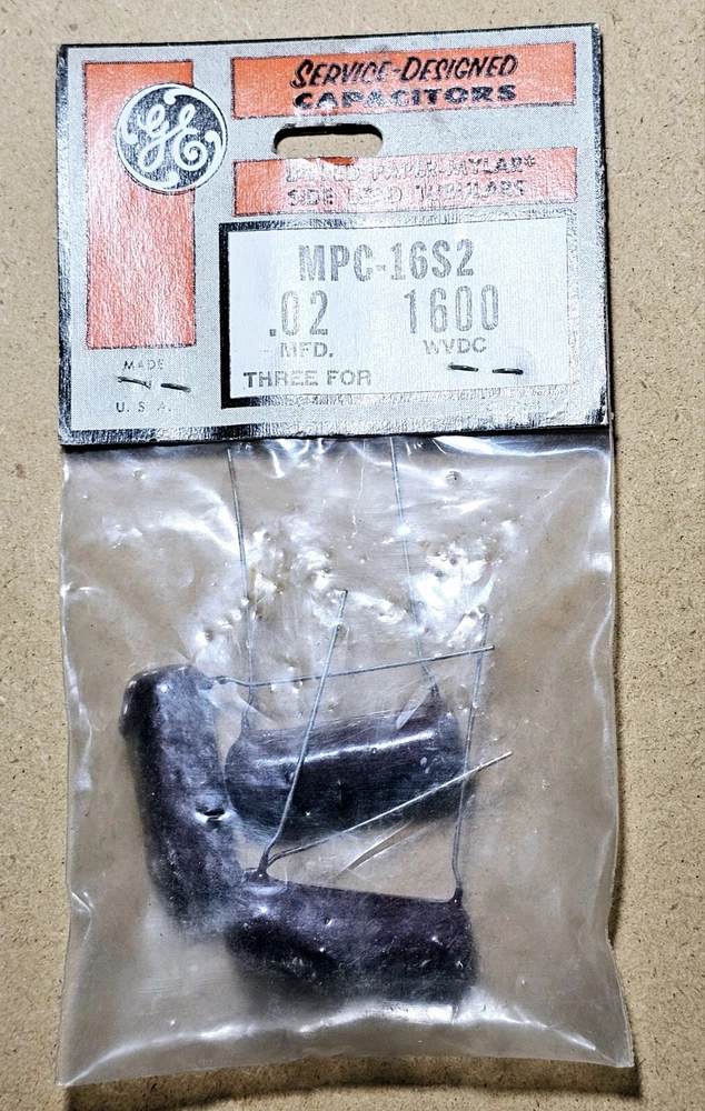 MPC-16S2 .02 10% 1600 V GE Capacitors Dipped Paper-Mylar Side Long Leads New 3 capacitors in bag, sealed. Please review pictures before purchasing to better understand the condition of the items. This Cornell Dubilier MPC-16S2 capacitor pack features eight fixed type capacitors made of Mylar material with a nominal capacitance of .027mfd and a tolerance rating of ±0.2%. Each capacitor has a working voltage of 1600 and a maximum operating voltage of 1600 V. The minimum operating voltage is 600 V. The capacitor construction is made of Polyester Film with long leads. This 8-pack comes in a bag packaging and is made in the United States. It is suitable for use in electronic components and semiconductors. Please note that this product contains a California Prop 65 Warning.