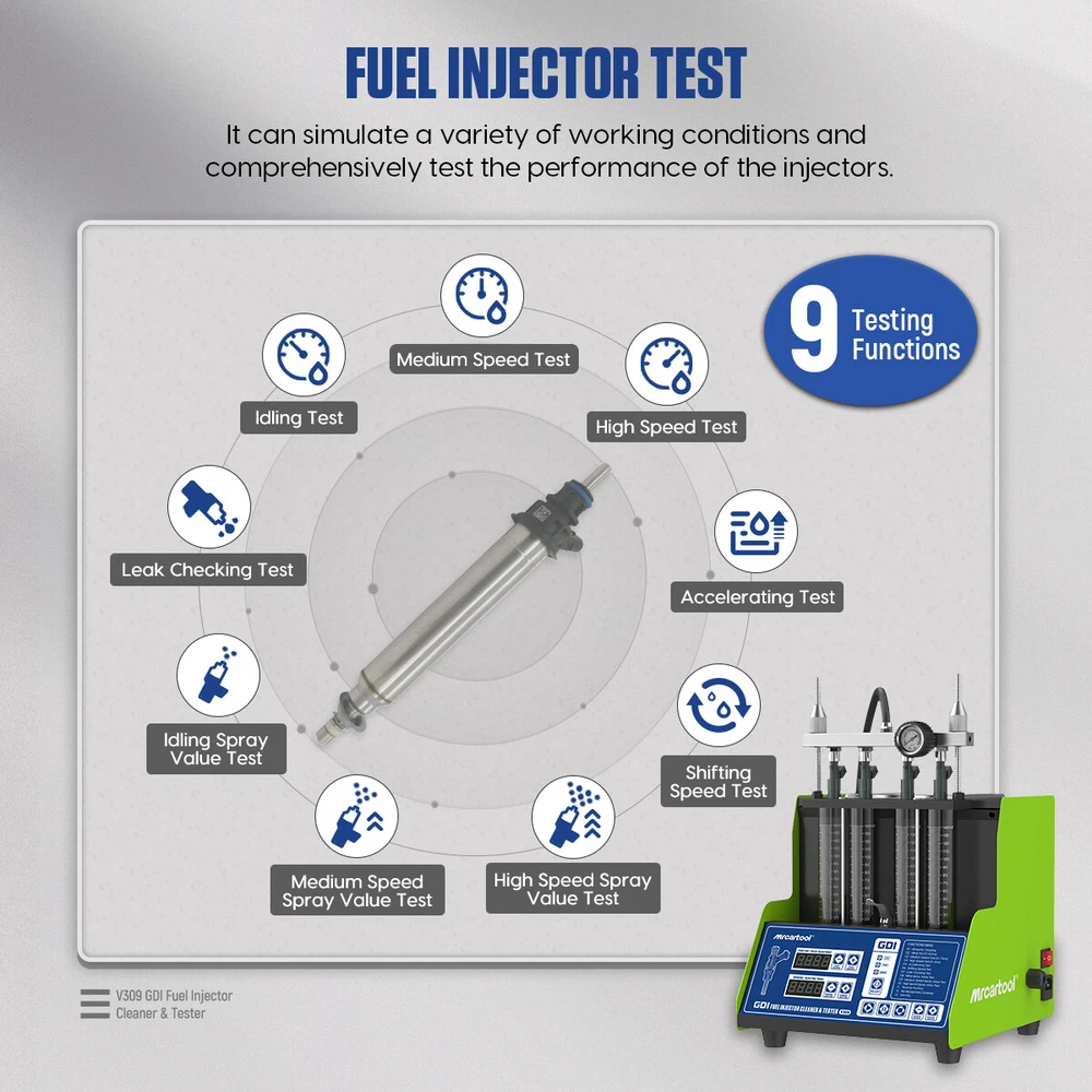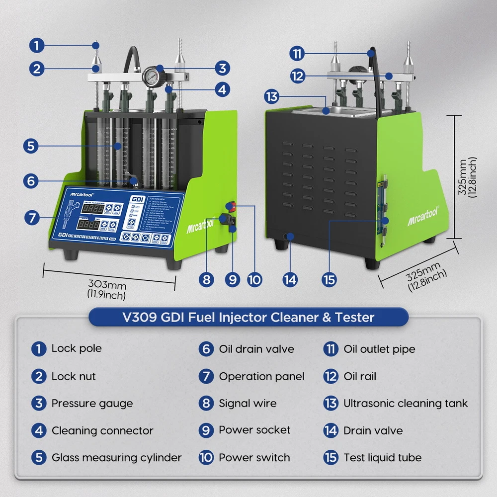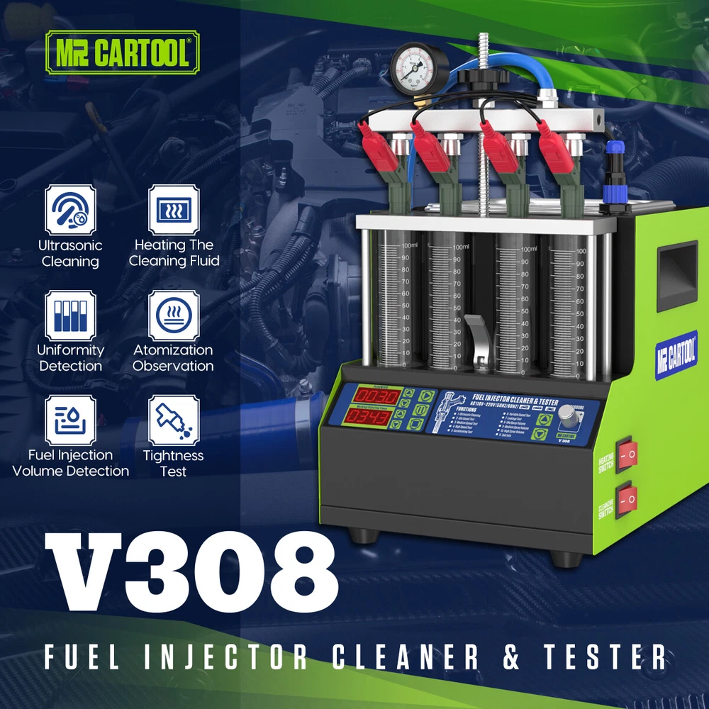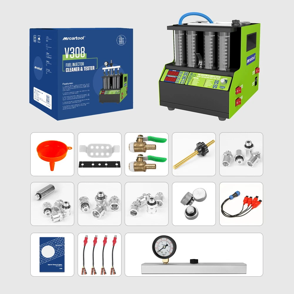 MRCARTOOL® GDI Injector Cleaner & Tester Fuel System Cleaning Machine 6-Cylinder MRCARTOOL V310 GDI Fuel Injector Cleaner & Tester It can clean and test not only standard injectors but also GDI injectors including compatible for Mercedes-Benz, BMW, AUDI, PorscheFord and other direct injection engines.It comes with multi voltages available for GDI injectors, which enables to adapt for different types of injector testing. Function Ultrasonic cleaning: Ultrasonic cleaning can be performed on single or multiple injectors at the same time, which can remove the attachments and internal block ages on the injectors. Uniformity detection: to detect the uniformity of the injection volume of each injector. Atomization observation: Using the background light, you can observe the spray atomization situation of the nozzle in a comprehensive and careful manner. Tightness test: It can detect the tightness and dripping of the fuel injector under high pressure. Fuel injection volume detection: It can detect the fuel injection volume of the fuel injection nozzle under specific working conditions (such as the same time and the same number of times). It has replaceable composite joints suitable for a variety of vehicle types. Support 6-cylinders ultrasonic cleaning,2000ml tank capacityyou can use clean injector or other tool. Bright background light, you can clearly see the various situations of the fuel injector when it is working. Power SupplyAC 110/220V±10% Frequency50HZ±0.5 Relative Humidity<85% Environment Temperature040 External Magnetic Field Strength<400A/m No Open Flames Are Allowed Tank Capacity2000 ml Range Of Rotation0-7500r/min PWM Pulse Width020.0ms step0.1ms Time010min Cleaning Frequency40 kHz Cylinder Volume180 ml Injection Times09900 times, step 100ms System Pressure00.6Mpa Ultrasonic Cleaning Power70W Package Dimensions340*295*360mm MRCARTOOL V308 Car Fuel Injector Tester Cleaner is a professional 4 cylinders auto fuel injector testing cleaning machine. It will help us clean and test the injectors of gasoline cars and motorcycles. Support for more cars and motorcycles.And Can only be used to clean diesel fuel injectors .The cleaning fluid is 3M car injector cleaning fluid, and the test fluid is industrial alcohol. Product Adavantage: 1. The volume and weight are portable, easy to carry, only 8KG 2. The fuel tank has a larger capacity, the 1300ml fuel tank has a large capacity, allowing you to clean it all at once 3. Ultrasonic cleaning fluid can be heated to 45, the cleaning effect is better 4. Aluminum alloy material: light weight, high strength, good airtight performance, corrosion resistance, convenient use and maintenance, strong and durable, corrosion resistance, high use value. Function: Uniformity/Sprayability Test: Under this function, the parameters of RPM, PW and time can be adjusted in real time. Leakage Test: Under this function, the parameter of fuel pressure can be adjusted in real time. Injecting Flow Test: Under this function, the parameter of fuel pressure can be adjusted in real time. Auto mode Test: Under this function, the parameter of fuel pressure can be adjusted in real time. Features: 1. [Wide range of application] :V308 Car Fuel Injector Tester Cleaner has a good compatibility. Support for more cars and motorcycles to ‘clean’ and ‘test’ fuel injector. And also can be used to ‘clean’ diesel fuel injectors. 2. [Easy operation] :When cleaning, fix the car injector in the socket of the washing tank, add an appropriate amount of 3M cleaning fluid, and the cleaning can be completed after power on; when testing, fix the car injector in the oil separator and add it to the glass tube Industrial alcohol, the test can be completed after power on. 3. [Leading technology] :At present, only our company produces this portable and multi-functional automobile fuel injector cleaning and testing machine, and it has obtained a special patent. 4. [Safety]:Its working voltage range is 110-230V. When the machine is short-circuited, the fuse inside will automatically trip to shut down the running machine to prevent electric shock. Working environment: Power supply: AC 110V±10% Frequency: 50HZ±0.5 Relative humidity: <85% Environment temperature: 0-40℃ External magnetic field strength: <400A/m No open flames are allowed around Technical parameters: Tank capacity:2000 ml Range of rotation:0-7500r/min PWM pulse width:020.0ms step0.1ms Time:020min Cleaning frequency:40 kHz Cylinder volume:100 ml Injection times:0-9900 times, step 100ms System pressure:0-0.6Mpa Ultrasonic cleaning power:70W Package dimensions:340*295*360mm Payment Delivery details Terms of sales About us Contact us Payment We only accept PayPal payments. Payment should be made within 5 days after bidding ends. We are not responsible for buyers' local taxes. (1) Import duties, taxes and charges are not included in the item price or shipping charges. These charges are the buyer responsibility. (2)Please check with your country customs office to determine what these additional costs will be prior to bidding / buying. Delivery details We only ship parcel to the address in eBay payment. (1)Please make sure payment address in eBay is correct. (2)Please be known that different shipping service means different shipping charge and shipping time!!! (3)All packages will be added with a tracking number after shipping. Terms of sales (1)Item may be returned for refund or replacement within 30 days of the purchase date. Returned merchandise must be unused, in original packaging and include all accessories. Shipping costs are non-refundable. (2)Defective products may be returned for repair up to 1 year from the purchase date. Repairs will be processed through the manufacturer, we will assist in the repair procedure in any way we can to expedite the process. (3)Before any return, a Return Merchandise Authorization (RMA ) must be obtained by contacting the seller. Any products returned to us without an RMA will be sent back to