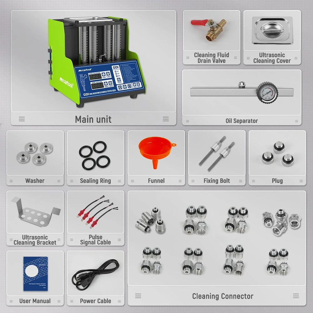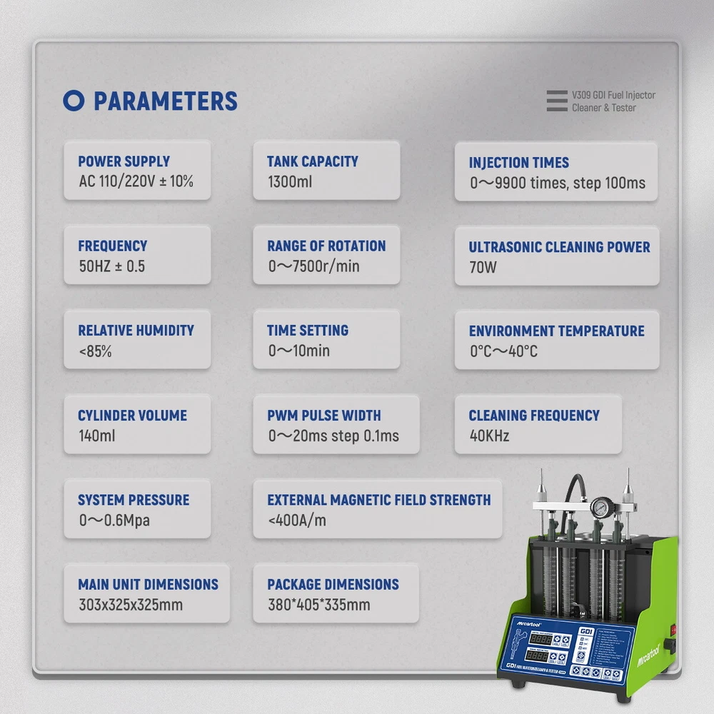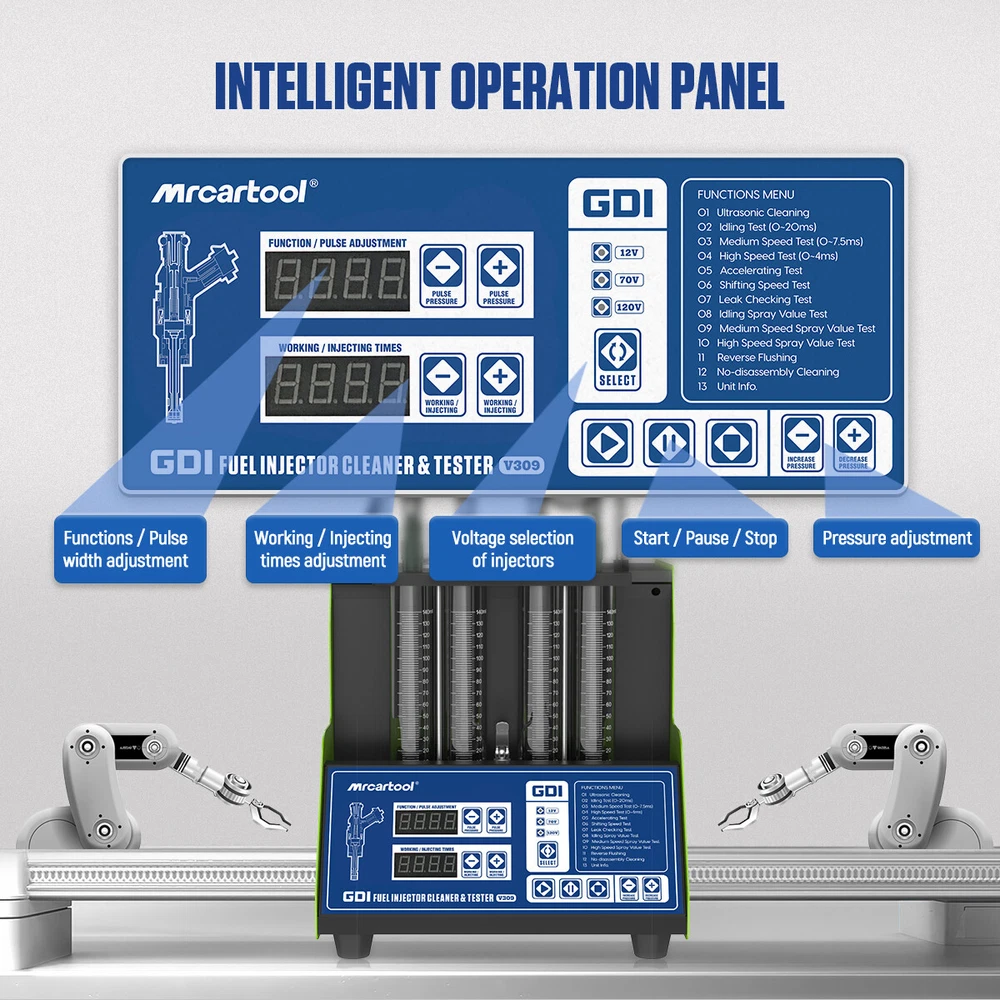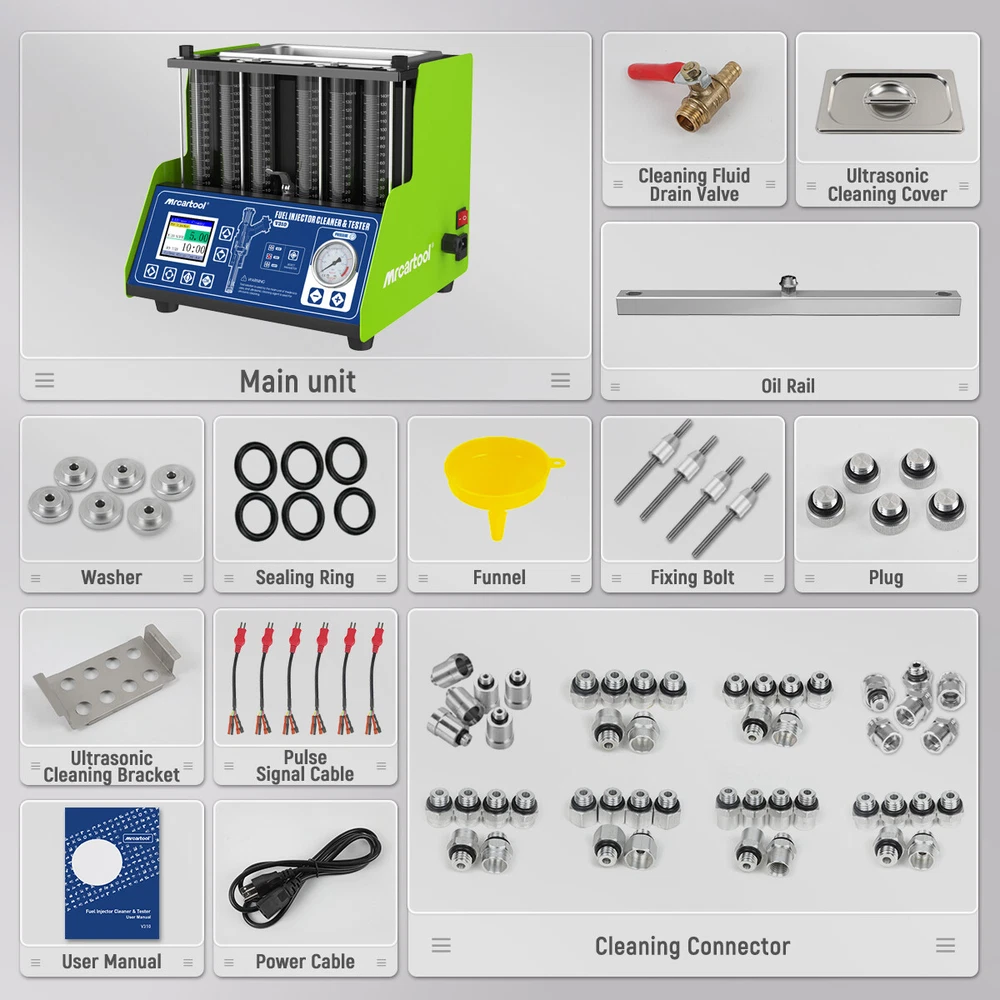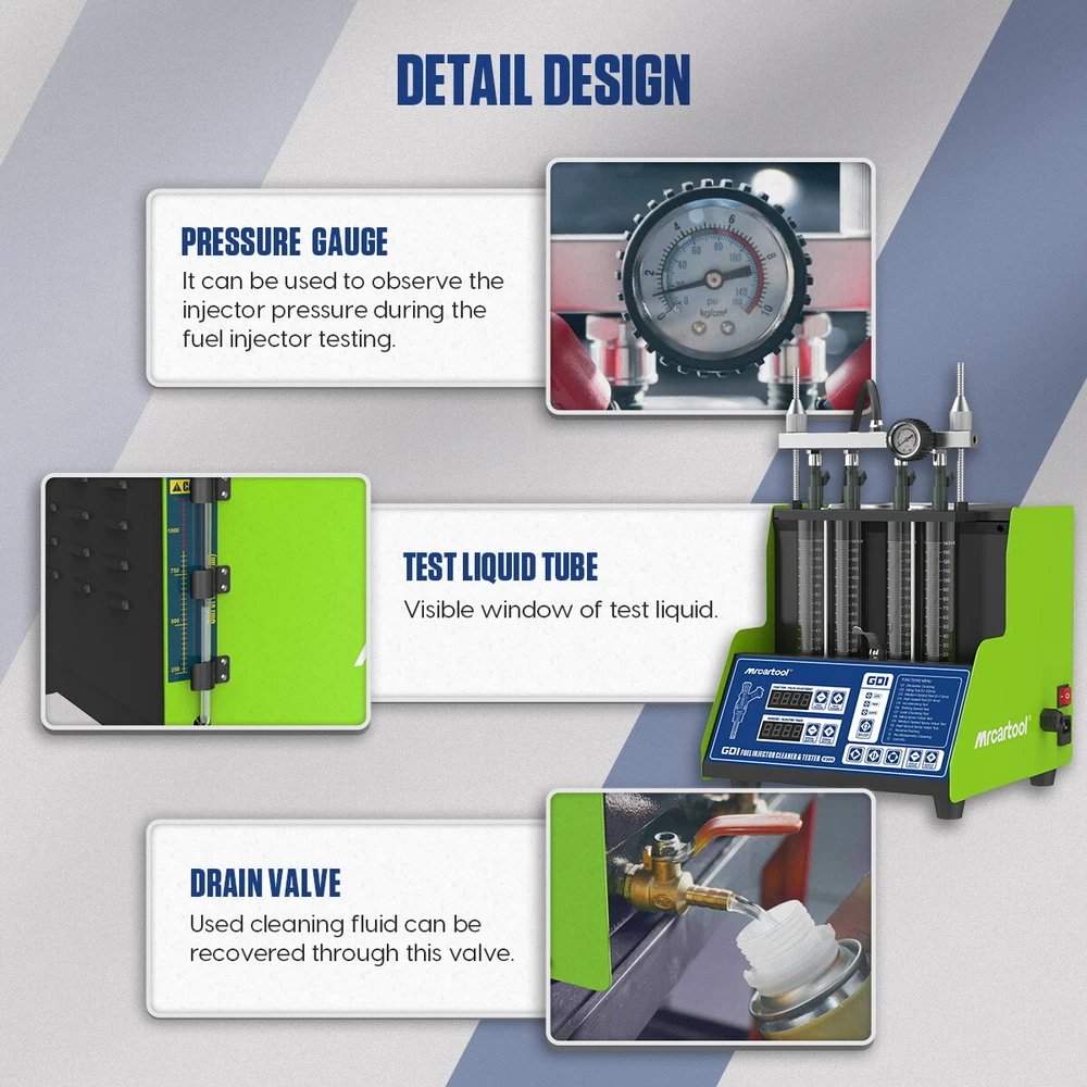 MRCARTOOL® GDI Injector Cleaner & Tester Fuel System Cleaning Machine 6-Cylinder MRCARTOOL V310 GDI Fuel Injector Cleaner & Tester It can clean and test not only standard injectors but also GDI injectors including compatible for Mercedes-Benz, BMW, AUDI, PorscheFord and other direct injection engines.It comes with multi voltages available for GDI injectors, which enables to adapt for different types of injector testing. Function Ultrasonic cleaning: Ultrasonic cleaning can be performed on single or multiple injectors at the same time, which can remove the attachments and internal block ages on the injectors. Uniformity detection: to detect the uniformity of the injection volume of each injector. Atomization observation: Using the background light, you can observe the spray atomization situation of the nozzle in a comprehensive and careful manner. Tightness test: It can detect the tightness and dripping of the fuel injector under high pressure. Fuel injection volume detection: It can detect the fuel injection volume of the fuel injection nozzle under specific working conditions (such as the same time and the same number of times). It has replaceable composite joints suitable for a variety of vehicle types. Support 6-cylinders ultrasonic cleaning,2000ml tank capacityyou can use clean injector or other tool. Bright background light, you can clearly see the various situations of the fuel injector when it is working. Power SupplyAC 110/220V±10% Frequency50HZ±0.5 Relative Humidity<85% Environment Temperature040 External Magnetic Field Strength<400A/m No Open Flames Are Allowed Tank Capacity2000 ml Range Of Rotation0-7500r/min PWM Pulse Width020.0ms step0.1ms Time010min Cleaning Frequency40 kHz Cylinder Volume180 ml Injection Times09900 times, step 100ms System Pressure00.6Mpa Ultrasonic Cleaning Power70W Package Dimensions340*295*360mm MRCARTOOL V308 Car Fuel Injector Tester Cleaner is a professional 4 cylinders auto fuel injector testing cleaning machine. It will help us clean and test the injectors of gasoline cars and motorcycles. Support for more cars and motorcycles.And Can only be used to clean diesel fuel injectors .The cleaning fluid is 3M car injector cleaning fluid, and the test fluid is industrial alcohol. Product Adavantage: 1. The volume and weight are portable, easy to carry, only 8KG 2. The fuel tank has a larger capacity, the 1300ml fuel tank has a large capacity, allowing you to clean it all at once 3. Ultrasonic cleaning fluid can be heated to 45, the cleaning effect is better 4. Aluminum alloy material: light weight, high strength, good airtight performance, corrosion resistance, convenient use and maintenance, strong and durable, corrosion resistance, high use value. Function: Uniformity/Sprayability Test: Under this function, the parameters of RPM, PW and time can be adjusted in real time. Leakage Test: Under this function, the parameter of fuel pressure can be adjusted in real time. Injecting Flow Test: Under this function, the parameter of fuel pressure can be adjusted in real time. Auto mode Test: Under this function, the parameter of fuel pressure can be adjusted in real time. Features: 1. [Wide range of application] :V308 Car Fuel Injector Tester Cleaner has a good compatibility. Support for more cars and motorcycles to ‘clean’ and ‘test’ fuel injector. And also can be used to ‘clean’ diesel fuel injectors. 2. [Easy operation] :When cleaning, fix the car injector in the socket of the washing tank, add an appropriate amount of 3M cleaning fluid, and the cleaning can be completed after power on; when testing, fix the car injector in the oil separator and add it to the glass tube Industrial alcohol, the test can be completed after power on. 3. [Leading technology] :At present, only our company produces this portable and multi-functional automobile fuel injector cleaning and testing machine, and it has obtained a special patent. 4. [Safety]:Its working voltage range is 110-230V. When the machine is short-circuited, the fuse inside will automatically trip to shut down the running machine to prevent electric shock. Working environment: Power supply: AC 110V±10% Frequency: 50HZ±0.5 Relative humidity: <85% Environment temperature: 0-40℃ External magnetic field strength: <400A/m No open flames are allowed around Technical parameters: Tank capacity:2000 ml Range of rotation:0-7500r/min PWM pulse width:020.0ms step0.1ms Time:020min Cleaning frequency:40 kHz Cylinder volume:100 ml Injection times:0-9900 times, step 100ms System pressure:0-0.6Mpa Ultrasonic cleaning power:70W Package dimensions:340*295*360mm Payment Delivery details Terms of sales About us Contact us Payment We only accept PayPal payments. Payment should be made within 5 days after bidding ends. We are not responsible for buyers' local taxes. (1) Import duties, taxes and charges are not included in the item price or shipping charges. These charges are the buyer responsibility. (2)Please check with your country customs office to determine what these additional costs will be prior to bidding / buying. Delivery details We only ship parcel to the address in eBay payment. (1)Please make sure payment address in eBay is correct. (2)Please be known that different shipping service means different shipping charge and shipping time!!! (3)All packages will be added with a tracking number after shipping. Terms of sales (1)Item may be returned for refund or replacement within 30 days of the purchase date. Returned merchandise must be unused, in original packaging and include all accessories. Shipping costs are non-refundable. (2)Defective products may be returned for repair up to 1 year from the purchase date. Repairs will be processed through the manufacturer, we will assist in the repair procedure in any way we can to expedite the process. (3)Before any return, a Return Merchandise Authorization (RMA ) must be obtained by contacting the seller. Any products returned to us without an RMA will be sent back to