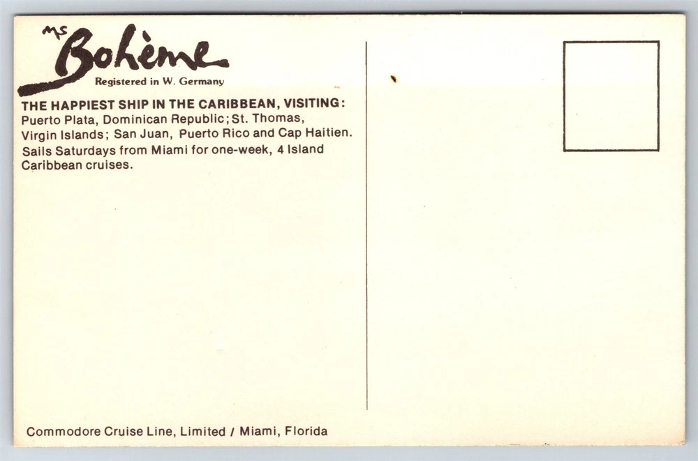 MS Boheme Caribbean Cruise Ship The Happy Ship Postcard M10 Thank you for visiting! This is a standard size postcard, 3.5" X 5.5". In stock, usually ships within 24 hours of your purchase. Please ask questions if you are unsure about anything. Our goal is for your complete satisfaction with the postcard and your experience. Check all my other listings in my store. RETIREDWITHBOOKS Powered by SixBit's eCommerce Solution
