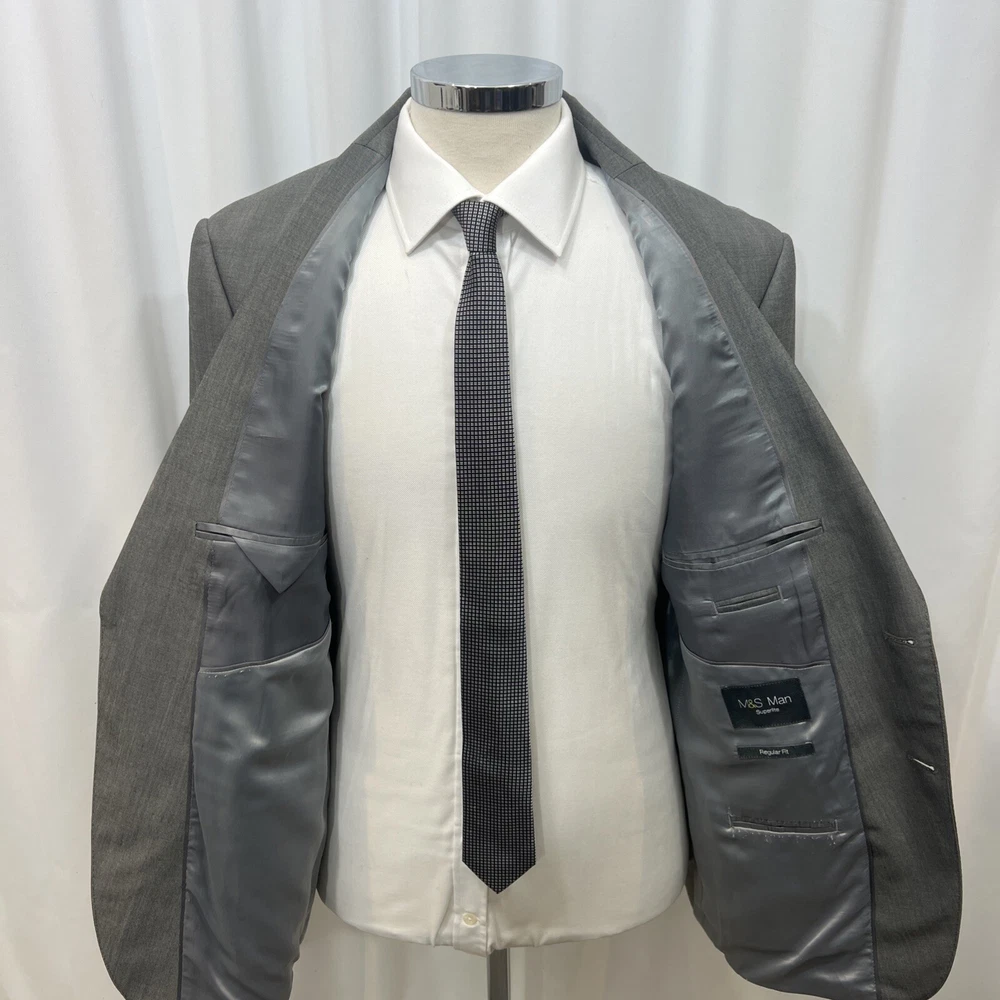 M&S MAN SUPERLITE Grey Wool Blend Regular Fit 2 Piece Suit Material 55% polyester 45% wool Jacket Features Chest: 42M" Inside pockets: 3 Front pockets: 2 Breast pocket: 1 Buttons to each cuff: 4 Buttons to front: 2 Back vents: 2 Shoulder to cuff: 25" Armpit to cuff: 17" Armpit to armpit when laid flat: 22" Shoulder to shoulder: 18" Collar to hem: 31" Trouser Features Waist: 38" Zip Front pockets Back pocket: 1 with button 0 button & 2 hook fastenings Inside leg: 31" (cannot drop) Width of hem at bottom of trousers: 8 3/4" AKD0015-558 Please note: Colours may slightly vary due to lighting conditions Each item undergoes meticulous hand-measured scrutiny; sizes may not align precisely with the label Review measurements and review the item description/photos before placing your bid Unfortunately, we cannot provide additional photos once items are listed The shirt and tie are not included unless explicitly stated in the listing Questions and concerns: Reach out to us through the ebay messaging system - we aim to respond within a maximum of 12 hours Ironing guidelines: Garments may arrive with minor creases Refer to the care label and use continuous steam when ironing We recommend dry cleaning for best results and peace of mind Your feedback matters: Please leave us a 5-star rating if satisfied For issues or concerns, please contact us before leaving feedback Returns: We offer a generous 30-day return period, via the eBay returns centre Please return items in their original packaging with all tags attached Buyers cover return shipping costs unless items are faulty or inaccurately listed