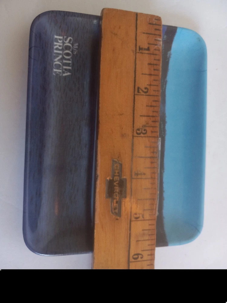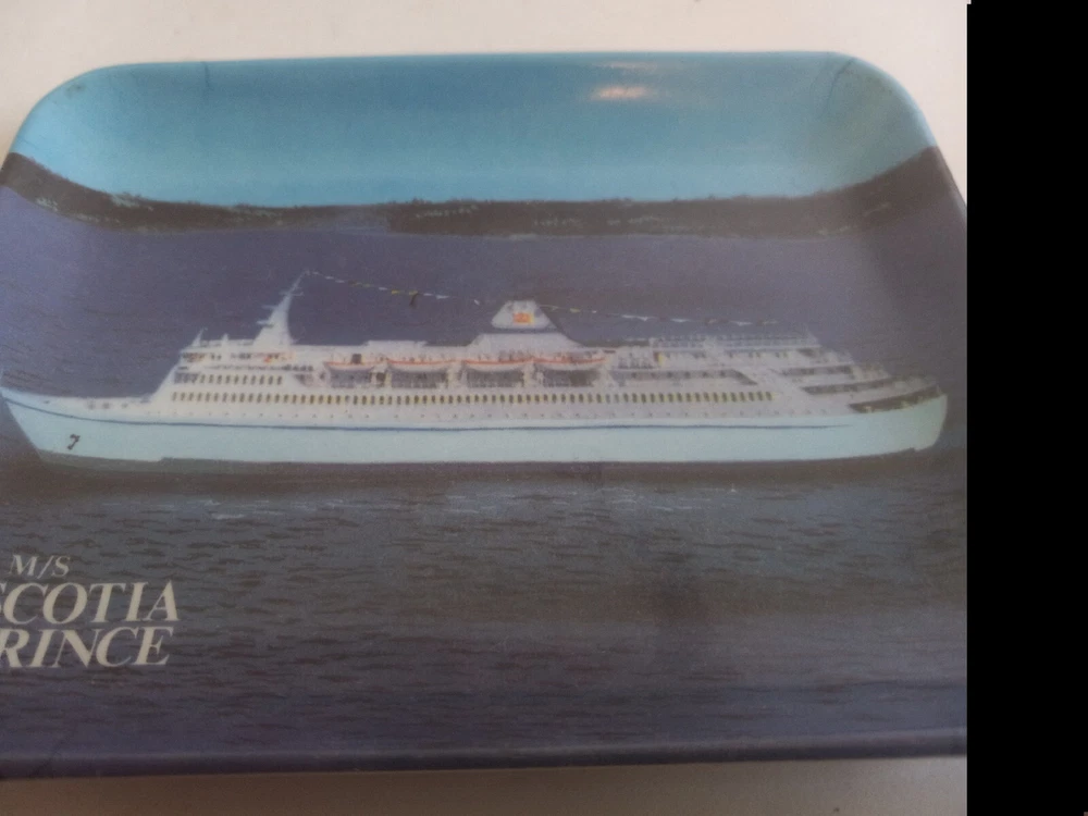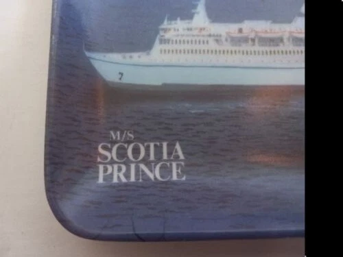 M/S Scotia Prince Cruise Ship collectible souvenir tray melamine 90s Shallow rectangle tray that measures approximately 6x4". Vintage made in the 1990's. Image of cruise ship on rectangle tray. Great for collecting, jewelry, trinkets, rings, rolling. There is a made in Taiwan sticker on the back as well as a portion of and residue from the original price tag. E2