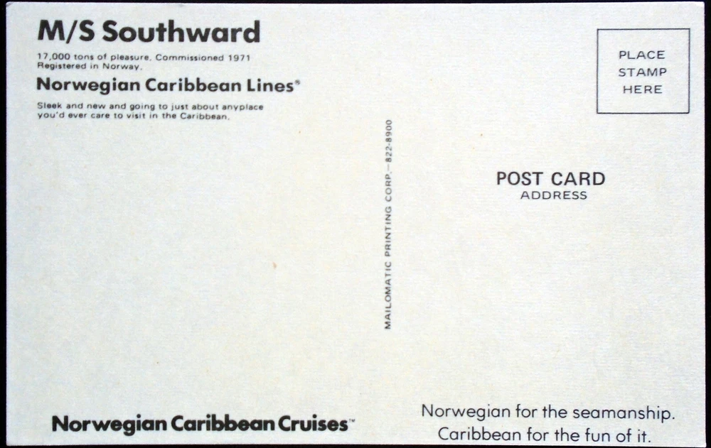 10006. CATEGORY : Transportation TYPE : Color Postcard (Standard; Chrome) DESCRIPTION : Back: “M/S Southward, 17,000 tons of pleasure. Commissioned 1971. Registered in Norway. Norwegian Caribbean Lines. Sleek and new and going to just about anyplace you’d ever care to visit in the Caribbean.” CONDITION : Unused; never mailed . … Minor corner and edge wear. Light soiling and age tanning. Very Good condition… Sold AS IS. Look carefully at the pictures to Judge Condition for Yourself. Please pay for your order after Combining ALL ITEMS on one invoice! This saves both of us money! You save on S/H charges and I save on fees! Thank you kindly, Judy & George …. If you plan to purchase multiple items, just put all the items you want into your Ebay cart, then press “REQUEST TOTAL” and I will be able to invoice you with combined shipping. Make sure you’re purchasing via computer, as this option is not available when buying with your phone. Once you have purchased an item and we have wrapped it for shipping, additional items CANNOT be added, and must be shipped separately. I offer and accept other payment options, besides PayPal, for those who do not have such an account. All books are protected by a moisture seal, bubble wrap, and they are packaged in a cardboard carton for added protection. All postcards, vintage paper items and historical memorabilia are packaged with stiff cardboard and marked “Do Not Bend”.