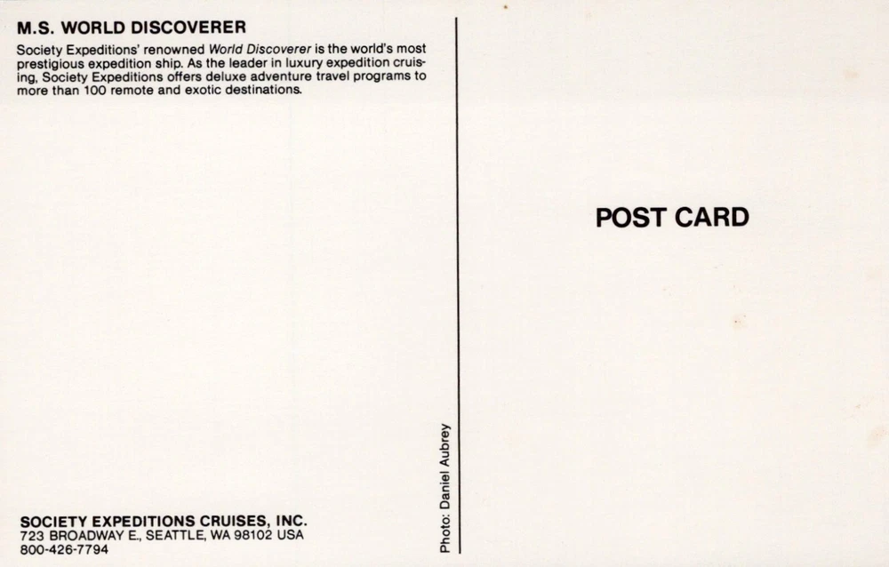 MS World Discoverer World's Most Prestigious Expedition Ship Postcard Unposted Color Chrome Divided Publisher: Society Expeditions Cruises, Inc., 723 Broadway E., Seattle, WA 98102 USA Photography: Photo by Daniel Aubrey Postage Status: Unposted Dimensions: 5.5 x 3.5 in Weight: Under 1 oz Era: Photochrom 1939-Present Condition: Pre-Owned in Good Condition. Some scratches. Minor yellowing. No rips or tears noted. Please see photographs for details as they are considered part of the description. PLEASE NOTE: Postcards may contain flaws from age, handling and use. There may be slight imperfections such as wear to the surface, edges and corners, foxing, yellow/tanning, marks, stains, creases, folds and blemishes. Postmarks, stamps and writing might be on either side even if not actually mailed. Although we try to note any damage, please review the photographs carefully to see the card's condition for yourself. ** Smoke Free Home **